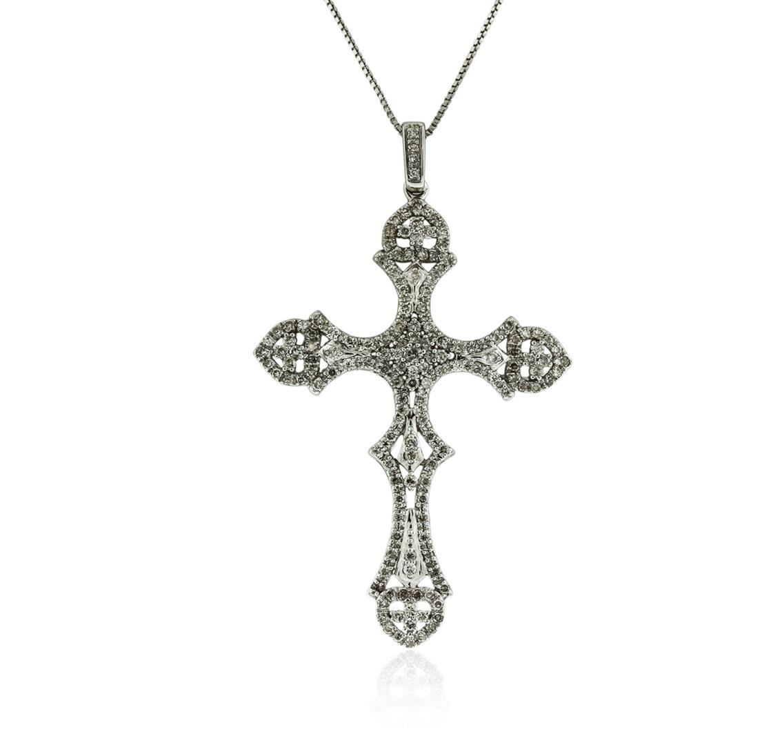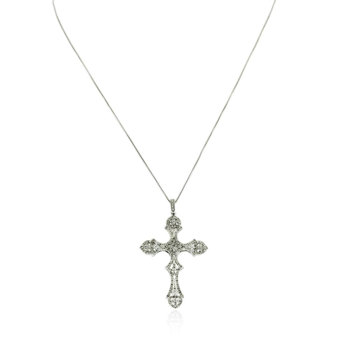 One cross pendant with chain featuring: 14KT white gold weighing 4.40 grams containing diamonds with a total weight of 0.88ct.