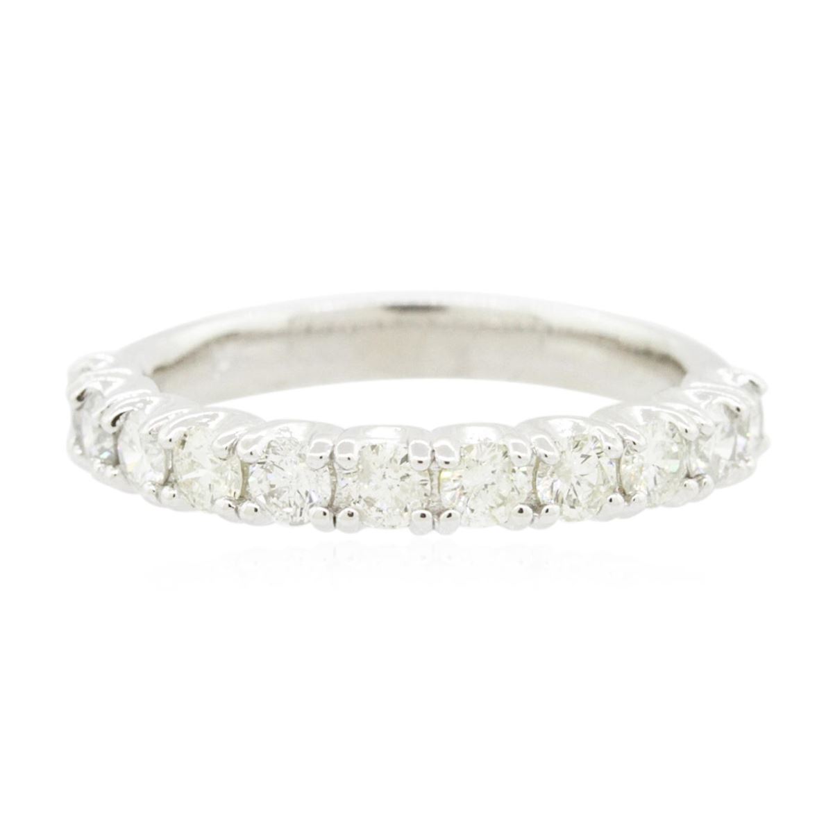 One electronically tested 14KT white gold ladies cast diamond wedding band with a bright polish finish. Identified with markings of "14K". Condition is new. Containing: Eleven prong set round brilliant cut diamonds, measuring 2.80 - 2.80 x 1.68mm (depth est.) approximate total weight of 11 Stones = 0.88ct. Clarity: SI-1 to I-1. Color: I - J, Cut is Good. All diamonds are graded in the mounting, unless otherwise stated. Total Weight of Diamonds 0.88ct. Total Weight of Wedding Band 3.20 grams. GGL Appraised at $2,775.00.
