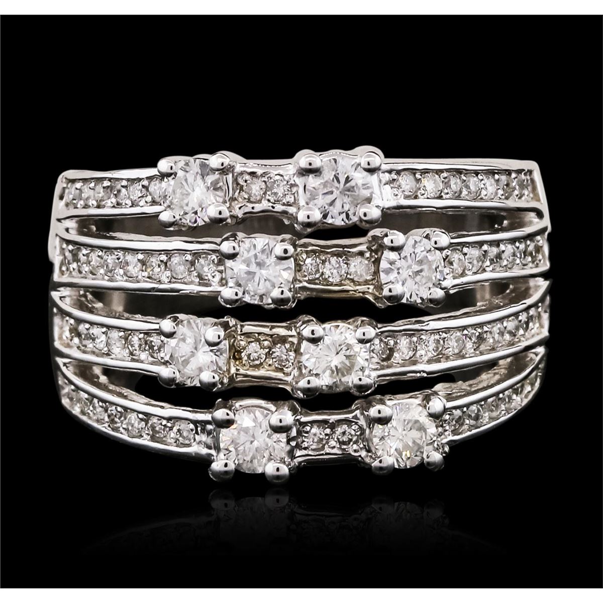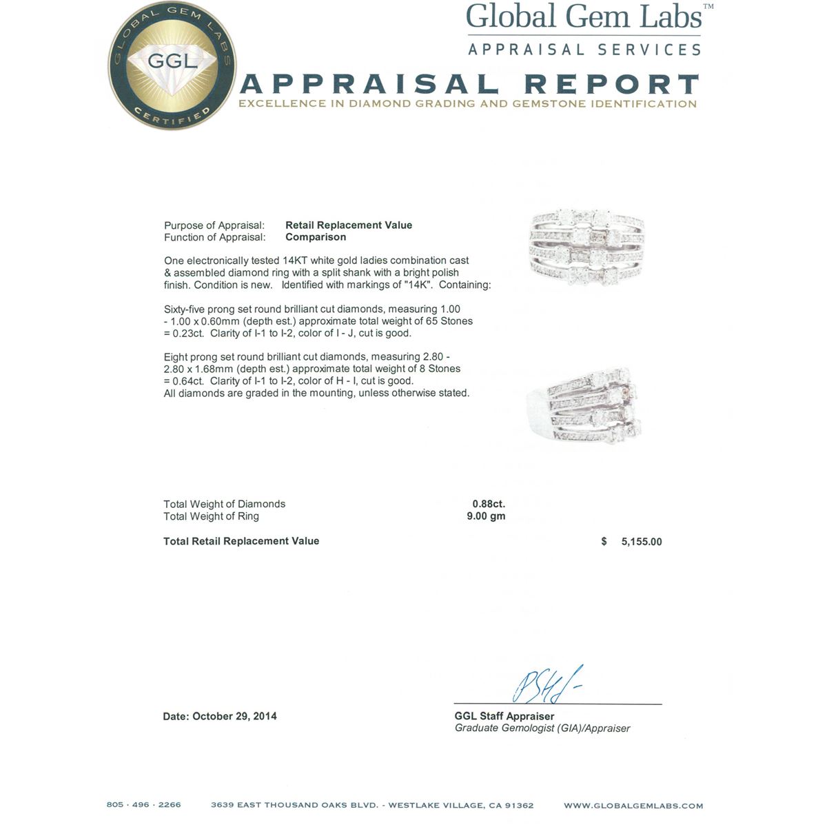 One electronically tested 14KT white gold ladies combination cast & assembled diamond ring with a split shank with a bright polish finish. Identified with markings of 14K. Condition is new. Containing: Sixty-Five prong set round brilliant cut diamonds, measuring 1.00 - 1.00 x 0.60mm (depth est.) approximate total weight of 65 Stones = 0.23ct. Clarity: I-1 to I-2. Color: I - J, Cut is Good. Eight prong set round brilliant cut diamonds, measuring 2.80 - 2.80 x 1.68mm (depth est.) approximate total weight of 8 Stones = 0.64ct. Clarity: I-1 to I-2. Color: H - I, Cut is Good. All diamonds are graded in the mounting, unless otherwise stated. Total Weight of Diamonds 0.88ct. Total Weight of Ring 9.00 grams. GGL Appraised at $5,155.00.