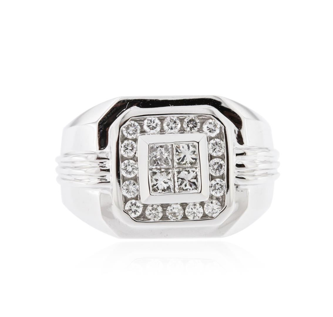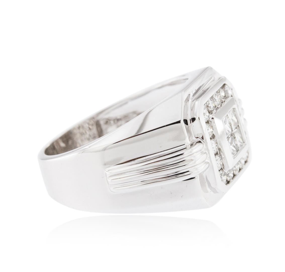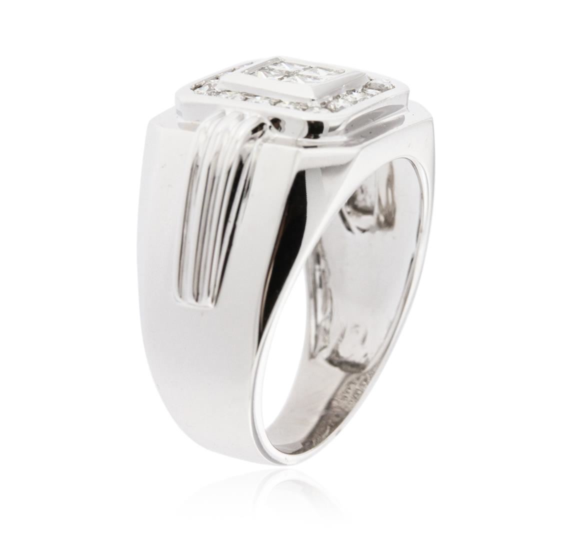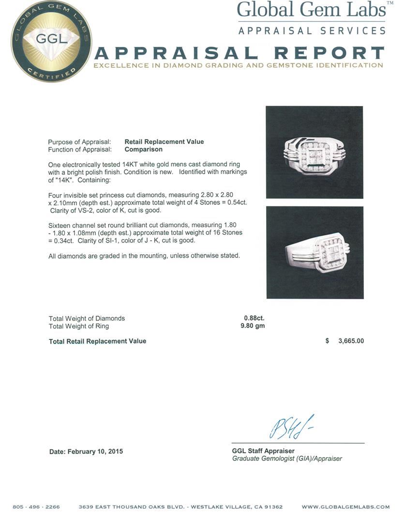 One electronically tested 14KT white gold mens cast diamond ring with a bright polish finish. Identified with markings of "14K". Condition is new. Containing: Four invisible set princess cut diamonds, measuring 2.80 x 2.80 x 2.10mm (depth est.) approximate total weight of 4 Stones = 0.54ct. Clarity: VS-2. Color: K, Cut is Good. Sixteen channel set round brilliant cut diamonds, measuring 1.80 - 1.80 x 1.08mm (depth est.) approximate total weight of 16 Stones = 0.34ct. Clarity: SI-1. Color: J - K, Cut is Good. All diamonds are graded in the mounting, unless otherwise stated. Total Weight of Diamonds 0.88ct. Total Weight of Ring 9.80 grams. GGL Appraised at $3,665.00.