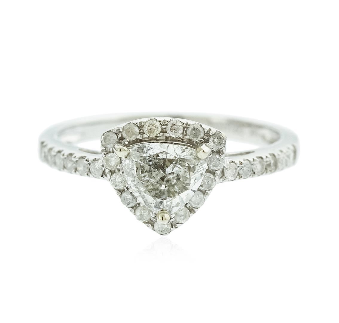 One electronically tested 14KT white gold ladies cast diamond unity ring with a bright polish finish. The featured diamond is set within a diamond bezel supported by diamond set shoulders, completed by a two millimeter wide band. Trademark is Orianne. Identified with markings of "14K". Condition is new, good workmanship. Containing: One prong set triangle brilliant cut diamond, measuring 6.50 x 5.60 x 2.90mm (depth est.) approximate weight of 0.61ct. Graded in the setting. Clarity: I-1. Color: J. Depth 51.8%. Table 69.6%. Twenty-Seven prong set round brilliant cut diamonds, measuring 1.40 - 1.30 x 0.81mm (depth est.) approximate. Total Weight of 27 Stones = 0.27ct. Graded in the setting. Clarity: I-1 to I-2. Color: G - I. Total Weight of Diamonds 0.88ct. Total Weight of Ring 2.39gm. AIG Appraised at $4,015.00.