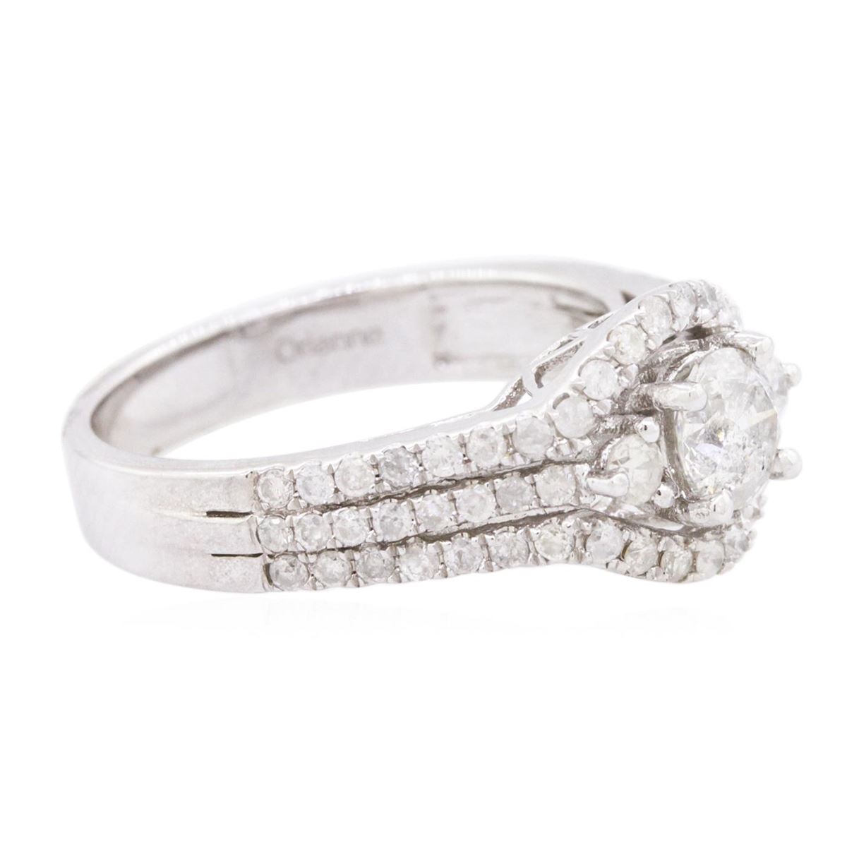 One electronically tested 14KT white gold ladies combination cast & assembled engagement ring with a flat shank with a bright polish finish. Identified with markings of "14K". Condition is new. Containing: One prong set round brilliant cut diamond, measuring 5.10 - 5.10 x 3.06mm (depth est.) approximate weight of 0.49ct. Clarity: I-2. Color: I, Cut is Good. Sixty-Two prong set round brilliant cut diamonds, measuring 1.20 - 1.20 x 0.72mm (depth est.) approximate total weight of 62 Stones = 0.39ct. Clarity: I-1 to I-3. Color: I - J, Cut is Good. All diamonds are graded in the mounting, unless otherwise stated. Total Weight of Diamonds 0.88ct. Total Weight of Ring 4.80 grams. GGL Appraised at $4,300.00.