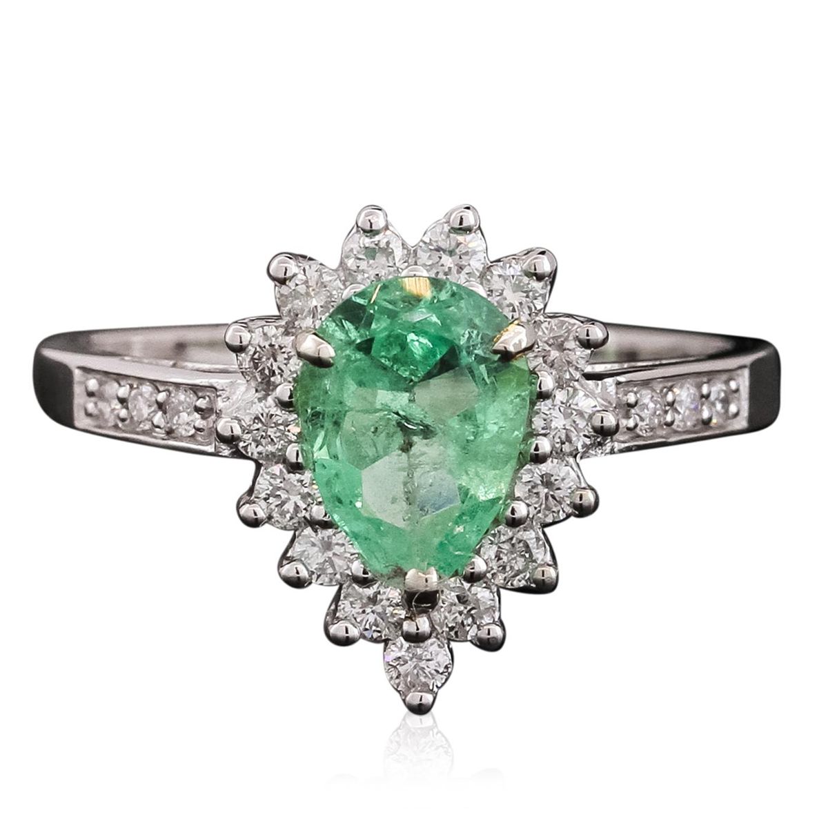 One electronically tested 14KT white gold ladies combination cast & assembled emerald and diamond ring with a flat shank with a bright polish finish. Identified with markings of "14K". Condition is new. Containing: One prong set pear modified brilliant cut natural emerald, measuring 7.75 x 5.82 x 3.60mm, approximate weight of 0.88ct., clarity is slightly included, type III, medium light, very slightly grayish, bluish green color, (GIA bG 4/3), cut is good. Twenty-One prong set round brilliant cut diamonds, measuring 1.60 - 1.10 x 0.81mm (depth est.) approximate total weight of 21 Stones = 0.19ct. Clarity: I-1 to I-2. Color: I - J, Cut is Good. Colored gemstones are presumed to have been subjected to commonly used enhancement processes. All diamonds and colored gemstones are graded in the mounting, unless otherwise stated total weight of Colored Stones 0.88ct. Total Weight of Diamonds 0.19ct. Total Weight of Ring 2.70 grams. GGL Appraised at $2,930.00.