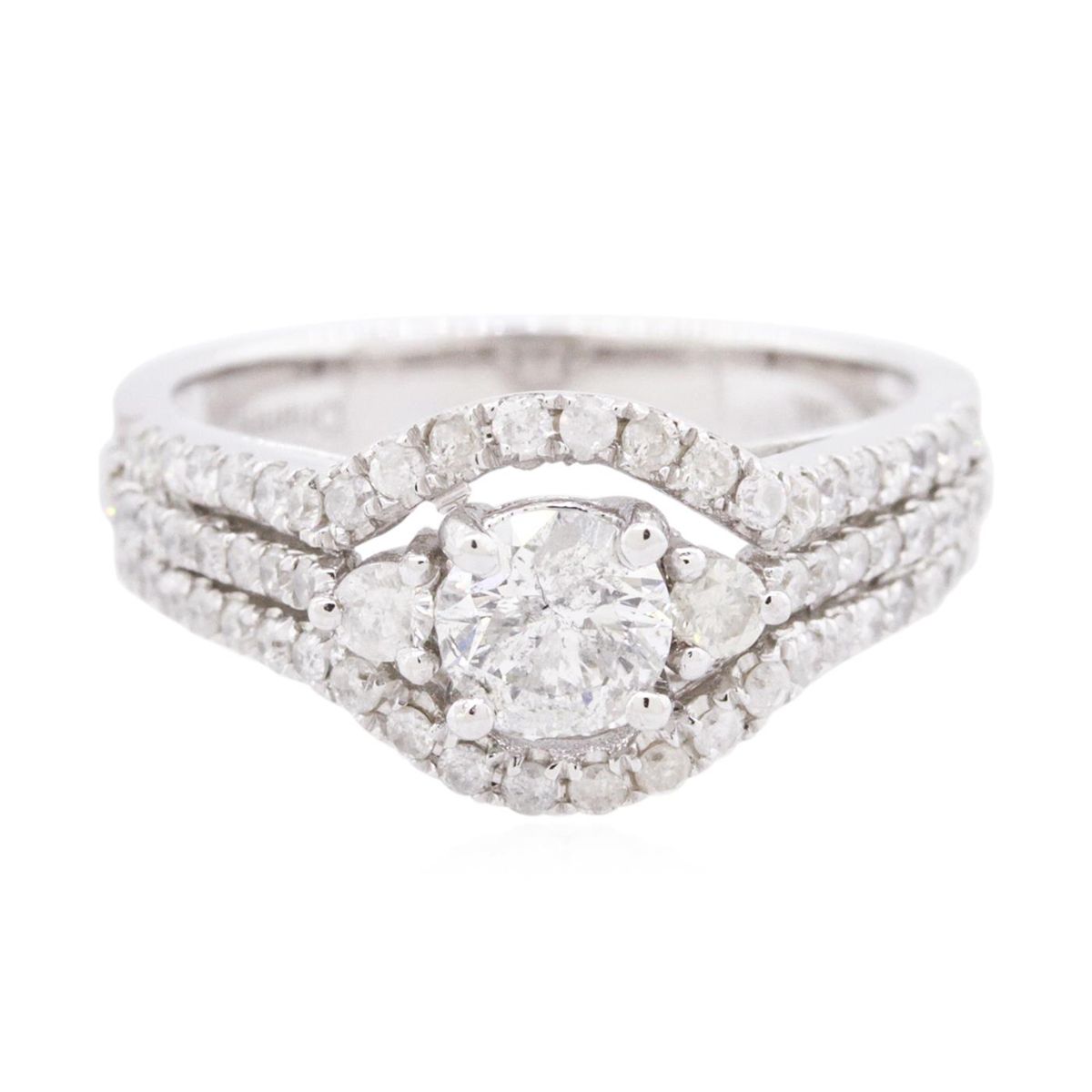 One electronically tested 14KT white gold ladies combination cast & assembled engagement ring with a flat shank with a bright polish finish. Identified with markings of "14K". Condition is new. Containing: One prong set round brilliant cut diamond, measuring 5.10 - 5.10 x 3.06mm (depth est.) approximate weight of 0.49ct. Clarity: I-2. Color: I, Cut is Good. Sixty-Two prong set round brilliant cut diamonds, measuring 1.20 - 1.20 x 0.72mm (depth est.) approximate total weight of 62 Stones = 0.39ct. Clarity: I-1 to I-3. Color: I - J, Cut is Good. All diamonds are graded in the mounting, unless otherwise stated. Total Weight of Diamonds 0.88ct. Total Weight of Ring 4.80 grams. GGL Appraised at $4,300.00.