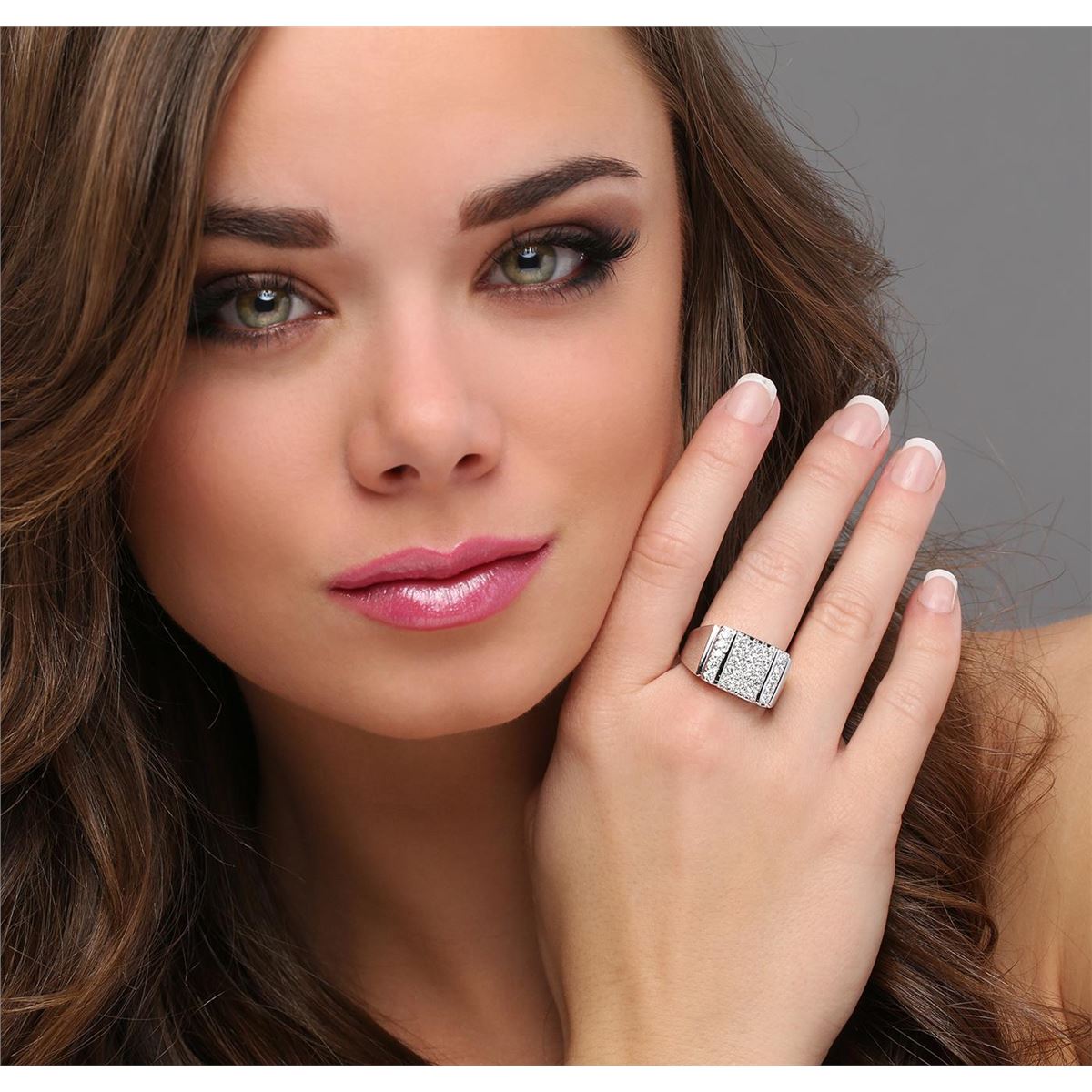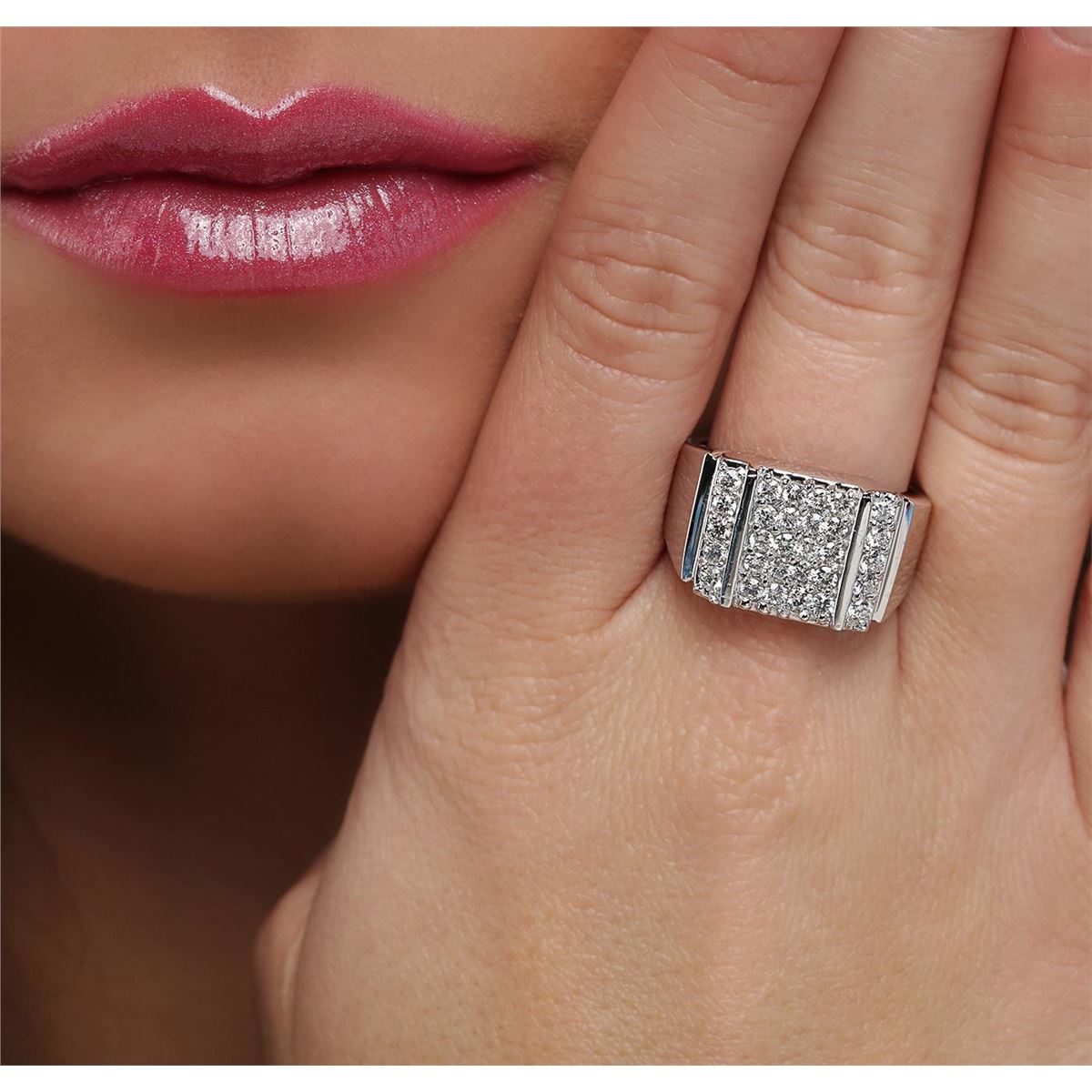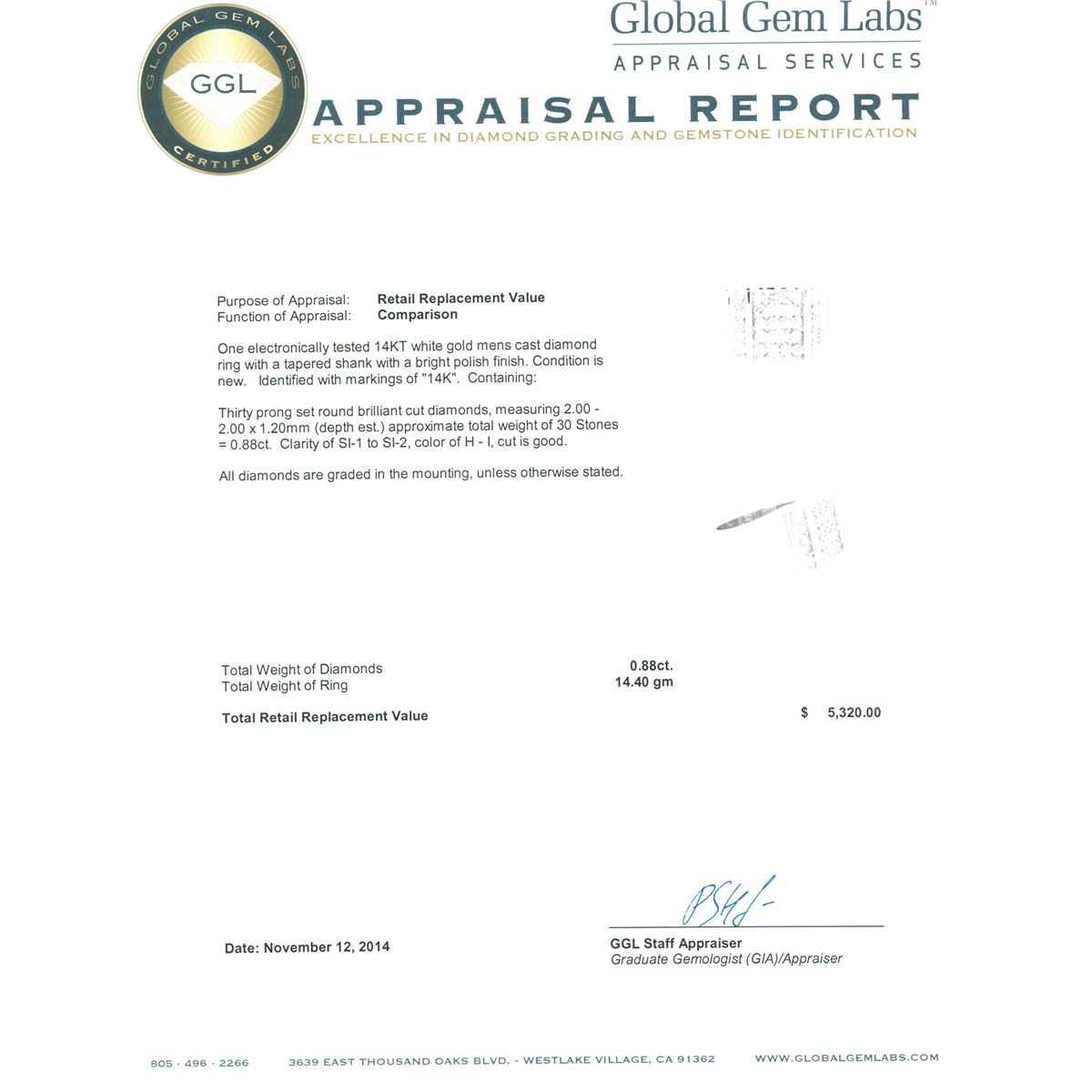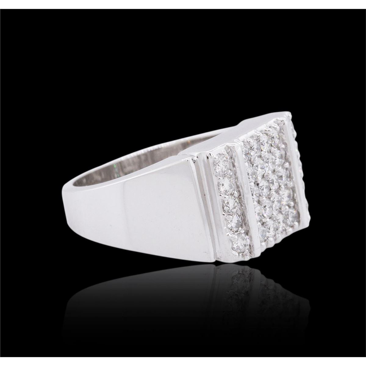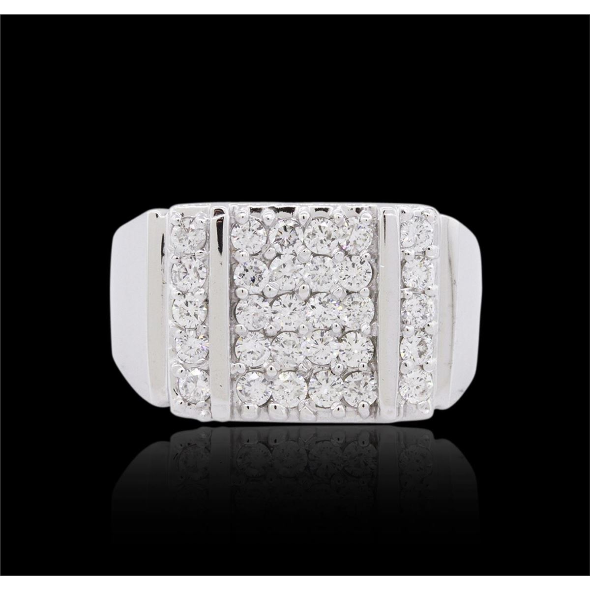 One electronically tested 14KT white gold mens cast diamond ring with a tapered shank with a bright polish finish. Identified with markings of "14K". Condition is new. Containing: Thirty prong set round brilliant cut diamonds, measuring 2.00 - 2.00 x 1.20mm (depth est.) approximate total weight of 30 Stones = 0.88ct. Clarity: SI-1 to SI-2. Color: H - I, Cut is Good. All diamonds are graded in the mounting, unless otherwise stated. Total Weight of Diamonds 0.88ct. Total Weight of Ring 14.40 grams. GGL Appraised at $5,320.00.