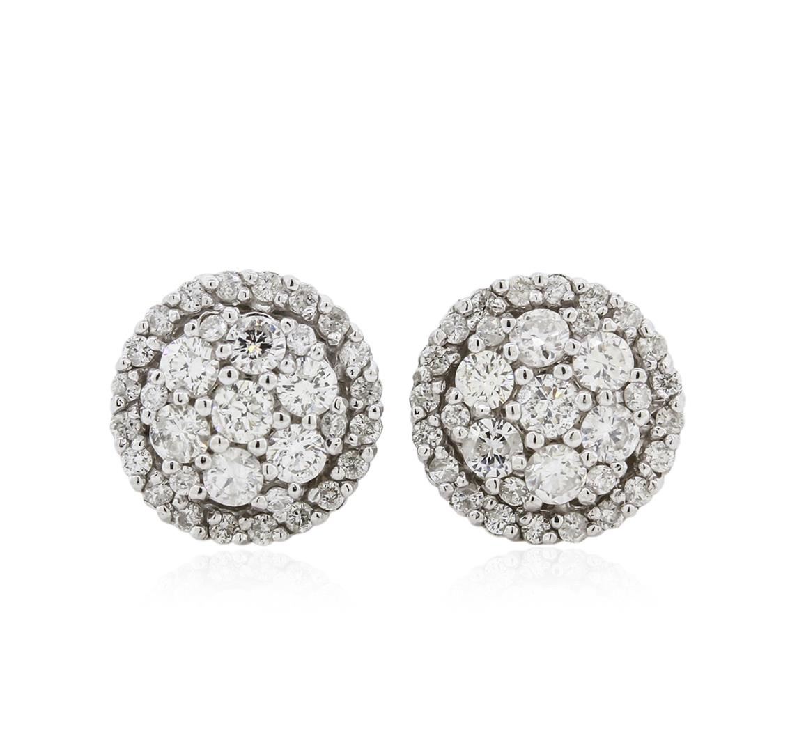 One pair electronically tested 14KT white gold ladies cast diamond earrings with friction posts with a bright polish finish. Identified with markings of "585". Condition is new. Containing: Fifty-two prong set round brilliant cut diamonds, measuring 1.10 - 1.10 x 0.66mm (depth est.) approximate total weight of 52 Stones = 0.30ct. Clarity: SI-2 to I-2. Color: G - H, Cut is Good. Fourteen prong set round brilliant cut diamonds, measuring 2.00 - 2.00 x 1.20mm (depth est.) approximate total weight of 14 Stones = 0.60ct. Clarity of SI-1 to S1-2, color of H - I, cut is good. All diamonds are graded in the mounting, unless otherwise stated. Total Weight of Diamonds 0.90ct. Total Weight of Earrings 3.30 grams. GGL Appraised at $2,340.00.