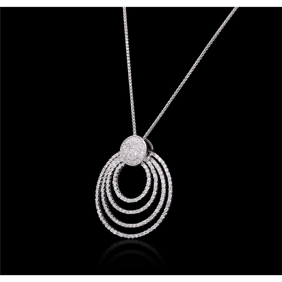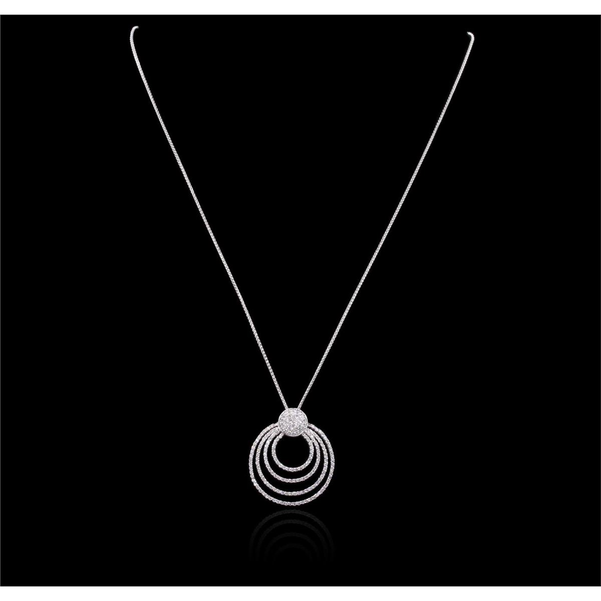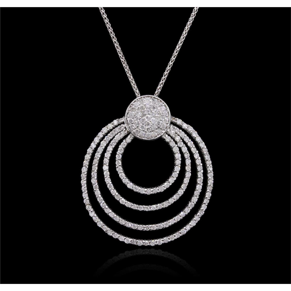One electronically tested 14KT white gold ladies cast & assembled diamond pendant with chain. The pendant features four diamond set draping ribbons, completed by a diamond set bail. The pendant is supported by an eighteen inch length 14KT white gold designer style chain, terminating in a lobster claw clasp. Bright polish finish. Identified with markings of "K14". Condition is new, good workmanship. Containing: One Hundred Eighty-Nine prong set round brilliant cut diamonds, measuring 1.10 - 1.00 x 0.63mm (depth est.) approximate total weight of 189 Stones = 0.90ct. Graded in the setting. Clarity: I-1 to I-2. Color: G - J. Total Weight of Diamonds 0.90ct. Total Weight of Pendant With Chain 7.44 grams. AIG Appraised at $4,440.00.