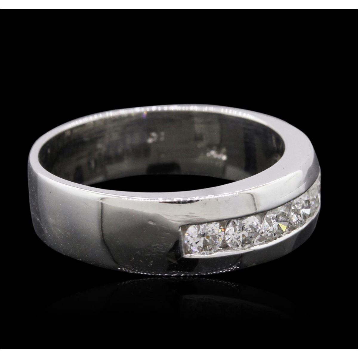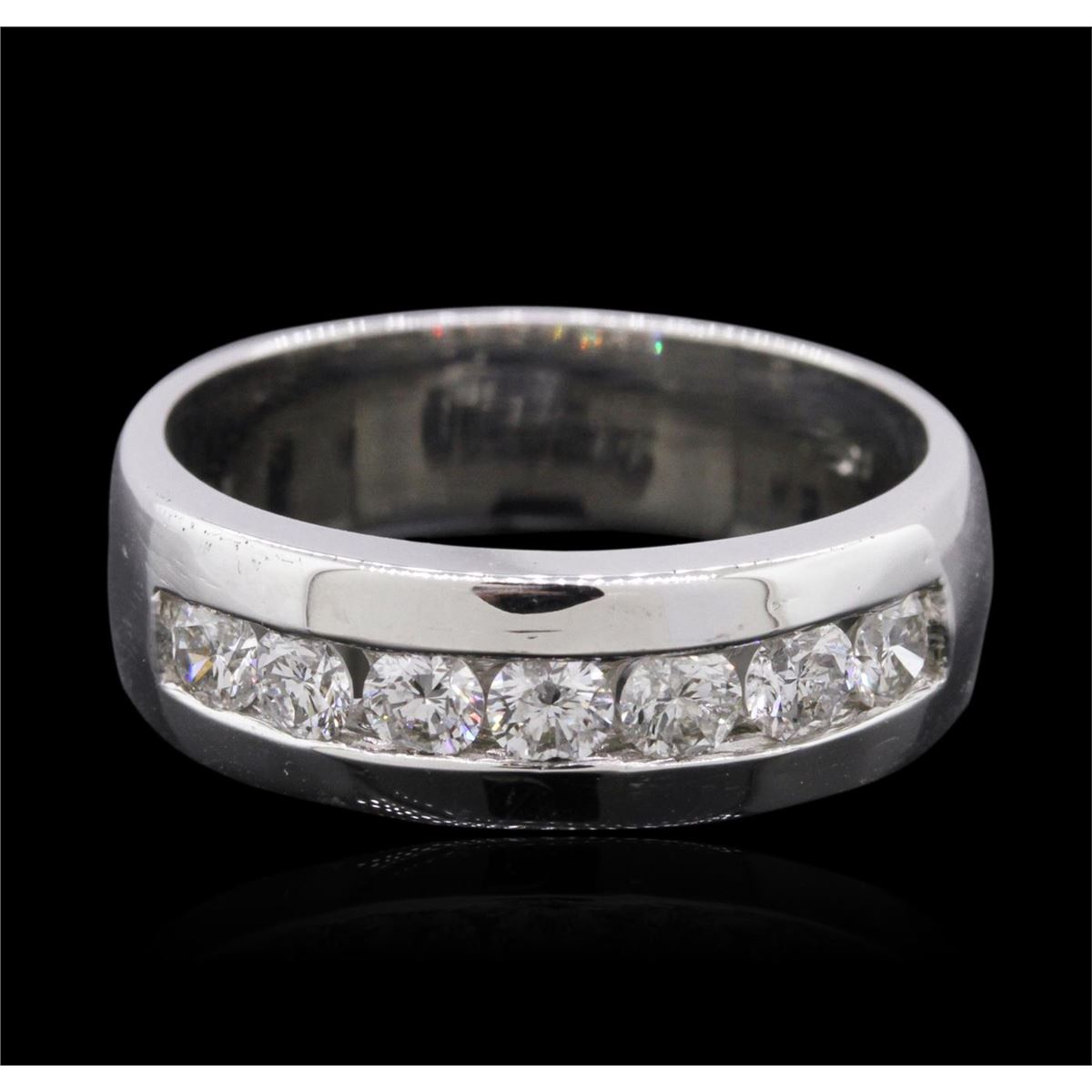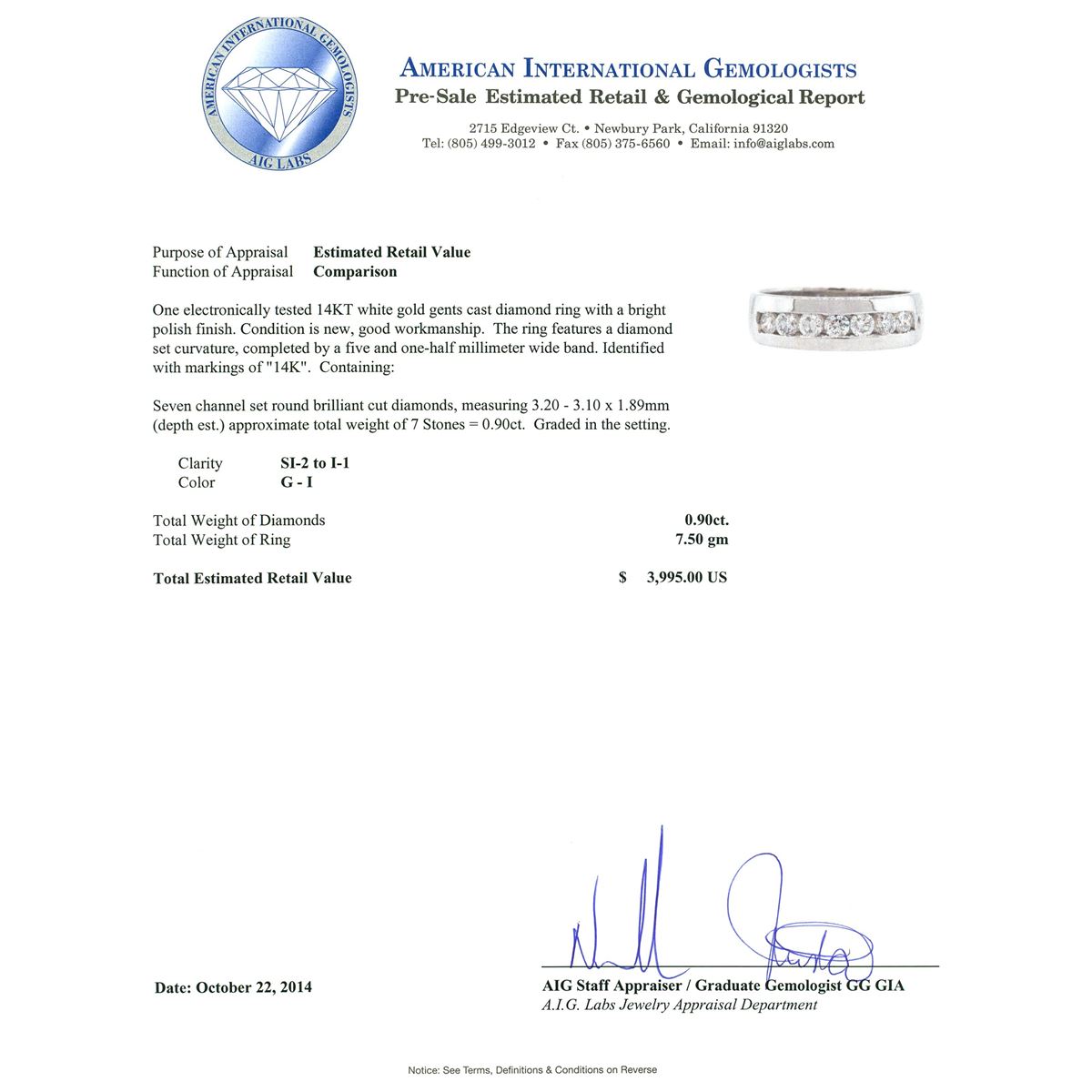 One electronically tested 14KT white gold gents cast diamond ring with a bright polish finish. The ring features a diamond set curvature, completed by a five and one-half millimeter wide band. Identified with markings of 14K. Condition is new, good workmanship. Containing: Seven channel set round brilliant cut diamonds, measuring 3.20 - 3.10 x 1.89mm (depth est.) approximate total weight of 7 Stones = 0.90ct. Graded in the setting. Clarity: SI-2 to I-1. Color: G - I. Total Weight of Diamonds 0.90ct. Total Weight of Ring 7.50 grams. AIG Appraised at $3,995.00.
