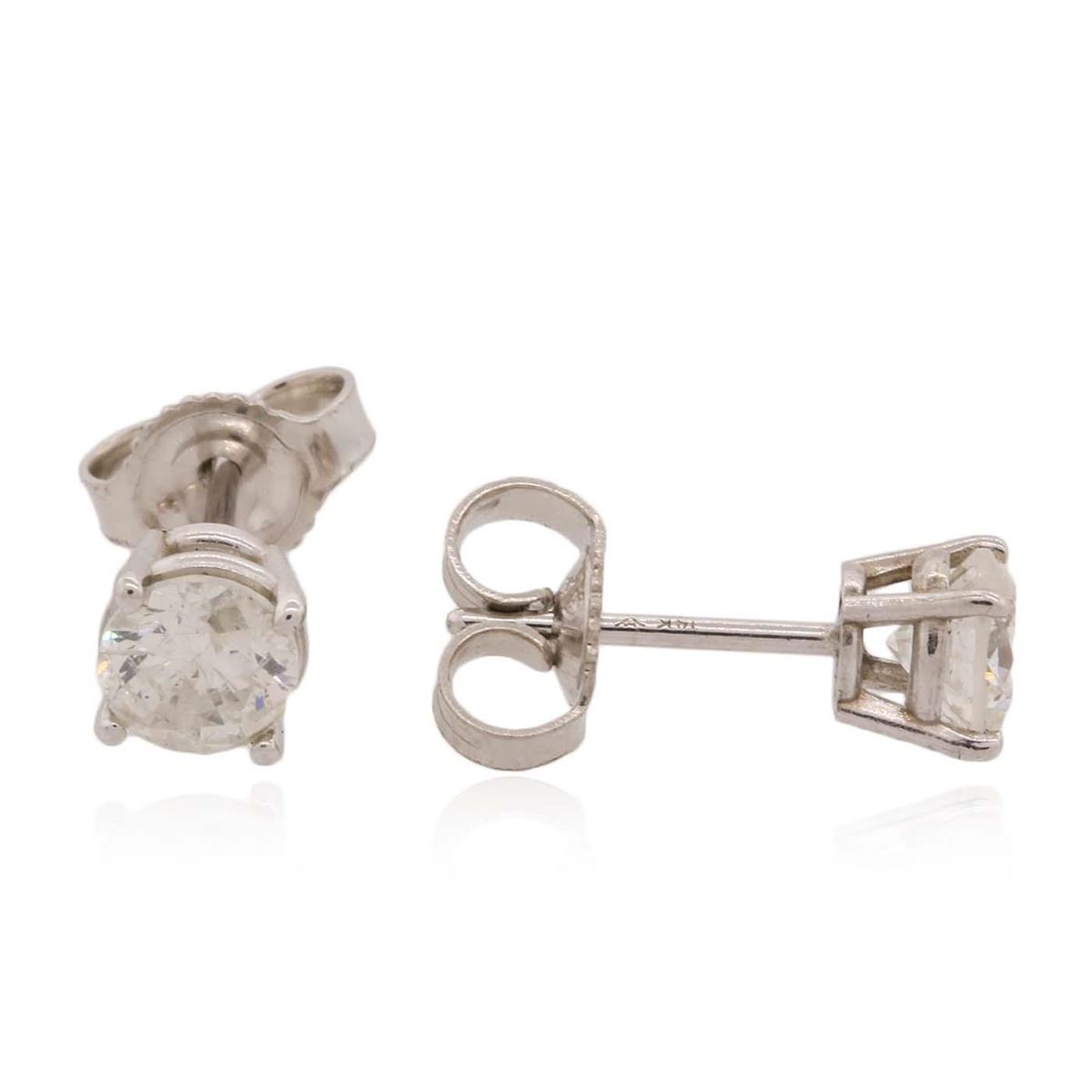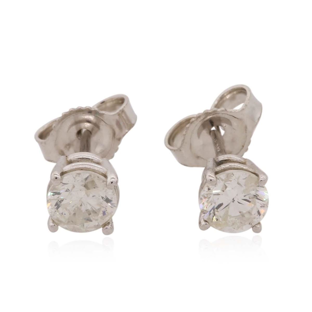One pair electronically tested 14KT white gold cast & assembled diamond solitaire earrings with standard backs. Condition is new, good workmanship. Containing: One prong set round brilliant cut diamond, measuring 4.80 - 4.80 x 3.06mm (depth est.), 7.00% GTCF approximate weight of 0.46ct. Graded in the setting. Clarity: I-2. Color: 63.8%. Table 60.0%. One prong set round brilliant cut diamond, measuring 4.78 - 4.70 x 3.04mm (depth est.), 5.00% GTCF approximate weight of 0.44ct. Graded in the setting. Clarity: I-2. Color: 64.1%. Table 62.5%. Total Weight of Diamonds 0.90ct. Total Weight of Earrings 0.99 grams. AIG Appraised at $2,240.00.