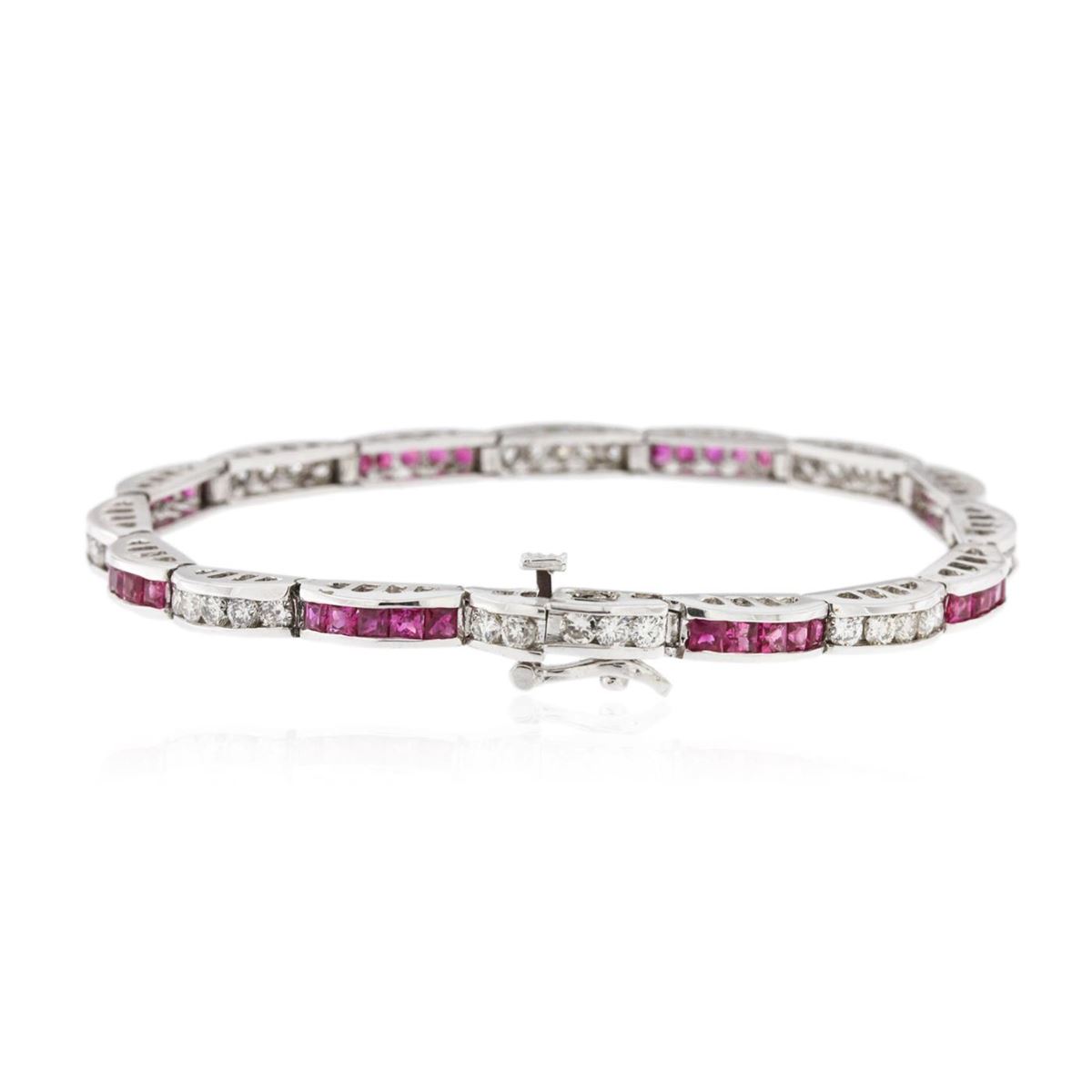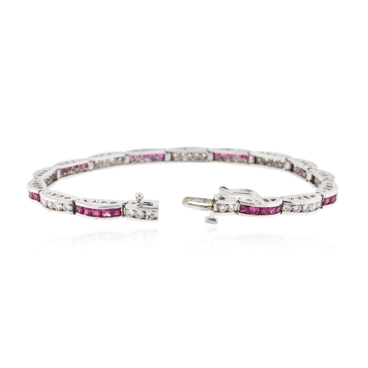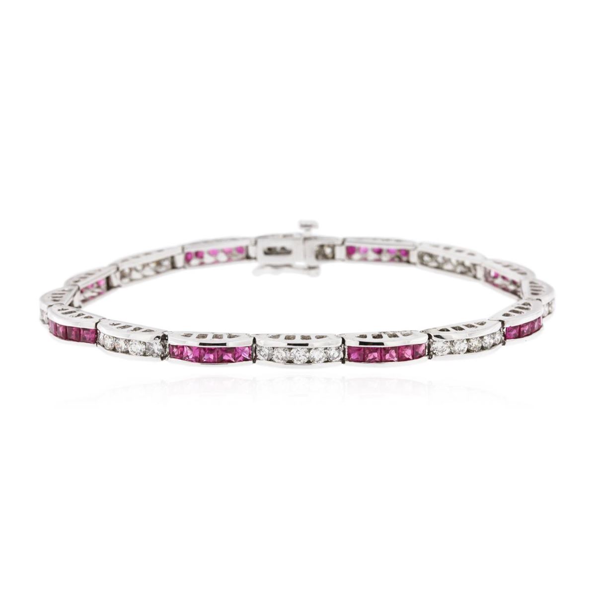 One electronically tested 14KT white gold ladies cast & assembled ruby and diamond bracelet with a bright polish finish. Condition is new, good workmanship. The seven inch length bracelet features a ribbon of ruby and diamond set links, terminating in a concealed clasp with safety. Identified with markings of "14K". Containing: Forty channel set princess cut natural rubies, measuring 2.20 x 2.20 x 1.43mm, approximate. Total Weight of 0.90ct., clarity is slightly included, type II, medium dark, moderately strong, slightly purplish red color, (GIA slpR 6/4), cut is good. Transmitting light with a minimum of distortion, transparent. Naturally occurring internal & external characteristics are present. Indications of laboratory high temperature heat treatment, with flux residue. Measurements & the color grade are an average for the group. Graded in the setting. Ruby has a low tolerance to rhodium plating, repolishing the surface, & ultrasonic cleaning. Forty channel set round brilliant cut diamonds, measuring 2.20 - 2.20 x 1.32mm (depth est.) approximate. Total Weight of 40 Stones = 1.67ct. Graded in the setting. Clarity: SI-2 to I-1. Color: H - J. Total Weight of Colored Stones 0.90ct. Total Weight of Diamonds 1.67ct. Total Weight of Bracelet 13.60 grams. AIG Appraised at $7,900.00.