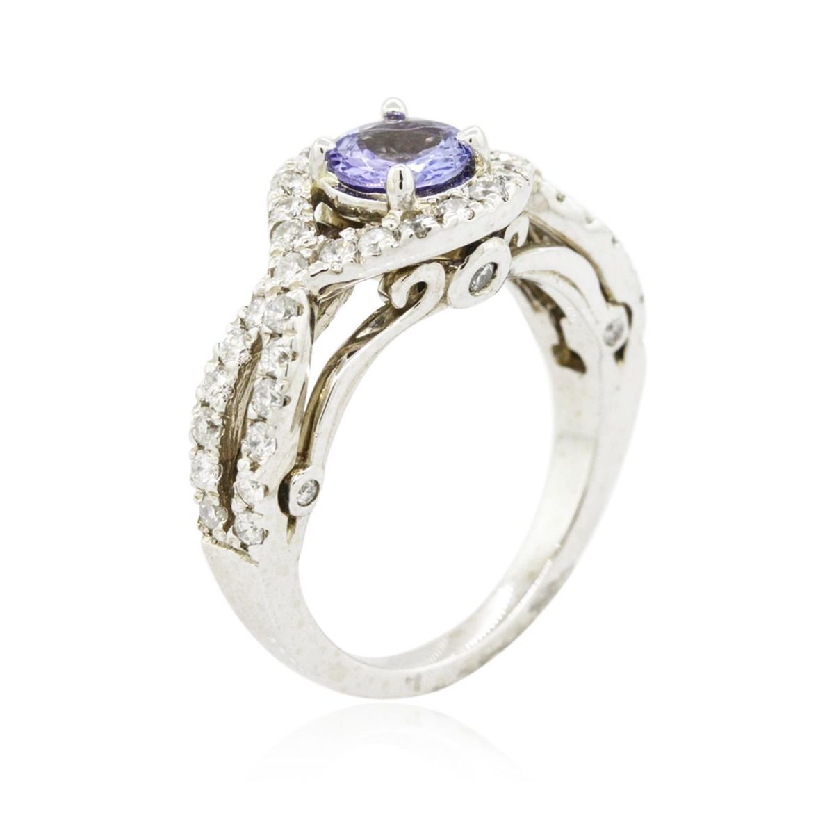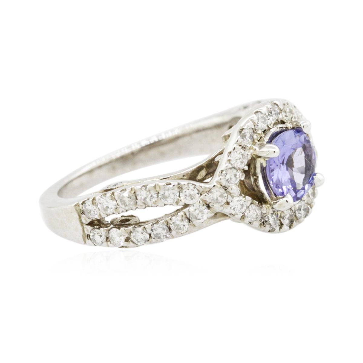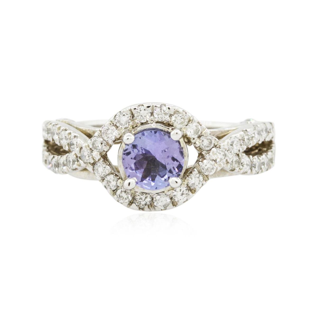 One electronically tested 14KT white gold ladies cast tanzanite and diamond ring with a bright polish finish. Identified with markings of "14K". Condition is new. Containing: One prong set round modified brilliant cut natural tanzanite, measuring 5.90 - 5.90 x 3.84 mm, approximate weight of 0.90ct., clarity is eye clean, type I, light, very slightly grayish, violet color, (GIA V 3/3), cut is good. Forty-Two prong set round brilliant cut diamonds, measuring 1.40 - 1.40 x 0.84mm (depth est.) approximate total weight of 42 Stones = 0.42ct. Clarity: SI-2 to I-1. Color: I - J, Cut is Good. Colored gemstones are presumed to have been subjected to commonly used enhancement processes. All diamonds and colored gemstones are graded in the mounting, unless otherwise stated. Total Weight of Colored Stones 0.90ct. Total Weight of Diamonds 0.42ct. Total Weight of Ring 6.00 grams. GGL Appraised at $3,270.00.