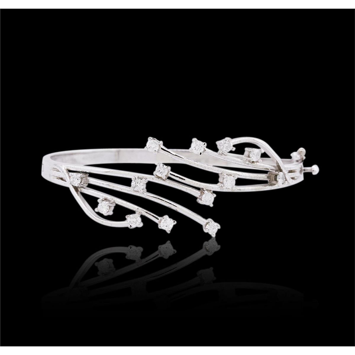 One electronically tested 14KT white gold ladies cast diamond bracelet with a hidden box clasp with safety closer with a bright polish finish. The inside diameter is 2-1/4". Identified with markings of "14K". Condition is new. Containing: Fourteen prong set round brilliant cut diamonds, measuring 2.60 - 2.60 x 1.56mm (depth est.) approximate total weight of 14 Stones = 0.90ct. Clarity: SI-2 to I-2. Color: H - I, Cut is Good. All diamonds are graded in the mounting, unless otherwise stated. Total Weight of Diamonds 0.90ct. Total Weight of Bracelet 20.10 grams. GGL Appraised at $6,380.00.
