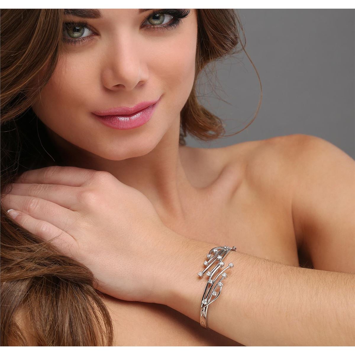 One electronically tested 14KT white gold ladies cast diamond bracelet with a hidden box clasp with safety closer with a bright polish finish. The inside diameter is 2-1/4". Identified with markings of "14K". Condition is new. Containing: Fourteen prong set round brilliant cut diamonds, measuring 2.60 - 2.60 x 1.56mm (depth est.) approximate total weight of 14 Stones = 0.90ct. Clarity: SI-2 to I-2. Color: H - I, Cut is Good. All diamonds are graded in the mounting, unless otherwise stated. Total Weight of Diamonds 0.90ct. Total Weight of Bracelet 20.10 grams. GGL Appraised at $6,380.00.