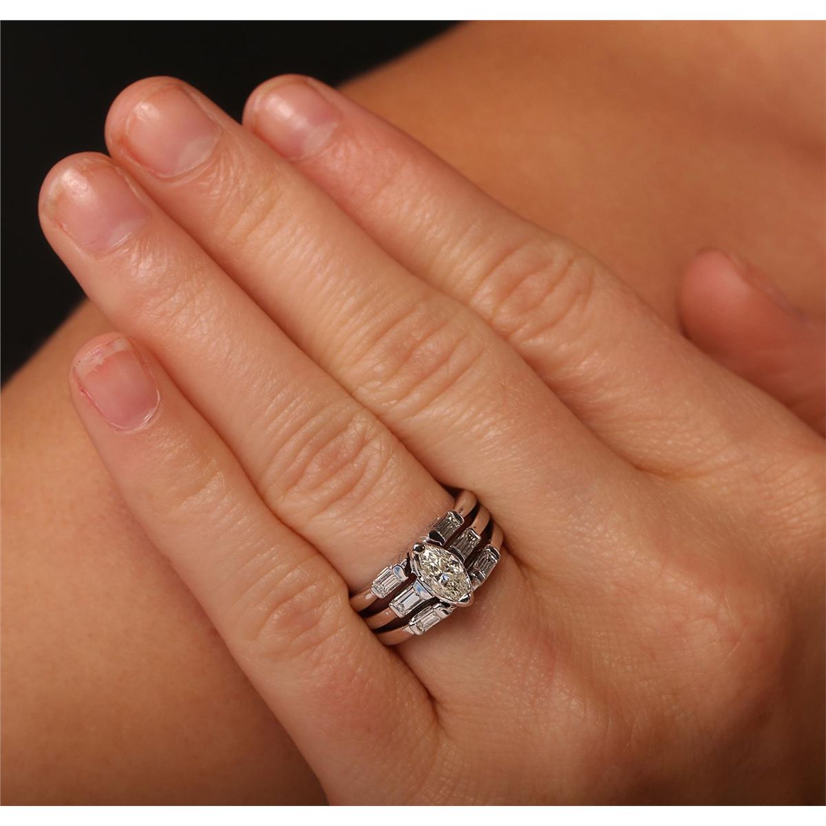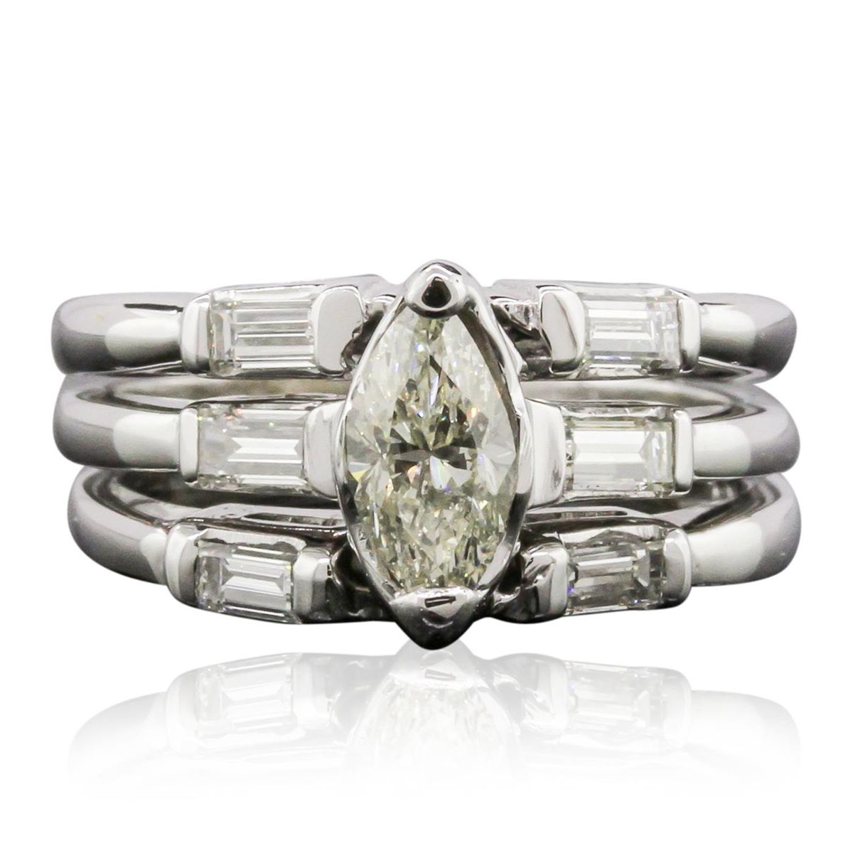 One electronically tested 14KT white gold Ladies combination cast & assembled engagement ring with a bright polish finish. Identified with markings of "14K". Condition is very good. Containing: One prong set marquise shaped cut diamond, measuring 8.00 x 4.50 x 2.84mm (depth est.) approximate weight of 0.53ct. Clarity: SI-2. Color: L, Cut is Good. Six prong set baguette cut diamonds, measuring 3.50 x 1.50 x 1.28mm (depth est.) approximate. Total Weight of 6 Stones = 0.37ct. Clarity: VS-2. Color: H - I, Cut is Good. Total Weight of Diamonds 0.90ct. Total Weight of Ring 7.00gm. GGL Appraised at $5,395.00.