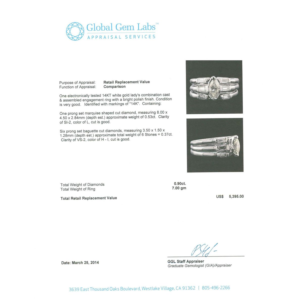 One electronically tested 14KT white gold Ladies combination cast & assembled engagement ring with a bright polish finish. Identified with markings of "14K". Condition is very good. Containing: One prong set marquise shaped cut diamond, measuring 8.00 x 4.50 x 2.84mm (depth est.) approximate weight of 0.53ct. Clarity: SI-2. Color: L, Cut is Good. Six prong set baguette cut diamonds, measuring 3.50 x 1.50 x 1.28mm (depth est.) approximate. Total Weight of 6 Stones = 0.37ct. Clarity: VS-2. Color: H - I, Cut is Good. Total Weight of Diamonds 0.90ct. Total Weight of Ring 7.00gm. GGL Appraised at $5,395.00.