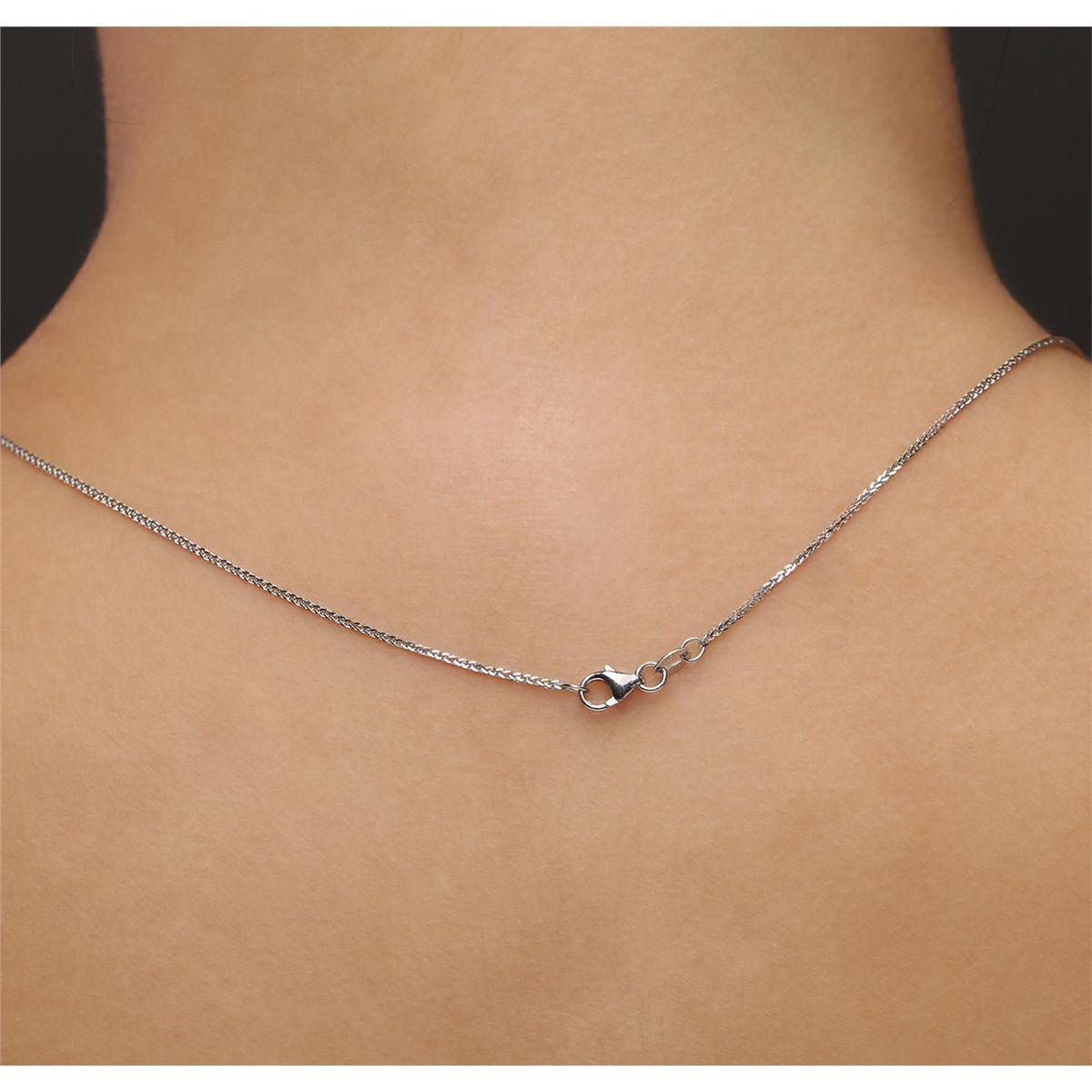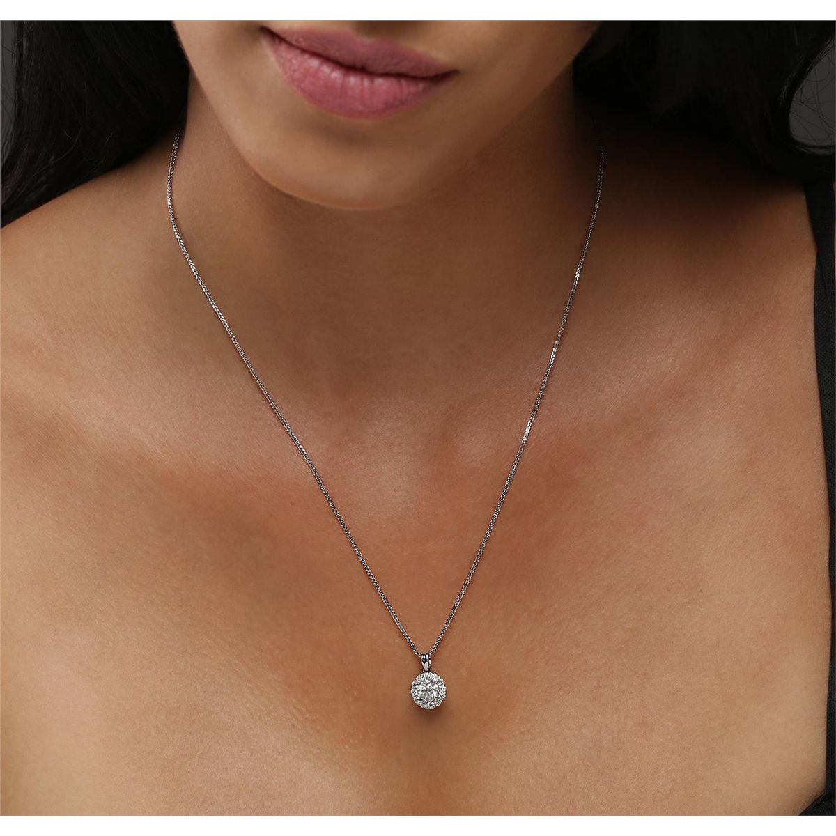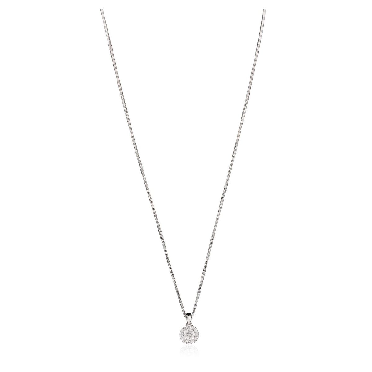 One electronically tested 14KT white gold ladies combination cast & assembled diamond pendant & chain 18.0" long, medium fancy cable with a lobster claw clasp with a bright polish finish. Identified with markings of "14K". Condition is new. Containing: One prong set round brilliant cut diamond, measuring 5.46 - 5.45 x 3.55mm (depth est.) approximate weight of 0.64ct. Clarity: I-2. Color: J, Cut is Good. Twelve prong set round brilliant cut diamonds, measuring 1.80 - 1.80 x 1.08mm (depth est.) approximate total weight of 12 Stones = 0.26ct. Clarity: SI-2 to I-2. Color: H - J, Cut is Good. All diamonds are graded in the mounting, unless otherwise stated. Total Weight of Diamonds 0.90ct. Total Weight of Pendant & Chain 2.70 grams. GGL Appraised at $3,890.00.