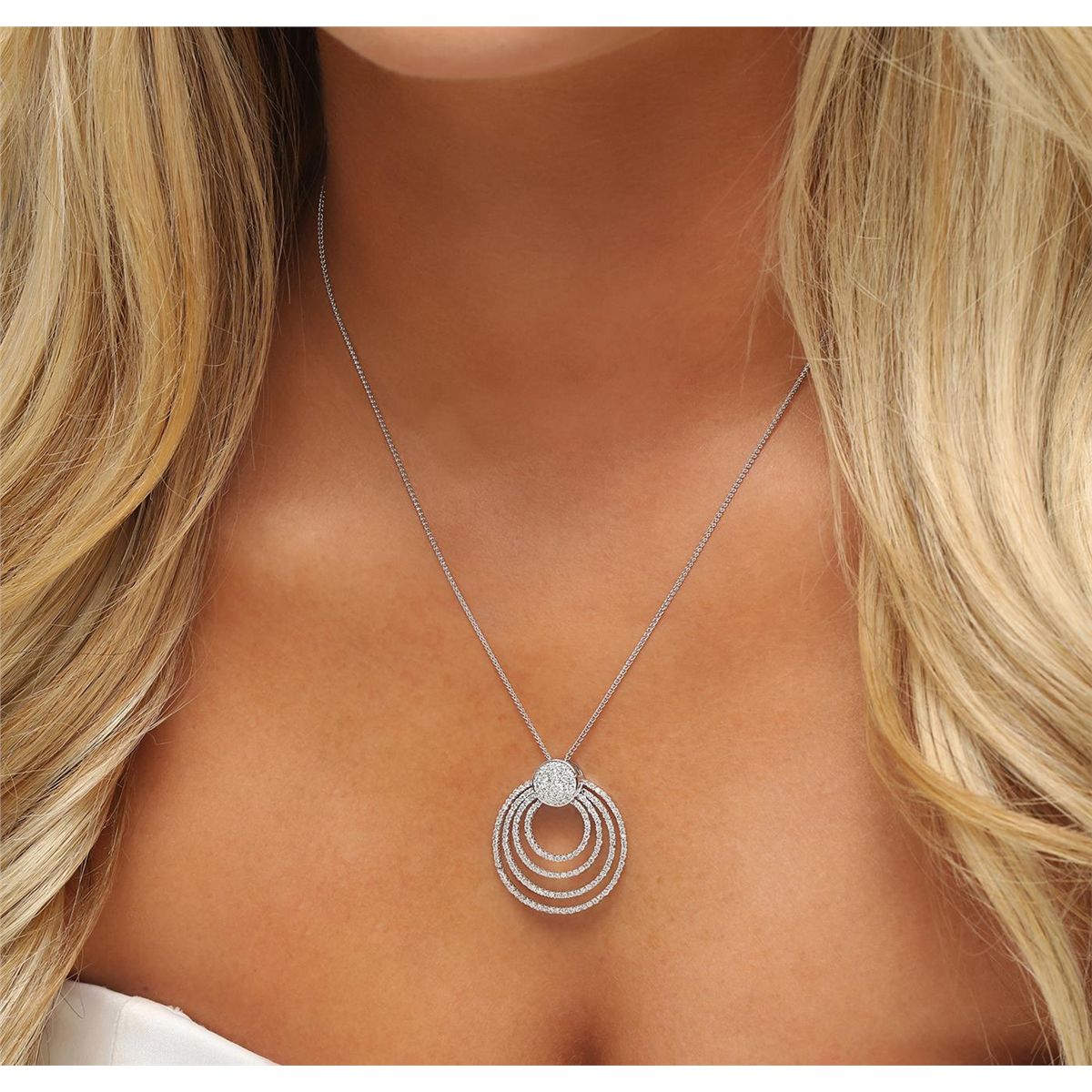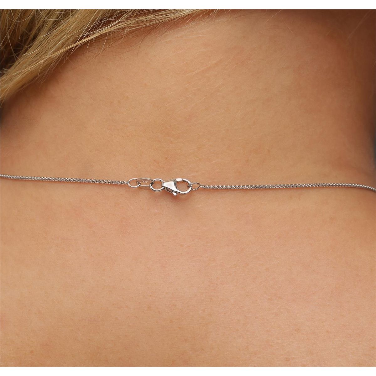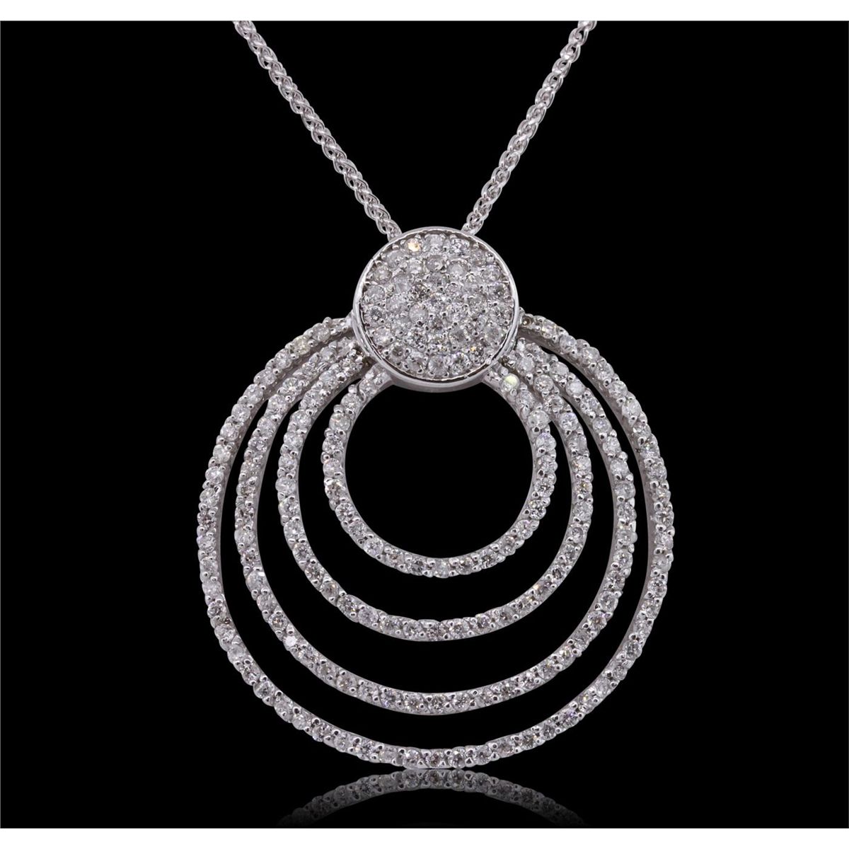 One electronically tested 14KT white gold ladies cast & assembled diamond pendant with chain. The pendant features four diamond set draping ribbons, completed by a diamond set bail. The pendant is supported by an eighteen inch length 14KT white gold designer style chain, terminating in a lobster claw clasp. Bright polish finish. Identified with markings of "K14". Condition is new, good workmanship. Containing: One Hundred Eighty-Nine prong set round brilliant cut diamonds, measuring 1.10 - 1.00 x 0.63mm (depth est.) approximate total weight of 189 Stones = 0.90ct. Graded in the setting. Clarity: I-1 to I-2. Color: G - J. Total Weight of Diamonds 0.90ct. Total Weight of Pendant With Chain 7.44 grams. AIG Appraised at $4,440.00.