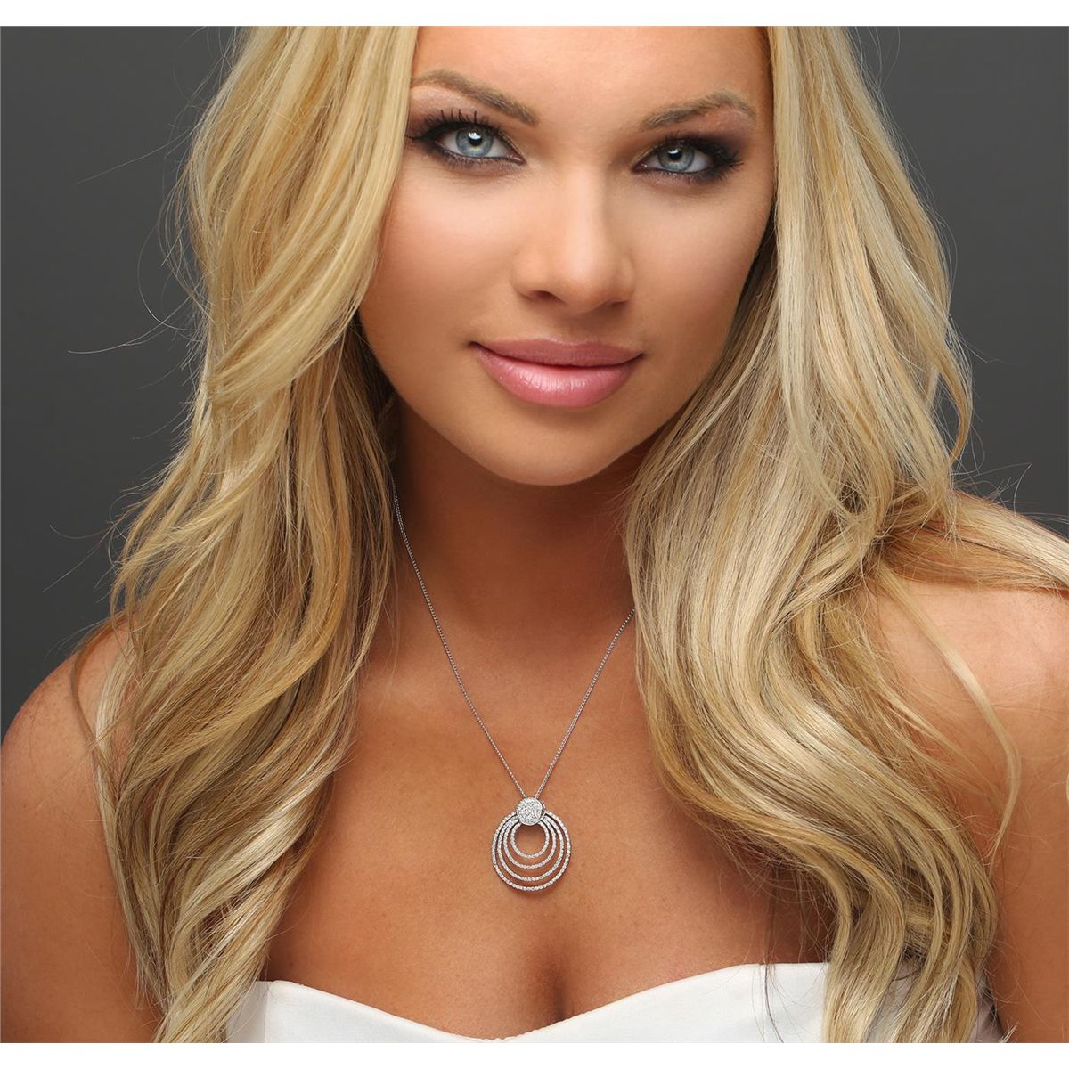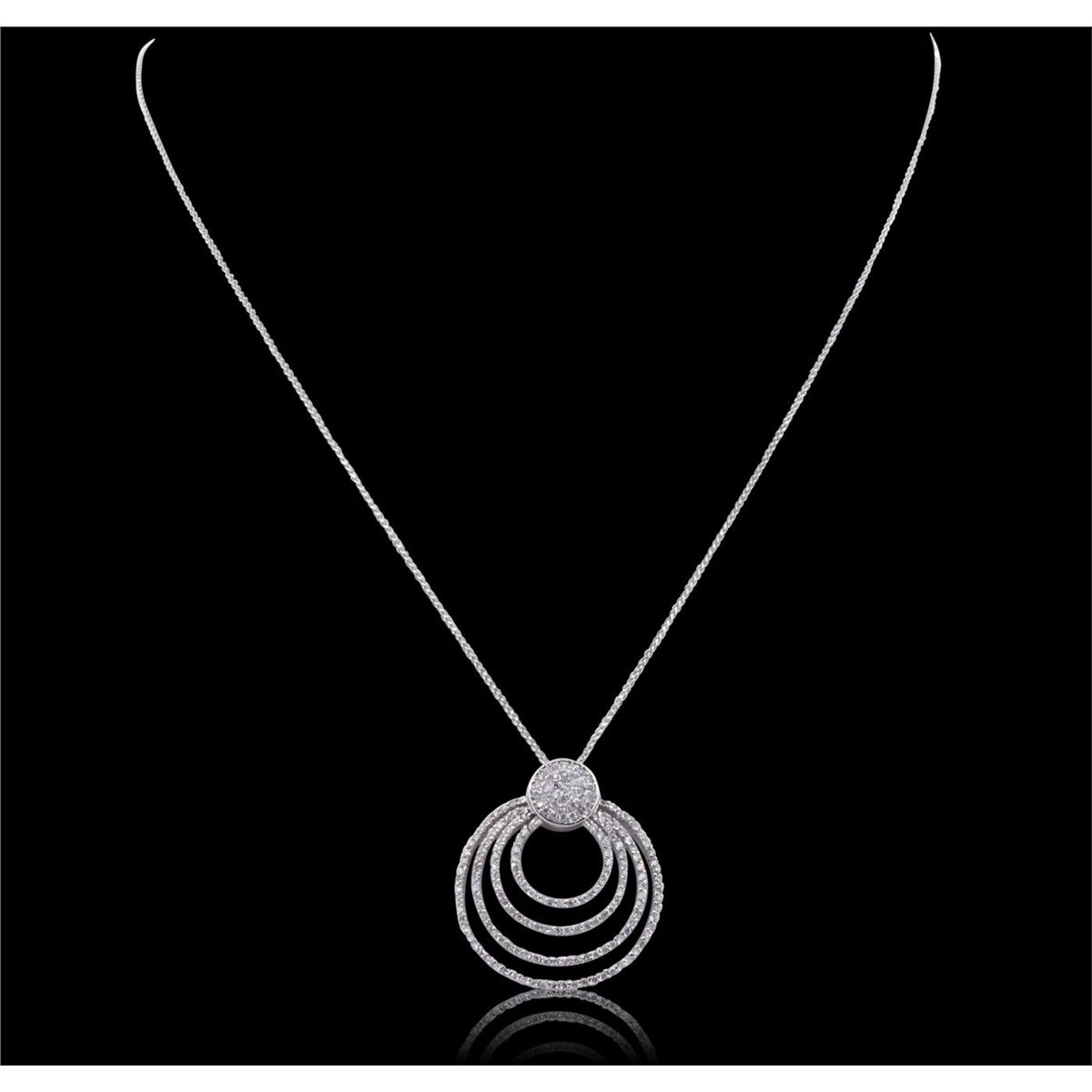 One electronically tested 14KT white gold ladies cast & assembled diamond pendant with chain. The pendant features four diamond set draping ribbons, completed by a diamond set bail. The pendant is supported by an eighteen inch length 14KT white gold designer style chain, terminating in a lobster claw clasp. Bright polish finish. Identified with markings of "K14". Condition is new, good workmanship. Containing: One Hundred Eighty-Nine prong set round brilliant cut diamonds, measuring 1.10 - 1.00 x 0.63mm (depth est.) approximate total weight of 189 Stones = 0.90ct. Graded in the setting. Clarity: I-1 to I-2. Color: G - J. Total Weight of Diamonds 0.90ct. Total Weight of Pendant With Chain 7.44 grams. AIG Appraised at $4,440.00.
