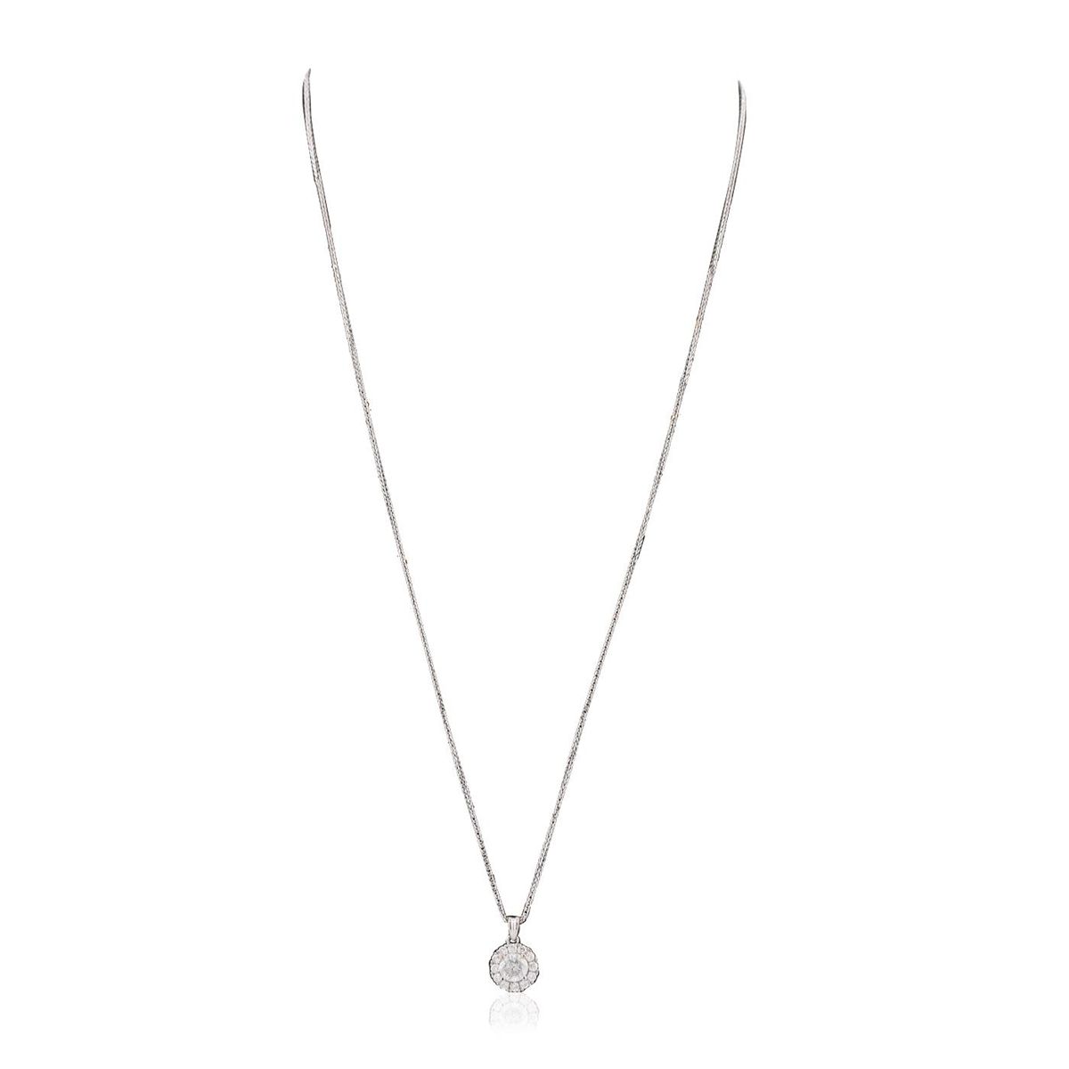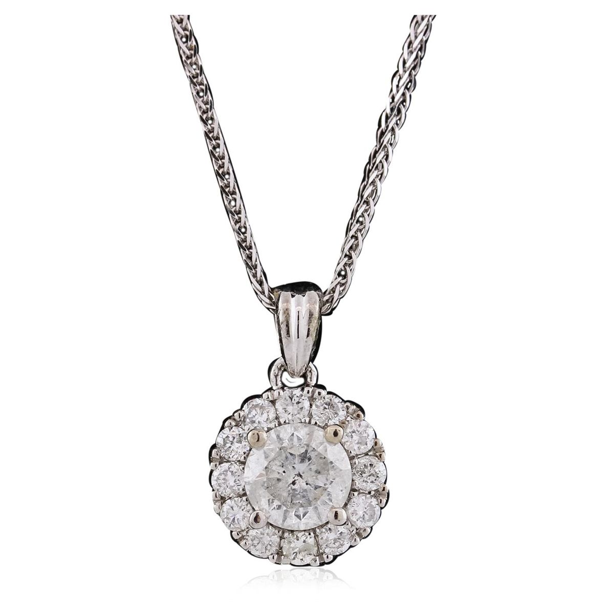 One electronically tested 14KT white gold ladies combination cast & assembled diamond pendant & chain 18.0" long, medium fancy cable with a lobster claw clasp with a bright polish finish. Identified with markings of "14K". Condition is new. Containing: One prong set round brilliant cut diamond, measuring 5.52 - 5.52 x 3.47mm (depth est.) approximate weight of 0.65ct. Clarity: I-3. Color: G, Cut is Good. Twelve prong set round brilliant cut diamonds, measuring 1.80 - 1.80 x 1.08mm (depth est.) approximate total weight of 12 Stones = 0.26ct. Clarity: SI-2 to I-2. Color: H - J, Cut is Good. All diamonds are graded in the mounting, unless otherwise stated. Total Weight of Diamonds 0.90ct. Total Weight of Pendant & Chain 2.70 grams. GGL Appraised at $3,280.00.