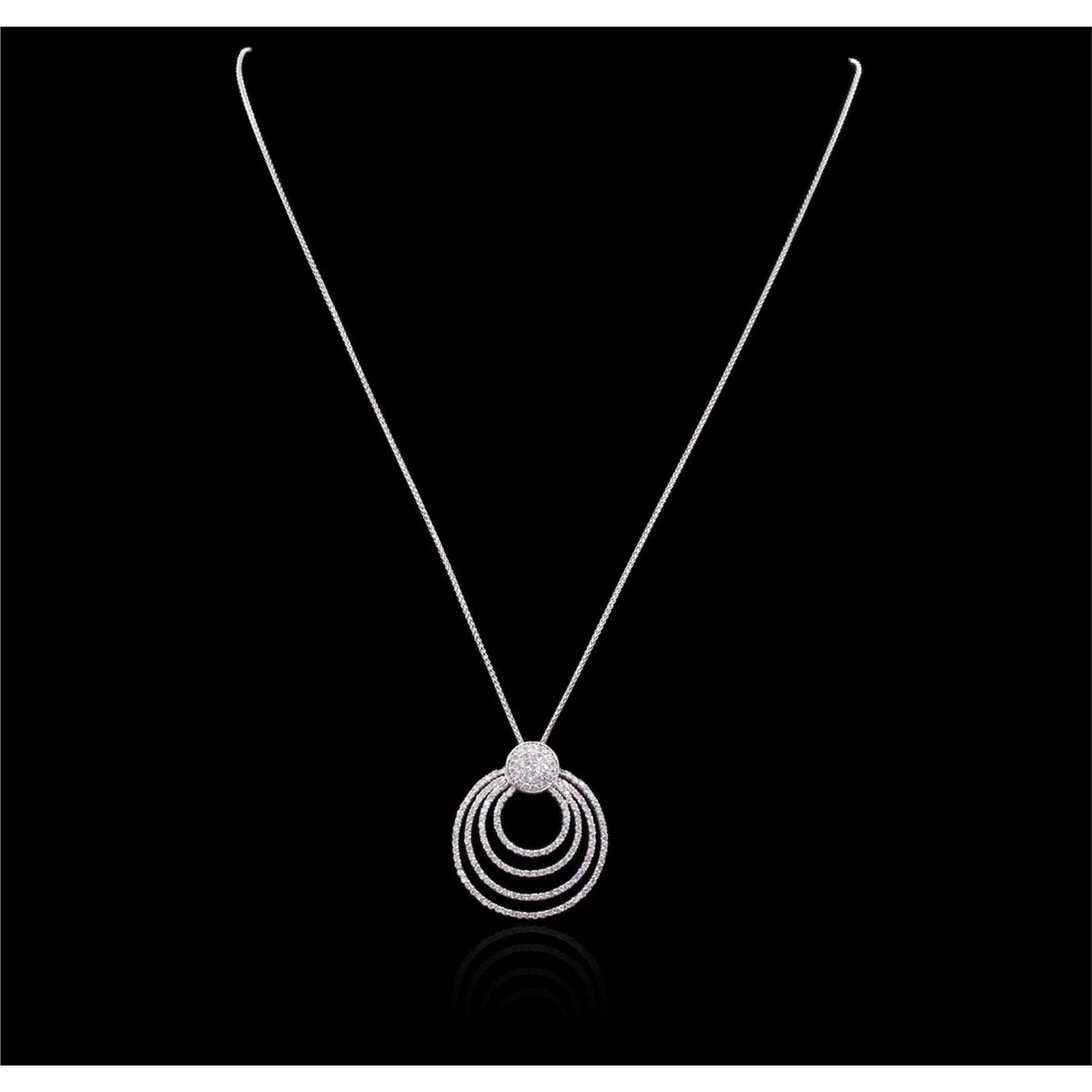 One electronically tested 14KT white gold ladies cast & assembled diamond pendant with chain. The pendant features four diamond set draping ribbons, completed by a diamond set bail. The pendant is supported by an eighteen inch length 14KT white gold designer style chain, terminating in a lobster claw clasp. Bright polish finish. Identified with markings of "K14". Condition is new, good workmanship. Containing: One Hundred Eighty-Nine prong set round brilliant cut diamonds, measuring 1.10 - 1.00 x 0.63mm (depth est.) approximate total weight of 189 Stones = 0.90ct. Graded in the setting. Clarity: I-1 to I-2. Color: G - J. Total Weight of Diamonds 0.90ct. Total Weight of Pendant With Chain 7.44 grams. AIG Appraised at $4,440.00.