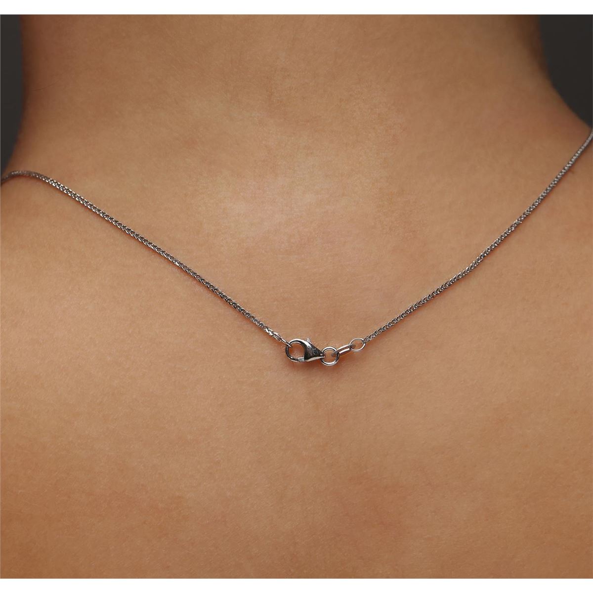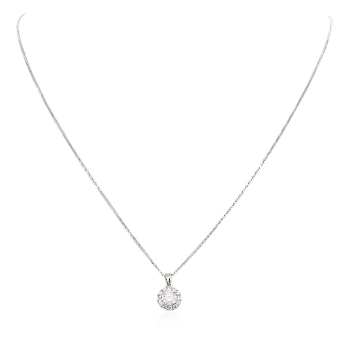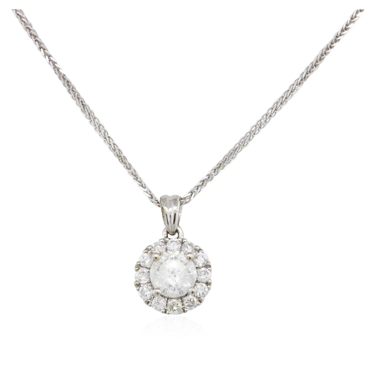 One electronically tested 14KT white gold ladies combination cast & assembled diamond pendant & chain 18.0" long, medium fancy cable with a lobster claw clasp with a bright polish finish. Identified with markings of "14K". Condition is new. Containing: One prong set round brilliant cut diamond, measuring 5.52 - 5.52 x 3.47mm (depth est.) approximate weight of 0.65ct. Clarity: I-3. Color: G, Cut is Good. Twelve prong set round brilliant cut diamonds, measuring 1.80 - 1.80 x 1.08mm (depth est.) approximate total weight of 12 Stones = 0.26ct. Clarity: SI-2 to I-2. Color: H - J, Cut is Good. All diamonds are graded in the mounting, unless otherwise stated. Total Weight of Diamonds 0.90ct. Total Weight of Pendant & Chain 2.70 grams. GGL Appraised at $3,280.00.