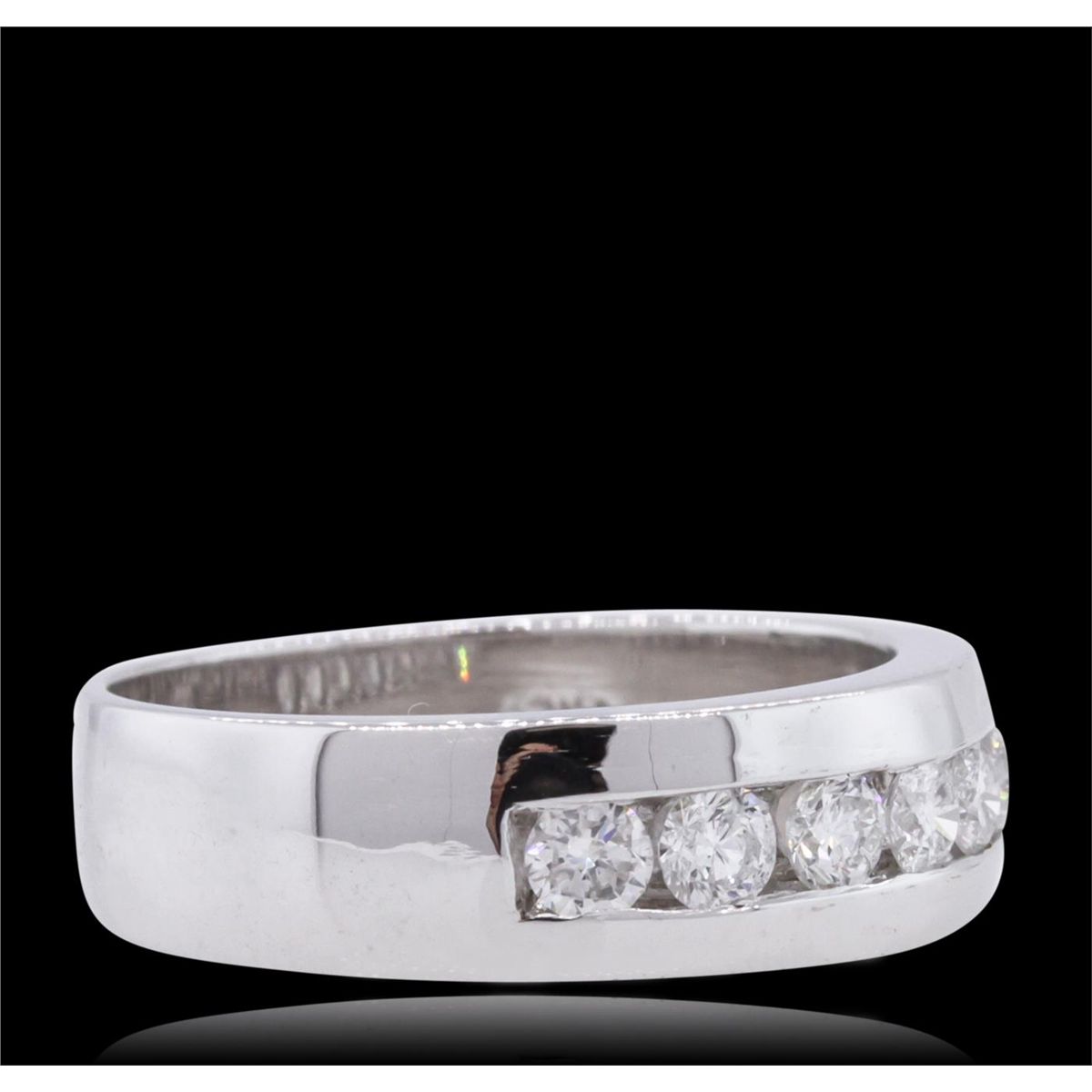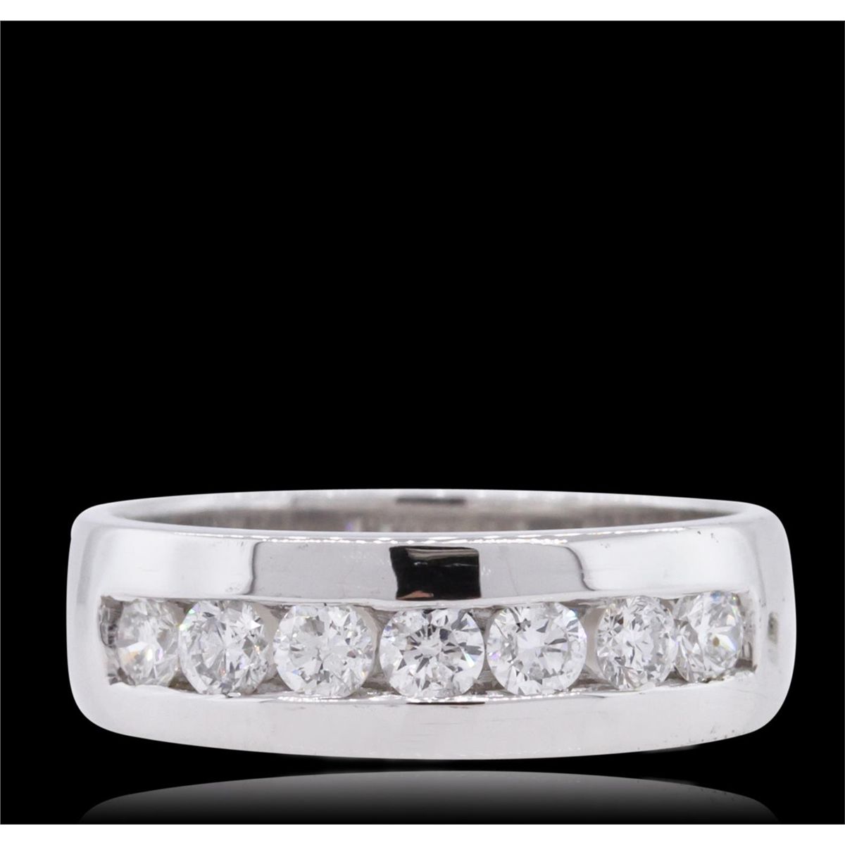 One electronically tested 14KT white gold gents cast diamond ring with a bright polish finish. The ring features a diamond set curvature, completed by a five and one-half millimeter wide band. Identified with markings of 14K. Condition is new, good workmanship. Containing: Seven channel set round brilliant cut diamonds, measuring 3.20 - 3.10 x 1.89mm (depth est.) approximate total weight of 7 Stones = 0.90ct. Graded in the setting. Clarity: SI-2 to I-1. Color: G - I. Total Weight of Diamonds 0.90ct. Total Weight of Ring 7.50 grams. AIG Appraised at $3,995.00.
