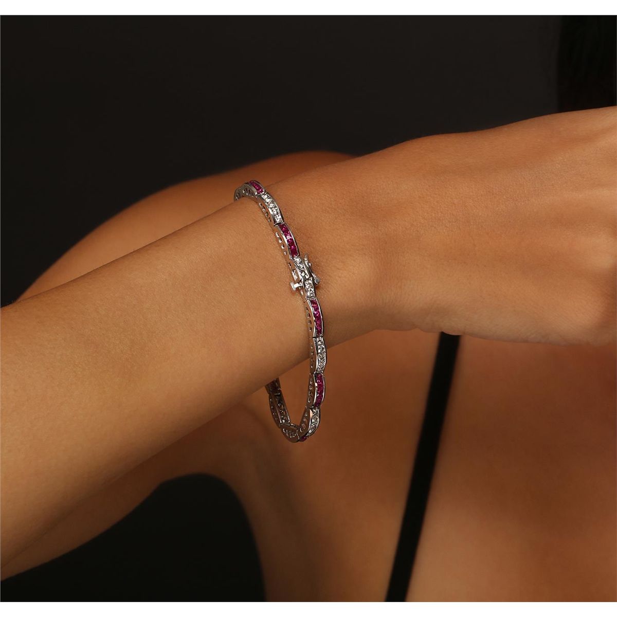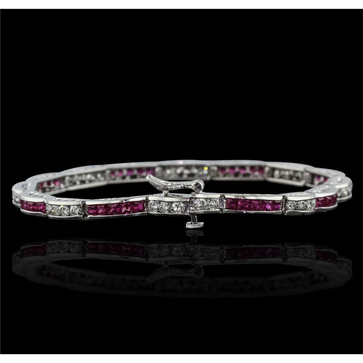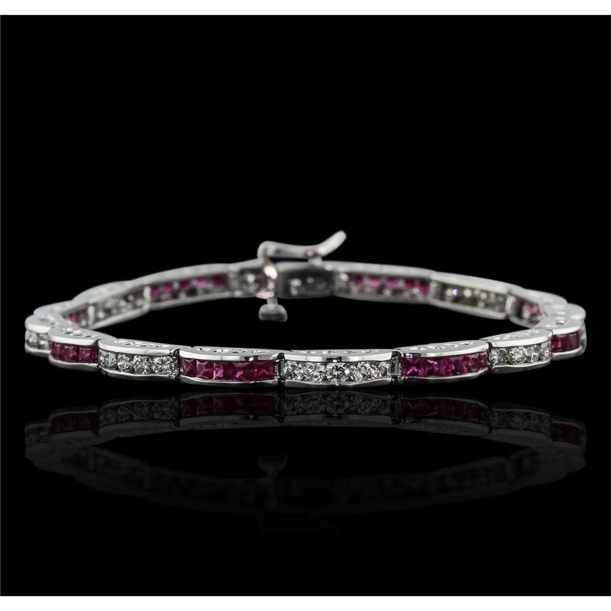 One electronically tested 14KT white gold ladies cast & assembled ruby and diamond bracelet with a bright polish finish. Condition is new, good workmanship. The seven inch length bracelet features a ribbon of ruby and diamond set links, terminating in a concealed clasp with safety. Identified with markings of "14K". Containing: Forty channel set princess cut natural rubies, measuring 2.20 x 2.20 x 1.43mm, approximate. Total Weight of 0.90ct., clarity is slightly included, type II, medium dark, moderately strong, slightly purplish red color, (GIA slpR 6/4), cut is good. Transmitting light with a minimum of distortion, transparent. Naturally occurring internal & external characteristics are present. Indications of laboratory high temperature heat treatment, with flux residue. Measurements & the color grade are an average for the group. Graded in the setting. Ruby has a low tolerance to rhodium plating, repolishing the surface, & ultrasonic cleaning. Forty channel set round brilliant cut diamonds, measuring 2.20 - 2.20 x 1.32mm (depth est.) approximate. Total Weight of 40 Stones = 1.67ct. Graded in the setting. Clarity: SI-2 to I-1. Color: H - J. Total Weight of Colored Stones 0.90ct. Total Weight of Diamonds 1.67ct. Total Weight of Bracelet 13.60 grams. AIG Appraised at $7,900.00.