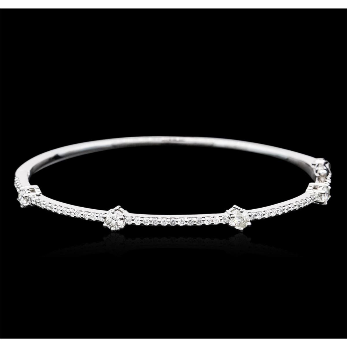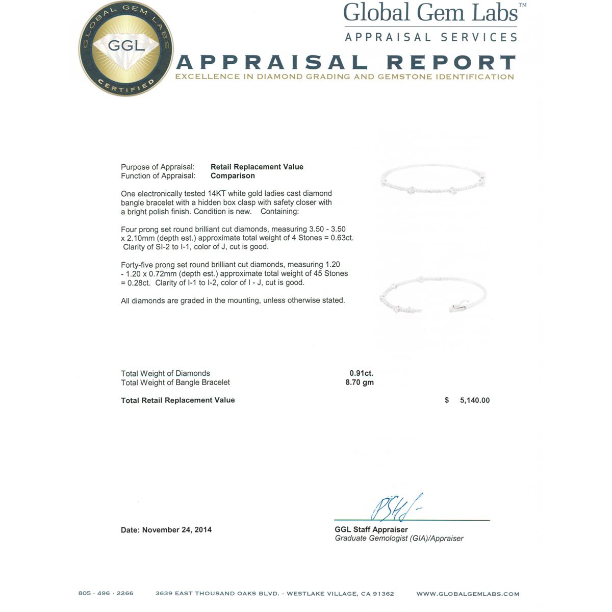 One electronically tested 14KT white gold ladies cast diamond bangle bracelet with a hidden box clasp with safety closer with a bright polish finish. Condition is new. Containing: Four prong set round brilliant cut diamonds, measuring 3.50 - 3.50 x 2.10mm (depth est.) approximate total weight of 4 Stones = 0.63ct. Clarity: SI-2 to I-1. Color: J, Cut is Good. Forty-Five prong set round brilliant cut diamonds, measuring 1.20 - 1.20 x 0.72mm (depth est.) approximate total weight of 45 Stones = 0.28ct. Clarity: I-1 to I-2. Color: I - J, Cut is Good. All diamonds are graded in the mounting, unless otherwise stated. Total Weight of Diamonds 0.91ct. Total Weight of Bangle Bracelet 8.70 grams. GGL Appraised at $5,140.00.