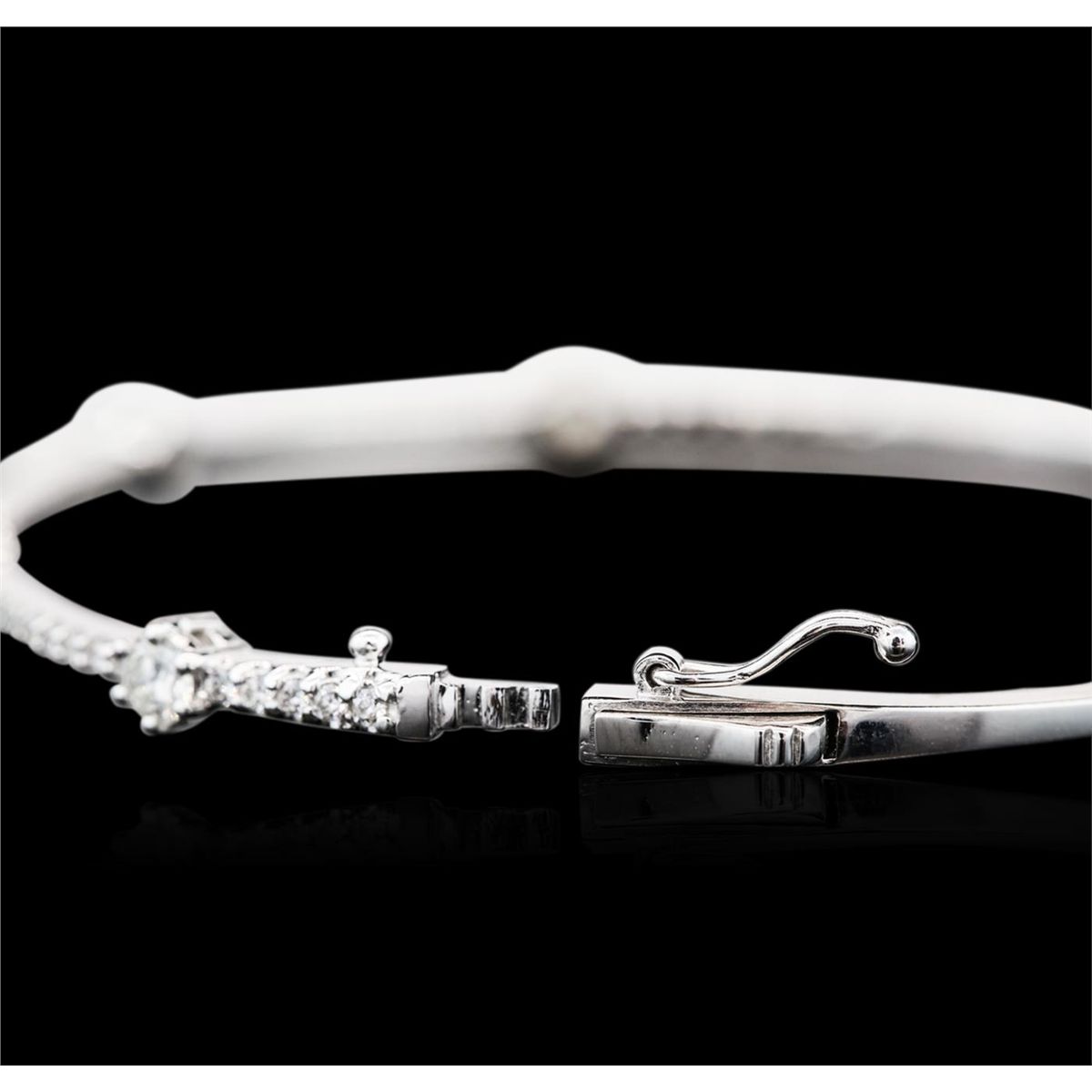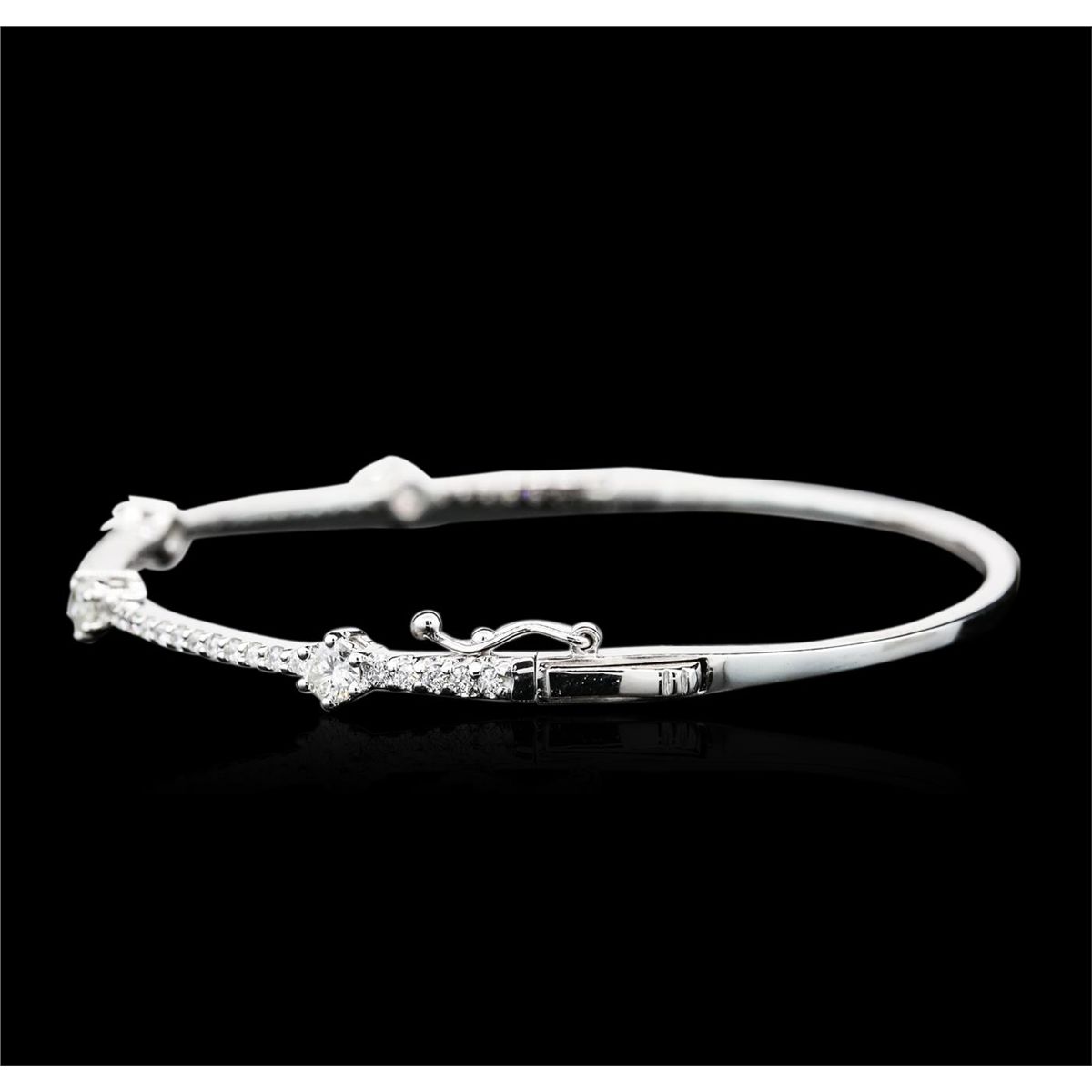 One electronically tested 14KT white gold ladies cast diamond bangle bracelet with a hidden box clasp with safety closer with a bright polish finish. Condition is new. Containing: Four prong set round brilliant cut diamonds, measuring 3.50 - 3.50 x 2.10mm (depth est.) approximate total weight of 4 Stones = 0.63ct. Clarity: SI-2 to I-1. Color: J, Cut is Good. Forty-Five prong set round brilliant cut diamonds, measuring 1.20 - 1.20 x 0.72mm (depth est.) approximate total weight of 45 Stones = 0.28ct. Clarity: I-1 to I-2. Color: I - J, Cut is Good. All diamonds are graded in the mounting, unless otherwise stated. Total Weight of Diamonds 0.91ct. Total Weight of Bangle Bracelet 8.70 grams. GGL Appraised at $5,140.00.