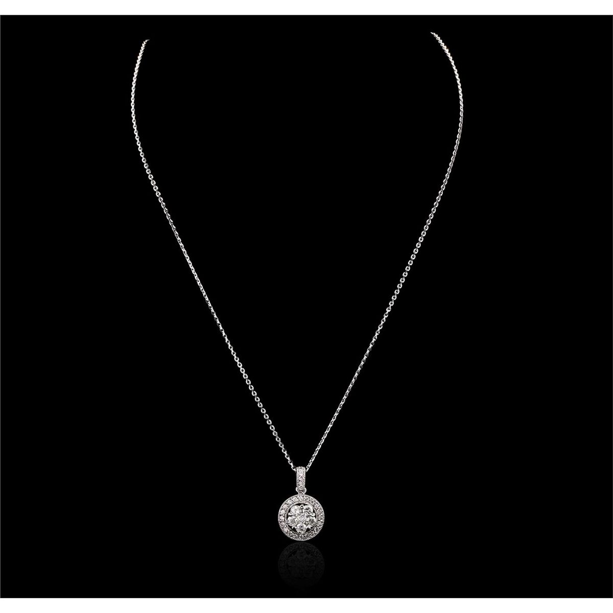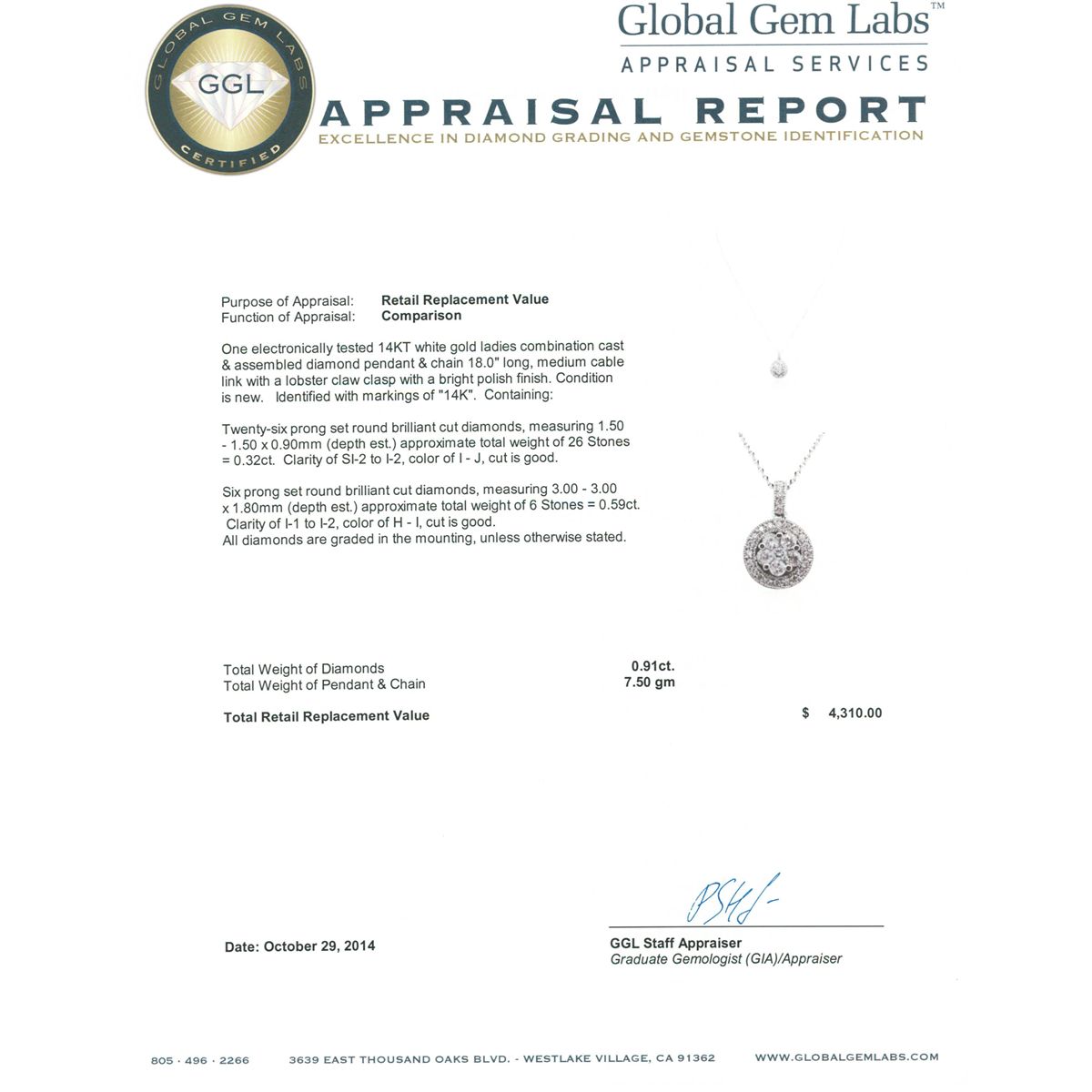 One electronically tested 14KT white gold ladies combination cast & assembled diamond pendant & chain 18.0 long, medium cable link with a lobster claw clasp with a bright polish finish. Identified with markings of 14K. Condition is new. Containing: Twenty-Six prong set round brilliant cut diamonds, measuring 1.50 - 1.50 x 0.90mm (depth est.) approximate total weight of 26 Stones = 0.32ct. Clarity: SI-2 to I-2. Color: I - J, Cut is Good. Six prong set round brilliant cut diamonds, measuring 3.00 - 3.00 x 1.80mm (depth est.) approximate total weight of 6 Stones = 0.59ct. Clarity: I-1 to I-2. Color: H - I, Cut is Good. All diamonds are graded in the mounting, unless otherwise stated. Total Weight of Diamonds 0.91ct. Total Weight of Pendant & Chain 7.50 grams. GGL Appraised at $4,310.00.
