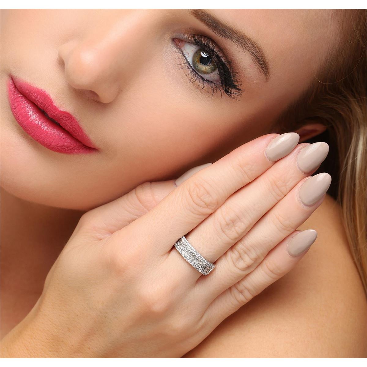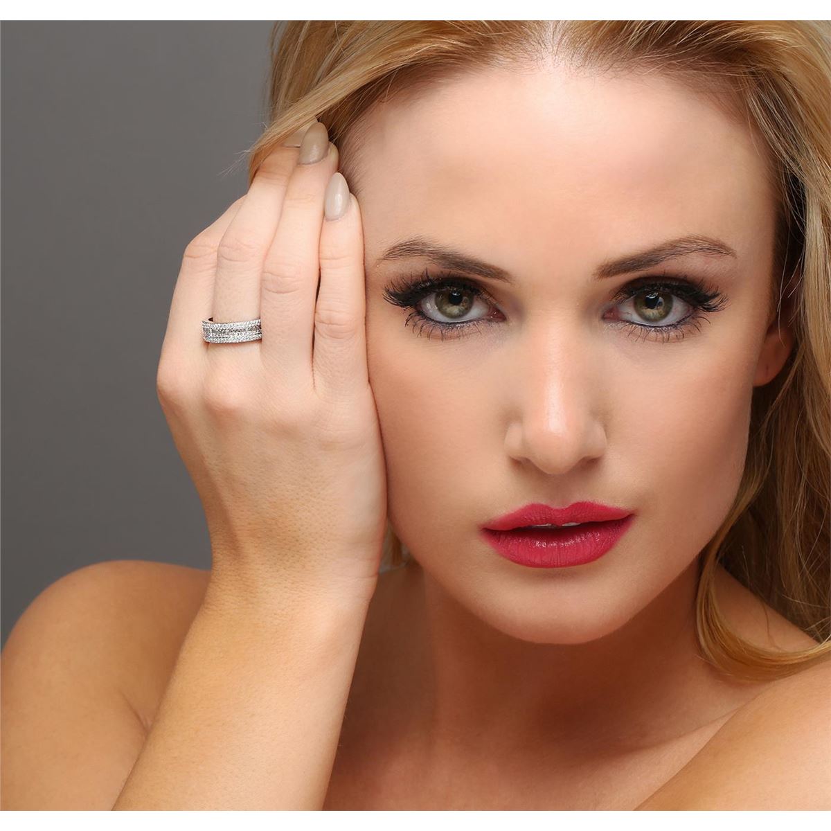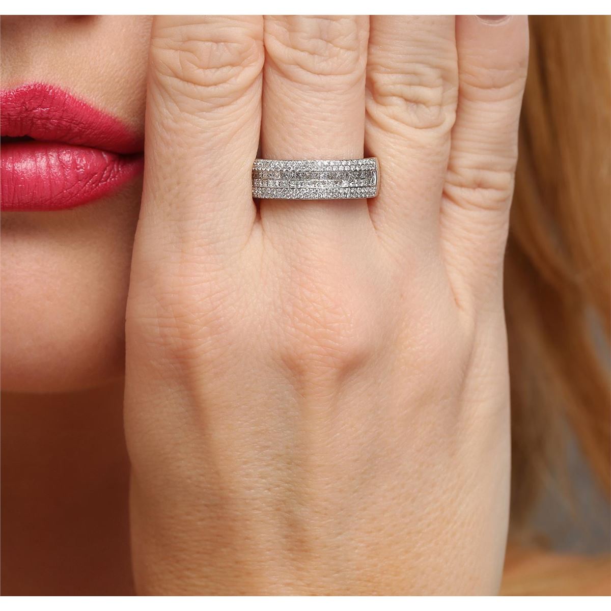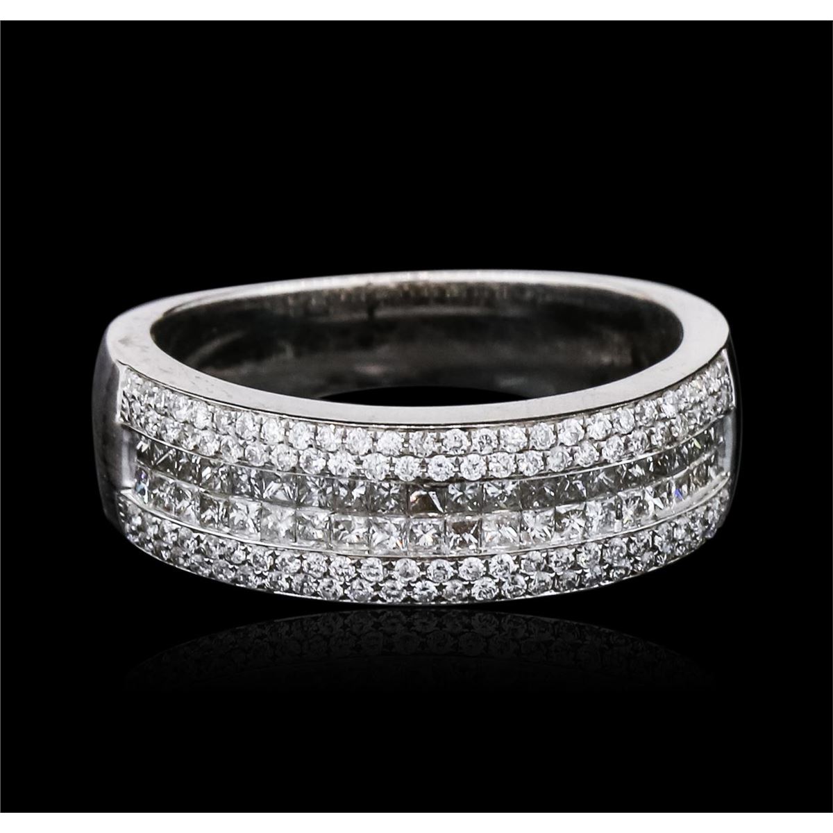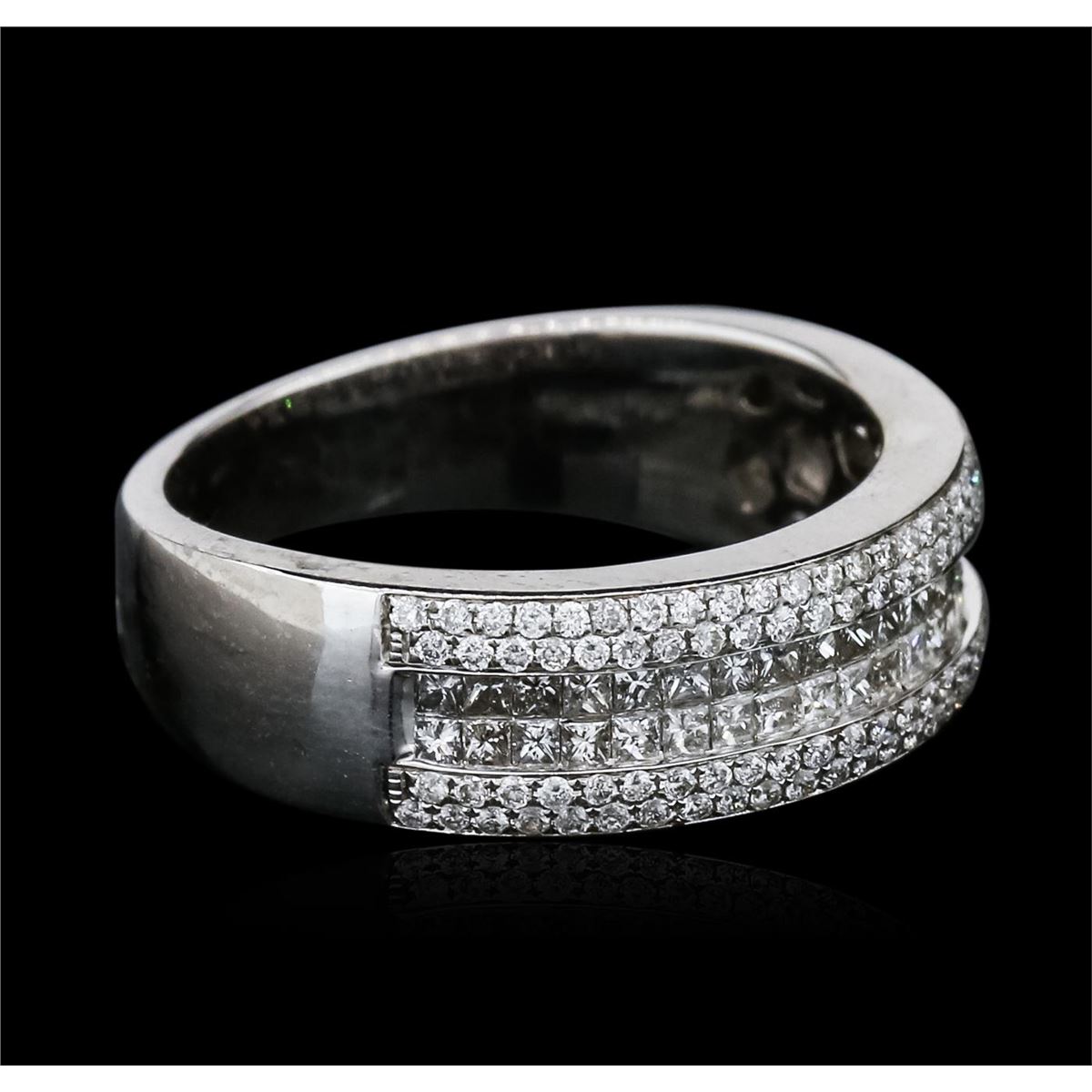 One electronically tested 14KT white gold ladies combination cast & assembled diamond ring with a bright polish finish. Identified with markings of "14K". Condition is new. Containing: One Hundred Two prong set round brilliant cut diamonds, measuring 1.00 - 1.00 x 0.60mm (depth est.) approximate total weight of 102 Stones = 0.37ct. Clarity: SI-2 to I-1. Color: H - I, Cut is Good. Forty channel set princess cut diamonds, measuring 1.30 x 1.30 x 0.98mm (depth est.) approximate total weight of 40 Stones = 0.54ct. Clarity: SI-1 to SI-2. Color: H - I, Cut is Good. All diamonds are graded in the mounting, unless otherwise stated. Total Weight of Diamonds 0.91ct. Total Weight of Ring 5.70 grams. GGL Appraised at $4,430.00.