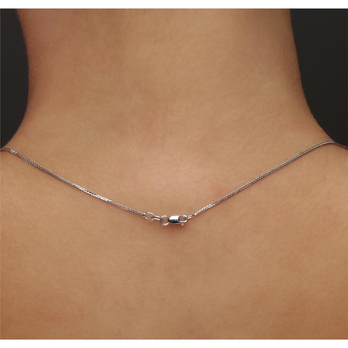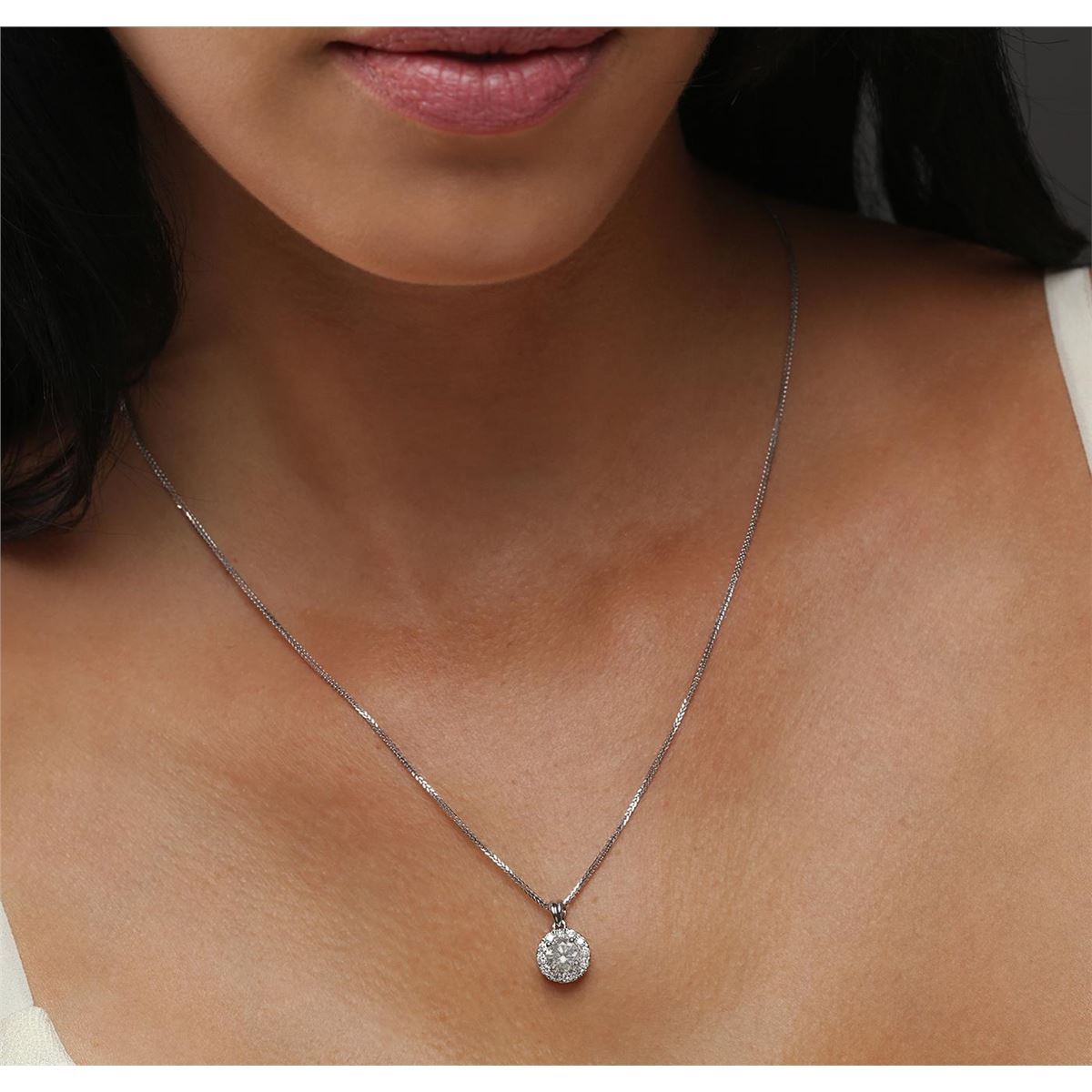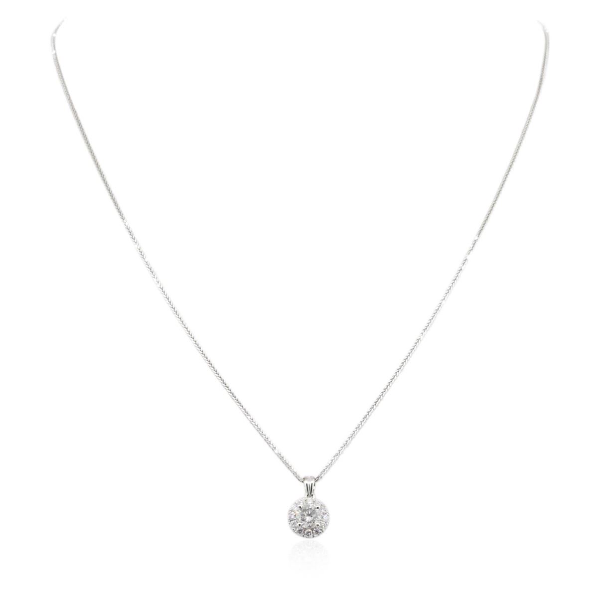 One electronically tested 14KT white gold ladies combination cast & assembled diamond pendant & chain 18.0" long, medium fancy cable with a lobster claw clasp with a bright polish finish. Identified with markings of "14K". Condition is new. Containing: One prong set round brilliant cut diamond, measuring 5.58 - 5.55 x 3.50mm (depth est.) approximate weight of 0.66ct. Clarity: I-3. Color: G, Cut is Good. Twelve prong set round brilliant cut diamonds, measuring 1.80 - 1.80 x 1.08mm (depth est.) approximate total weight of 12 Stones = 0.26ct. Clarity: SI-2 to I-2. Color: H - J, Cut is Good. All diamonds are graded in the mounting, unless otherwise stated. Total Weight of Diamonds 0.92ct. Total Weight of Pendant & Chain 2.70 grams. GGL Appraised at $3,320.00.