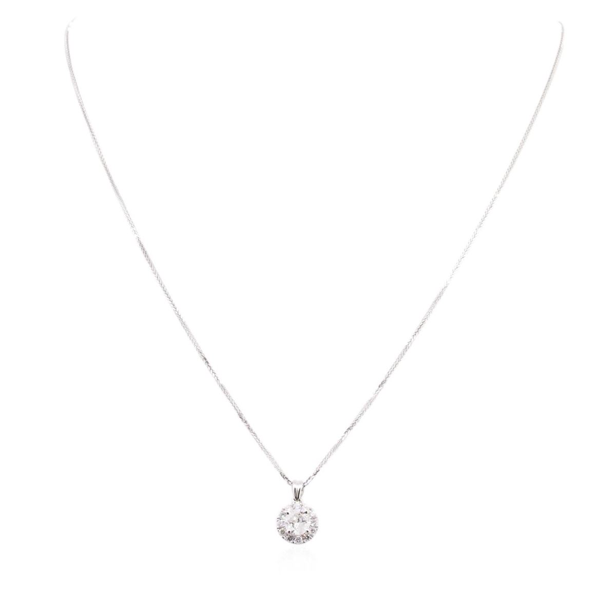 One electronically tested 14KT white gold ladies combination cast & assembled diamond pendant & chain 18.0" long, medium fancy cable with a lobster claw clasp with a bright polish finish. Identified with markings of "14K". Condition is new. Containing: One prong set round brilliant cut diamond, measuring 5.68 - 5.67 x 3.40mm (depth est.) approximate weight of 0.67ct. Clarity: I-2. Color: G, Cut is Good. Twelve prong set round brilliant cut diamonds, measuring 1.80 - 1.80 x 1.08mm (depth est.) approximate total weight of 12 Stones = 0.26ct. Clarity: SI-2 to I-2. Color: H - I, Cut is Good. All diamonds are graded in the mounting, unless otherwise stated. Total Weight of Diamonds 0.92ct. Total Weight of Pendant & Chain 2.60 grams. GGL Appraised at $5,930.00.