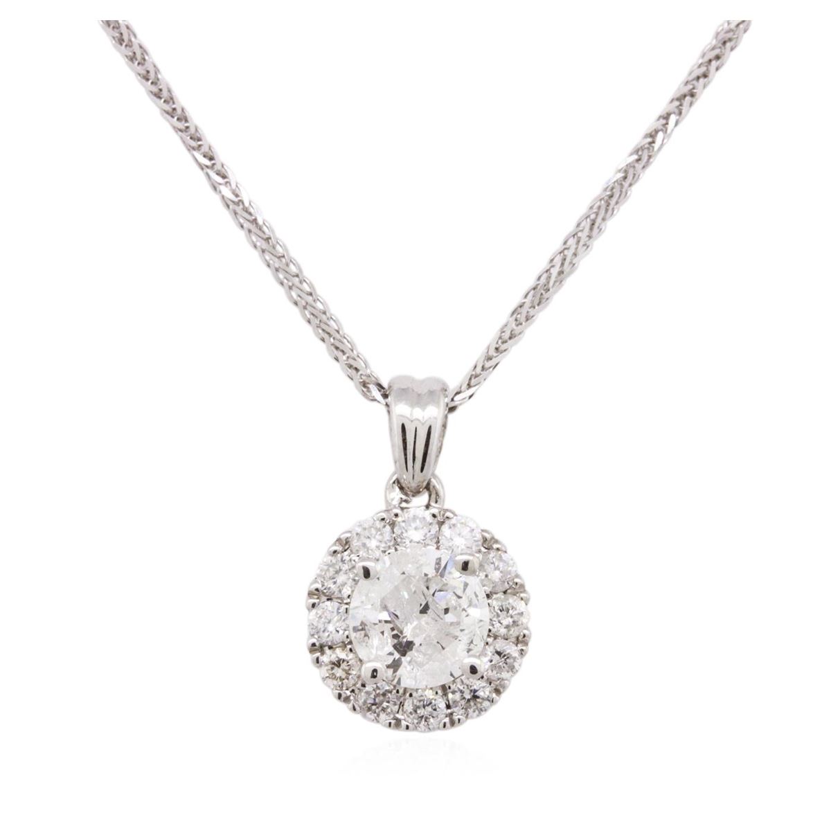One electronically tested 14KT white gold ladies combination cast & assembled diamond pendant & chain 18.0" long, medium fancy cable with a lobster claw clasp with a bright polish finish. Identified with markings of "14K". Condition is new. Containing: One prong set round brilliant cut diamond, measuring 5.68 - 5.67 x 3.40mm (depth est.) approximate weight of 0.67ct. Clarity: I-2. Color: G, Cut is Good. Twelve prong set round brilliant cut diamonds, measuring 1.80 - 1.80 x 1.08mm (depth est.) approximate total weight of 12 Stones = 0.26ct. Clarity: SI-2 to I-2. Color: H - I, Cut is Good. All diamonds are graded in the mounting, unless otherwise stated. Total Weight of Diamonds 0.92ct. Total Weight of Pendant & Chain 2.60 grams. GGL Appraised at $5,930.00.