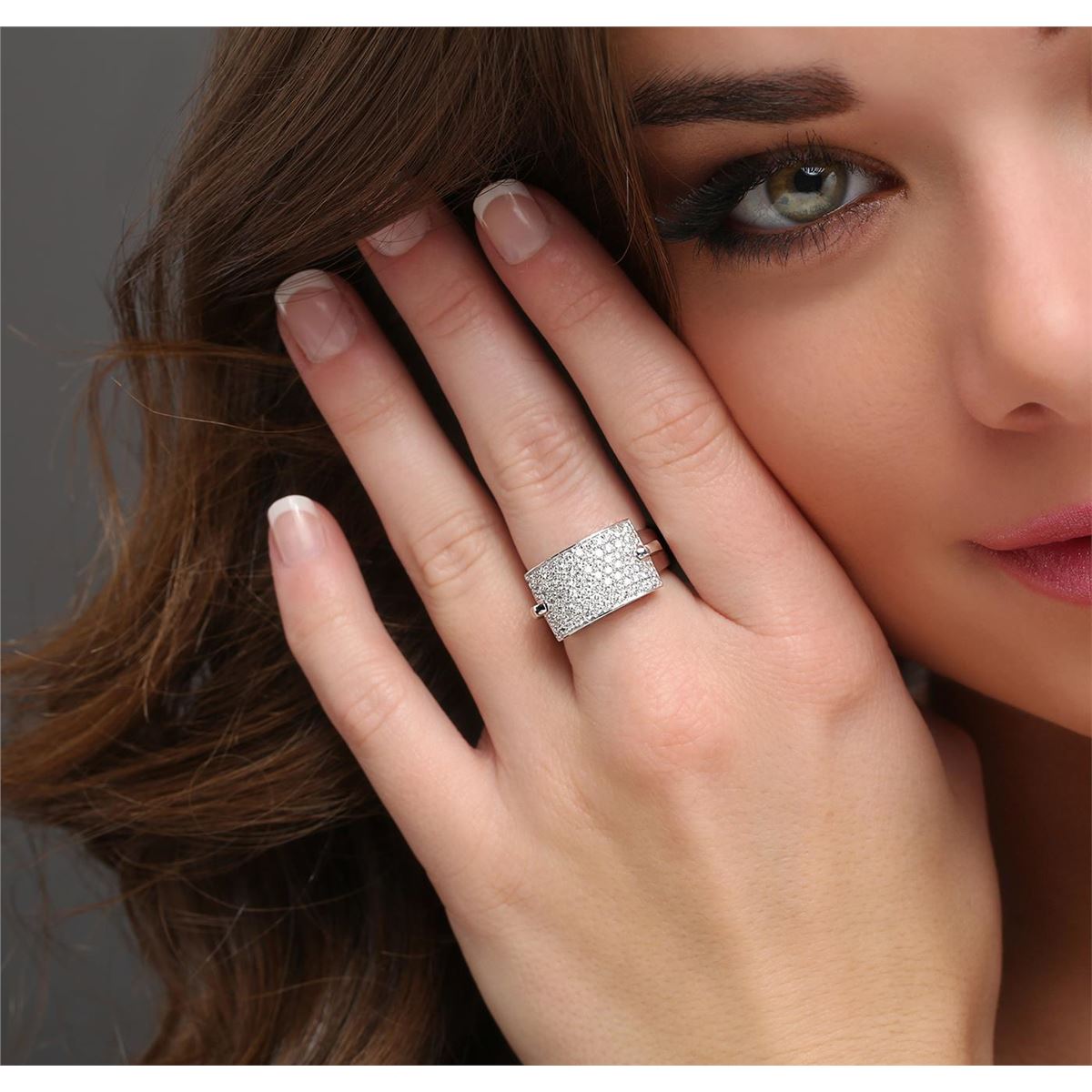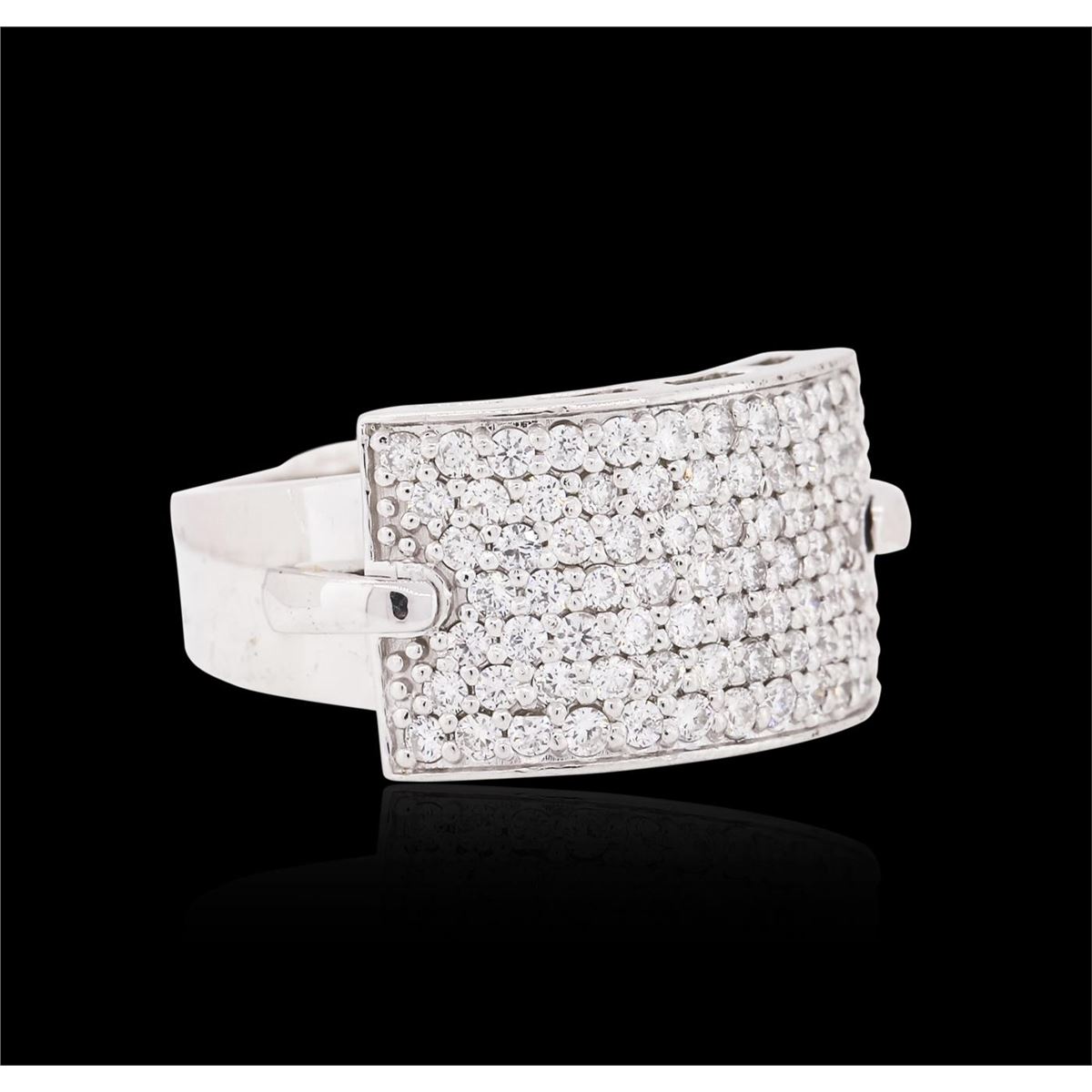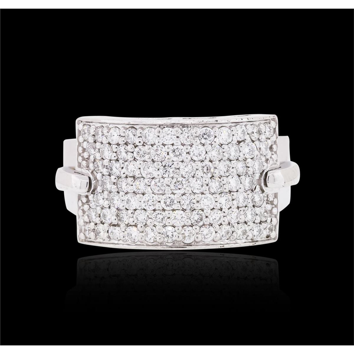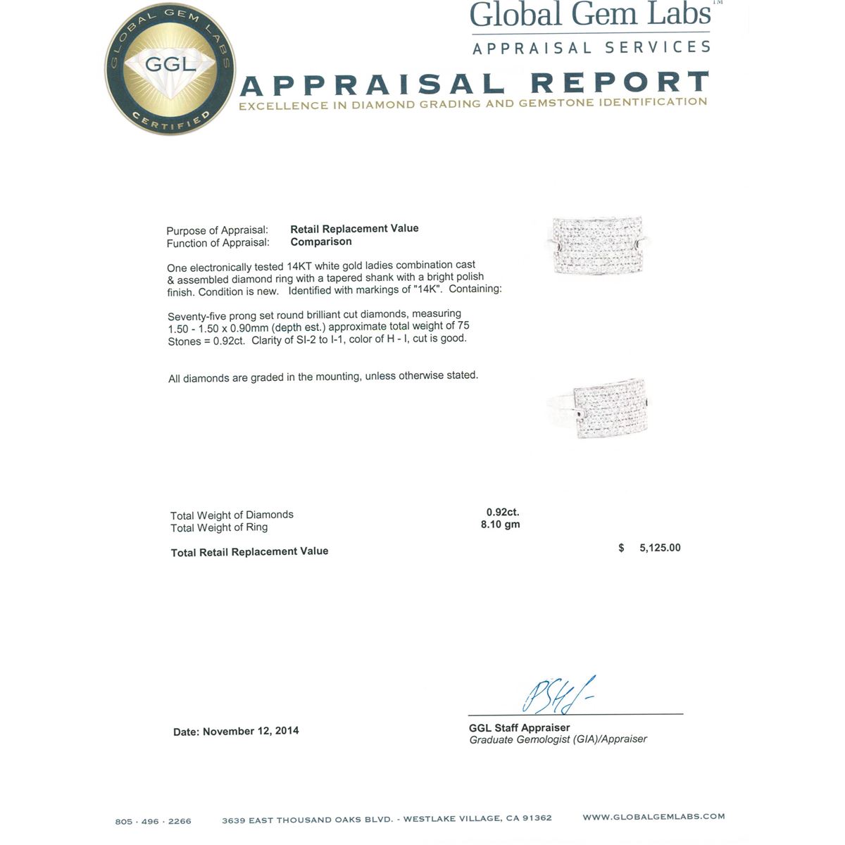 One electronically tested 14KT white gold ladies combination cast & assembled diamond ring with a tapered shank with a bright polish finish. Identified with markings of "14K". Condition is new. Containing: Seventy-Five prong set round brilliant cut diamonds, measuring 1.50 - 1.50 x 0.90mm (depth est.) approximate total weight of 75 Stones = 0.92ct. Clarity: SI-2 to I-1. Color: H - I, Cut is Good. All diamonds are graded in the mounting, unless otherwise stated. Total Weight of Diamonds 0.92ct. Total Weight of Ring 8.10 grams. GGL Appraised at $5,125.00.
