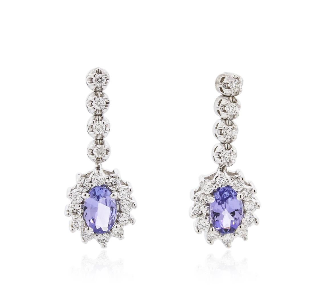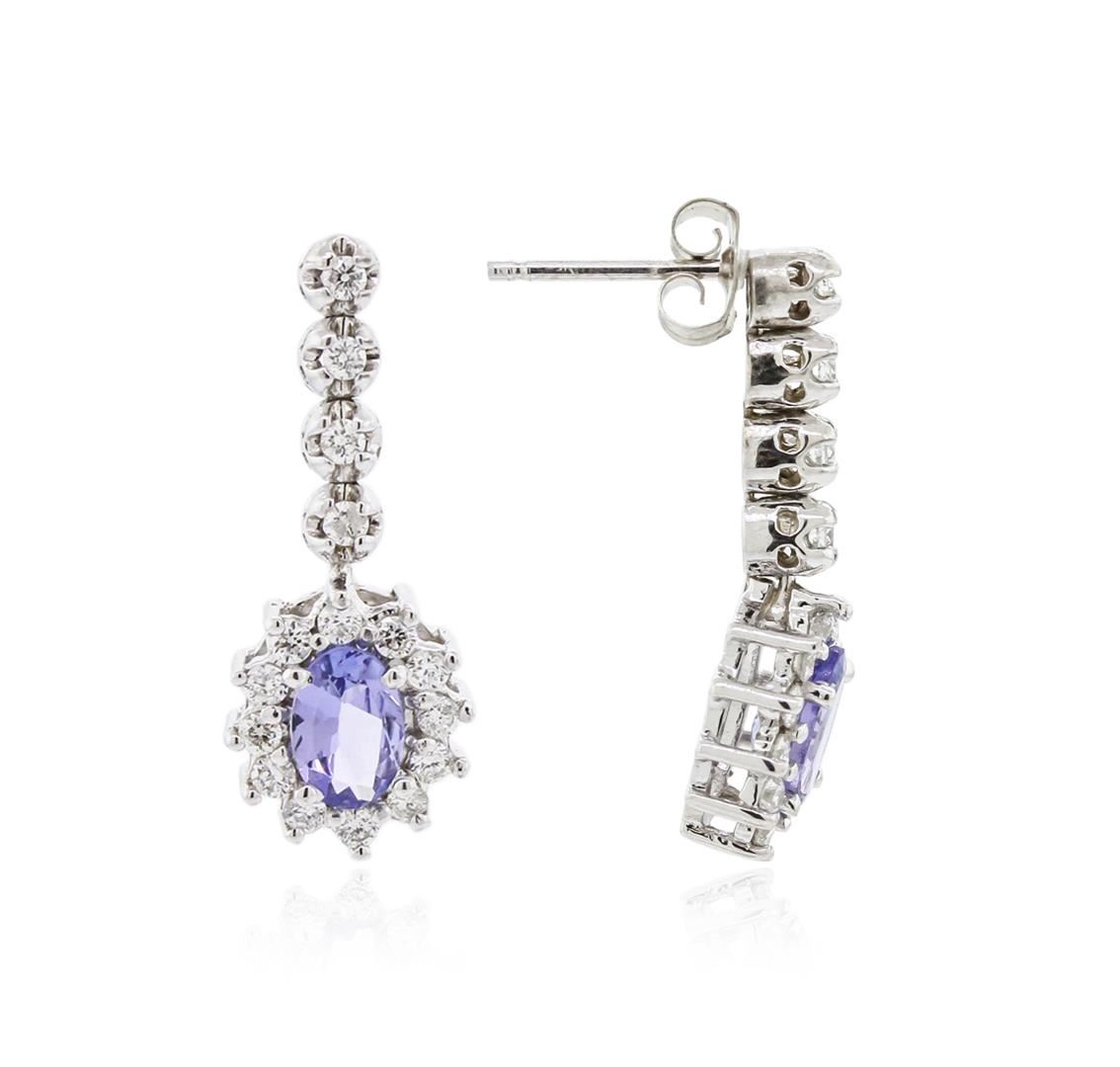 One pair electronically tested 14KT white gold ladies cast tanzanite and diamond earrings with friction posts with a bright polish finish. Identified with markings of "14K". Condition is new. Containing: Two prong set oval modified brilliant cut natural tanzanites, measuring 6.00. x 5.30 x 3.45mm, approximate total weight of 0.92ct., clarity is eye clean, type I, medium light, slightly grayish, violet color, (GIA V 4/2), cut is good. Thirty-Two prong set round brilliant cut diamonds, measuring 1.50 - 1.50 x 0.90mm (depth est.) approximate total weight of 32 Stones = 0.51ct. Clarity: SI-1 to I-1. Color: I - J, Cut is Good. Colored gemstones are presumed to have been subjected to commonly used enhancement processes. All diamonds and colored gemstones are graded in the mounting, unless otherwise stated. Total Weight of Colored Stones 0.92ct. Total Weight of Diamonds 0.51ct. Total Weight of Earrings 3.20 grams. GGL Appraised at $1,620.00.
