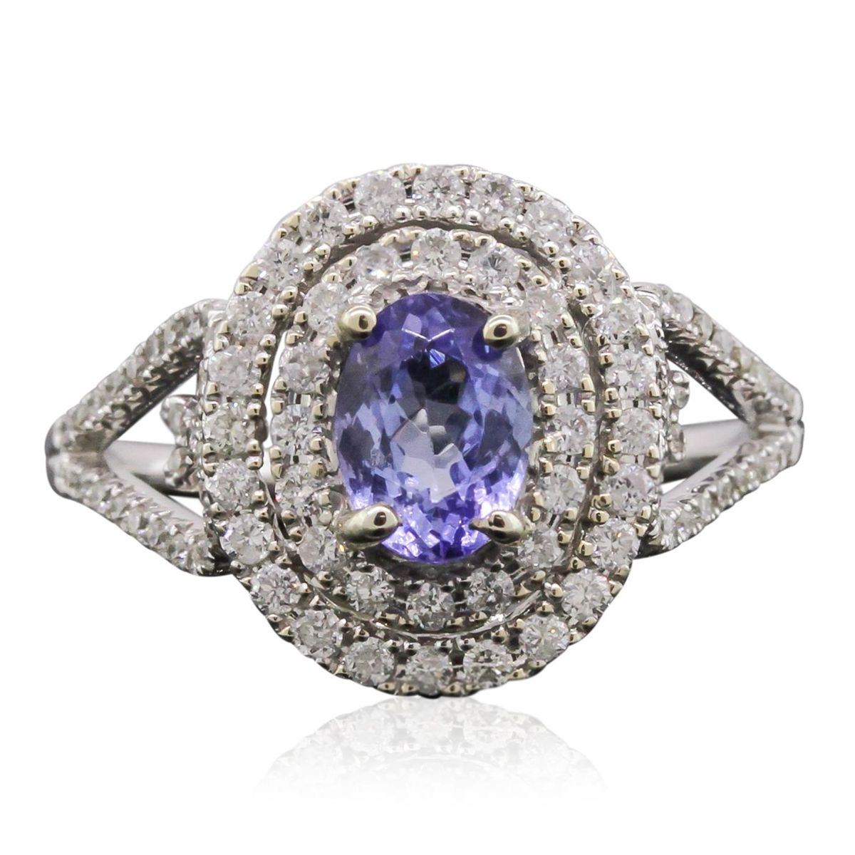 One electronically tested 14KT white gold Ladies combination cast & assembled ring with a bright polish finish. Condition is new. Identified with markings of "14K". Containing: One prong set oval modified brilliant cut natural tanzanite, measuring 7.00 x 5.00 x 3.25mm, approximate weight of 0.92ct., clarity is eye clean, type I, medium light, slightly grayish, violet color, (GIA V 4/2), cut is very good. Colored gemstones are presumed to have been subjected to commonly used color/clarity enhancement processes. Fifty-Four prong set round brilliant cut diamonds, measuring 0.70 - 0.70 x 0.42mm (depth est.) approximate. Total Weight of 54 Stones = 0.10ct. Clarity: I-1. Color: G - H, Cut is Good. Forty-Two prong set round brilliant cut diamonds, measuring 1.20 - 1.20 x 0.72mm (depth est.) approximate. Total Weight of 42 Stones = 0.49ct. Clarity: SI-1 to SI-2. Color: H - I, Cut is Good. Total Weight of Colored Stones 0.92ct. Total Weight of Diamonds 0.59ct. Total Weight of Ring 3.50 grams. GGL Appraised at $4,520.00.