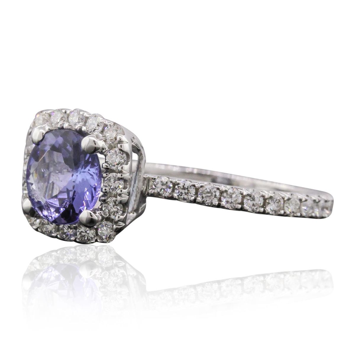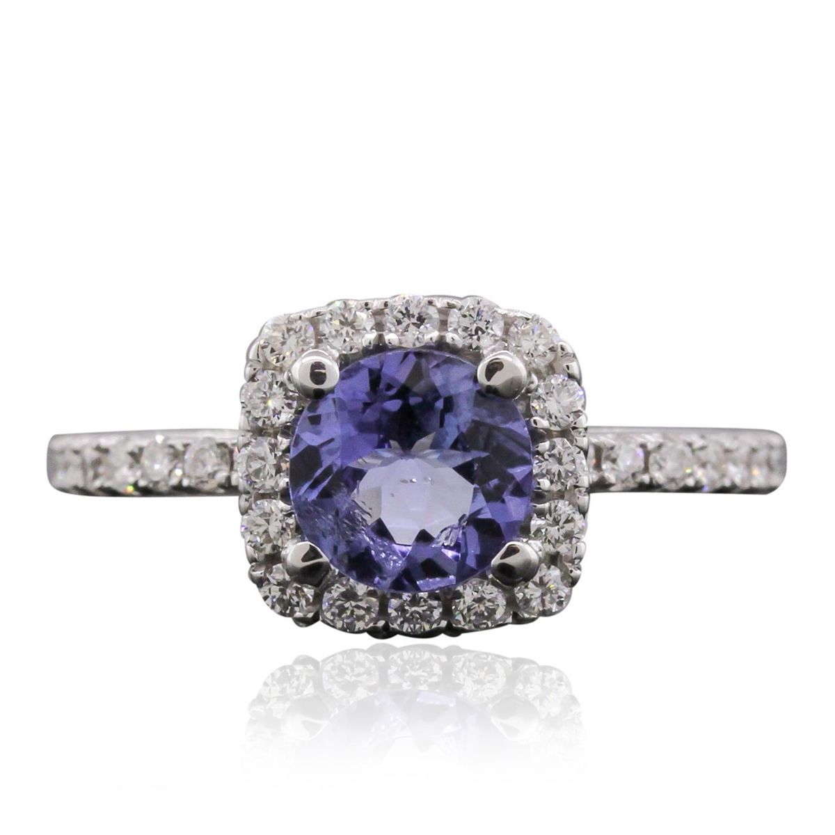 One electronically tested 14KT white gold Ladies combination cast & assembled ring with a bright polish finish. Condition is new. Containing: One prong set round modified mixed cut natural tanzanite, measuring 6.45 - 6.45 x 3.30 mm, approximate weight of 0.92ct., clarity is eye clean, type I, medium light, very slightly grayish, violet color, (GIA V 4/3), cut is very good. Colored gemstones are presumed to have been subjected to commonly used color/clarity enhancement processes. Thirty-Nine prong set round brilliant cut diamonds, measuring 1.50 - 1.50 x 0.90mm (depth est.) approximate. Total Weight of 39 Stones = 0.48ct. Clarity: SI-1 to SI-2. Color: H - I, Cut is Good. Total Weight of Colored Stones 0.92ct. Total Weight of Diamonds 0.48ct. Total Weight of Ring 2.40 grams. GGL Appraised at $3,755.00.