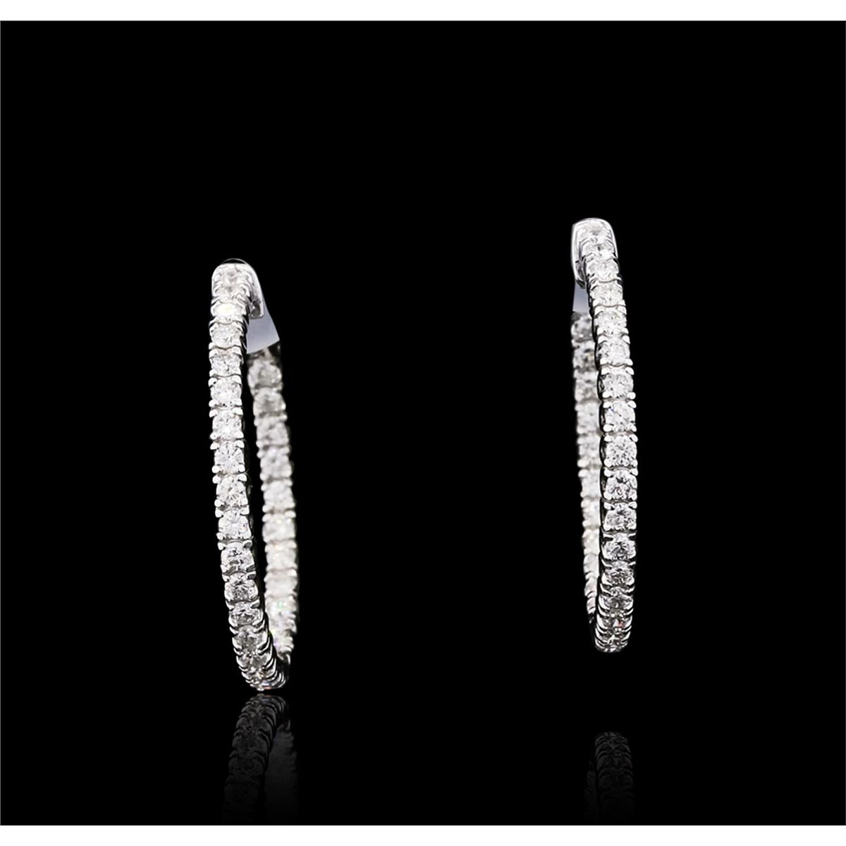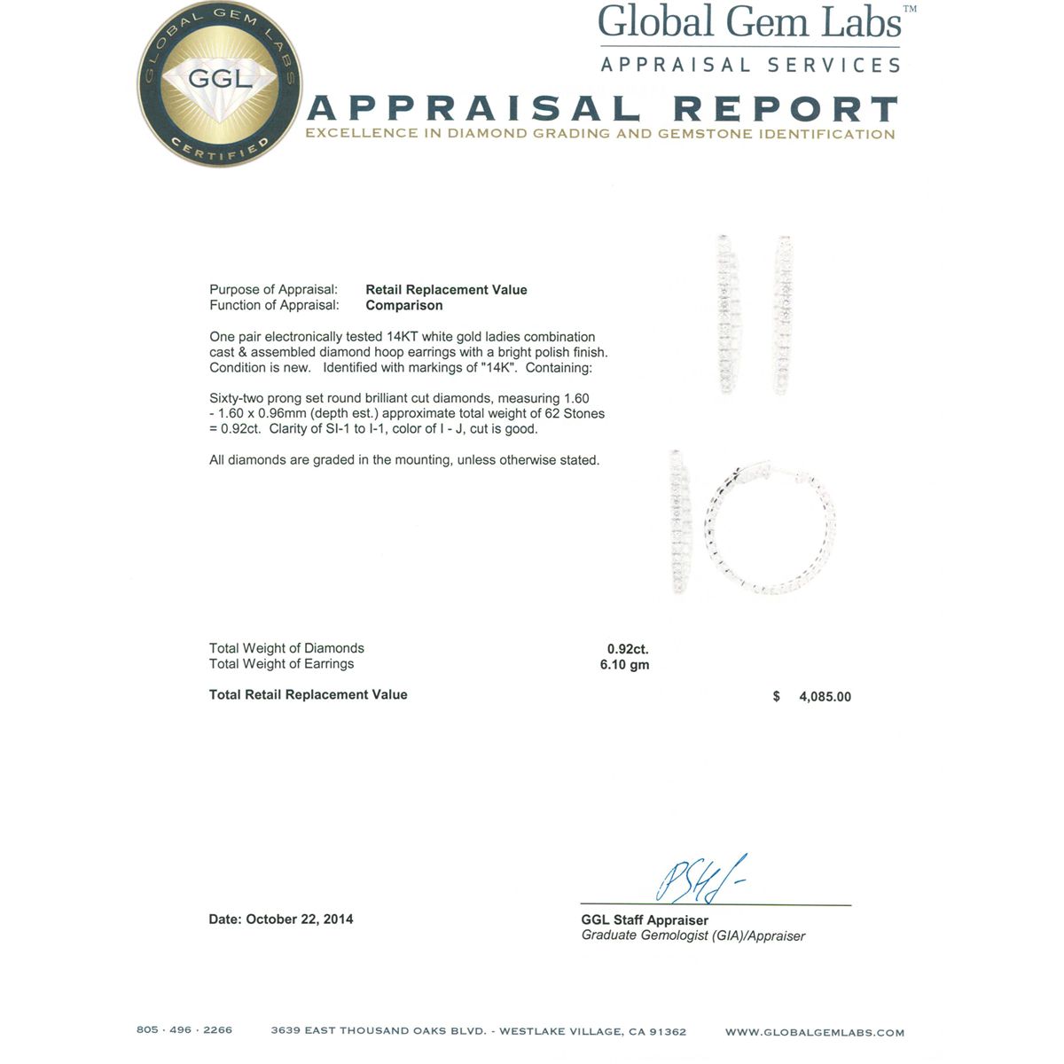 One pair electronically tested 14KT white gold ladies combination cast & assembled diamond hoop earrings with a bright polish finish. Identified with markings of "14K". Condition is new. Containing: Sixty-Two prong set round brilliant cut diamonds, measuring 1.60 - 1.60 x 0.96mm (depth est.) approximate total weight of 62 Stones = 0.92ct. Clarity: SI-1 to I-1. Color: I - J, Cut is Good. All diamonds are graded in the mounting, unless otherwise stated. Total Weight of Diamonds 0.92ct. Total Weight of Earrings 6.10 grams. GGL Appraised at $4,085.00.