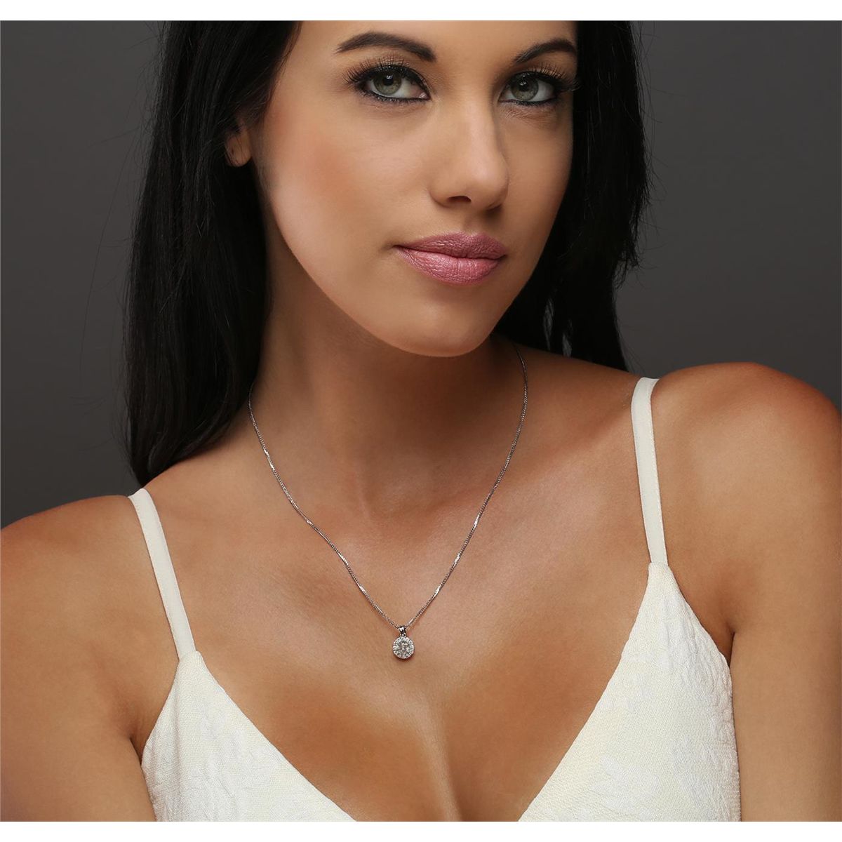 One electronically tested 14KT white gold ladies combination cast & assembled diamond pendant & chain 18.0" long, medium fancy cable with a lobster claw clasp with a bright polish finish. Identified with markings of "14K". Condition is new. Containing: One prong set round brilliant cut diamond, measuring 5.58 - 5.55 x 3.50mm (depth est.) approximate weight of 0.66ct. Clarity: I-3. Color: G, Cut is Good. Twelve prong set round brilliant cut diamonds, measuring 1.80 - 1.80 x 1.08mm (depth est.) approximate total weight of 12 Stones = 0.26ct. Clarity: SI-2 to I-2. Color: H - J, Cut is Good. All diamonds are graded in the mounting, unless otherwise stated. Total Weight of Diamonds 0.92ct. Total Weight of Pendant & Chain 2.70 grams. GGL Appraised at $3,320.00.