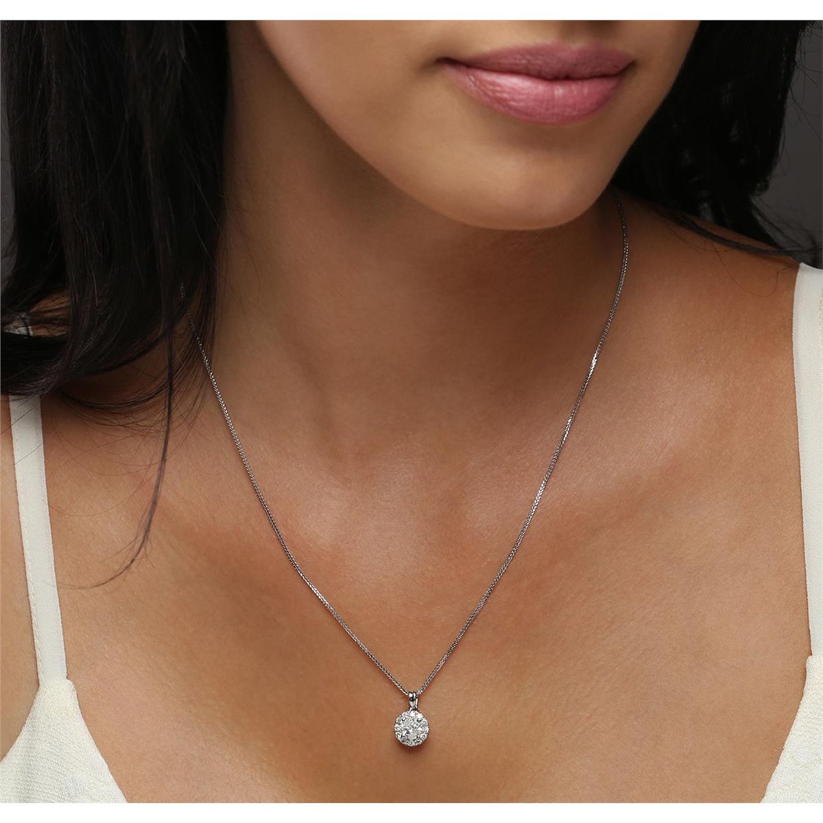 One electronically tested 14KT white gold ladies combination cast & assembled diamond pendant & chain 18.0" long, medium fancy cable with a lobster claw clasp with a bright polish finish. Identified with markings of "14K". Condition is new. Containing: One prong set round brilliant cut diamond, measuring 5.68 - 5.67 x 3.40mm (depth est.) approximate weight of 0.67ct. Clarity: I-2. Color: G, Cut is Good. Twelve prong set round brilliant cut diamonds, measuring 1.80 - 1.80 x 1.08mm (depth est.) approximate total weight of 12 Stones = 0.26ct. Clarity: SI-2 to I-2. Color: H - I, Cut is Good. All diamonds are graded in the mounting, unless otherwise stated. Total Weight of Diamonds 0.92ct. Total Weight of Pendant & Chain 2.60 grams. GGL Appraised at $5,930.00.