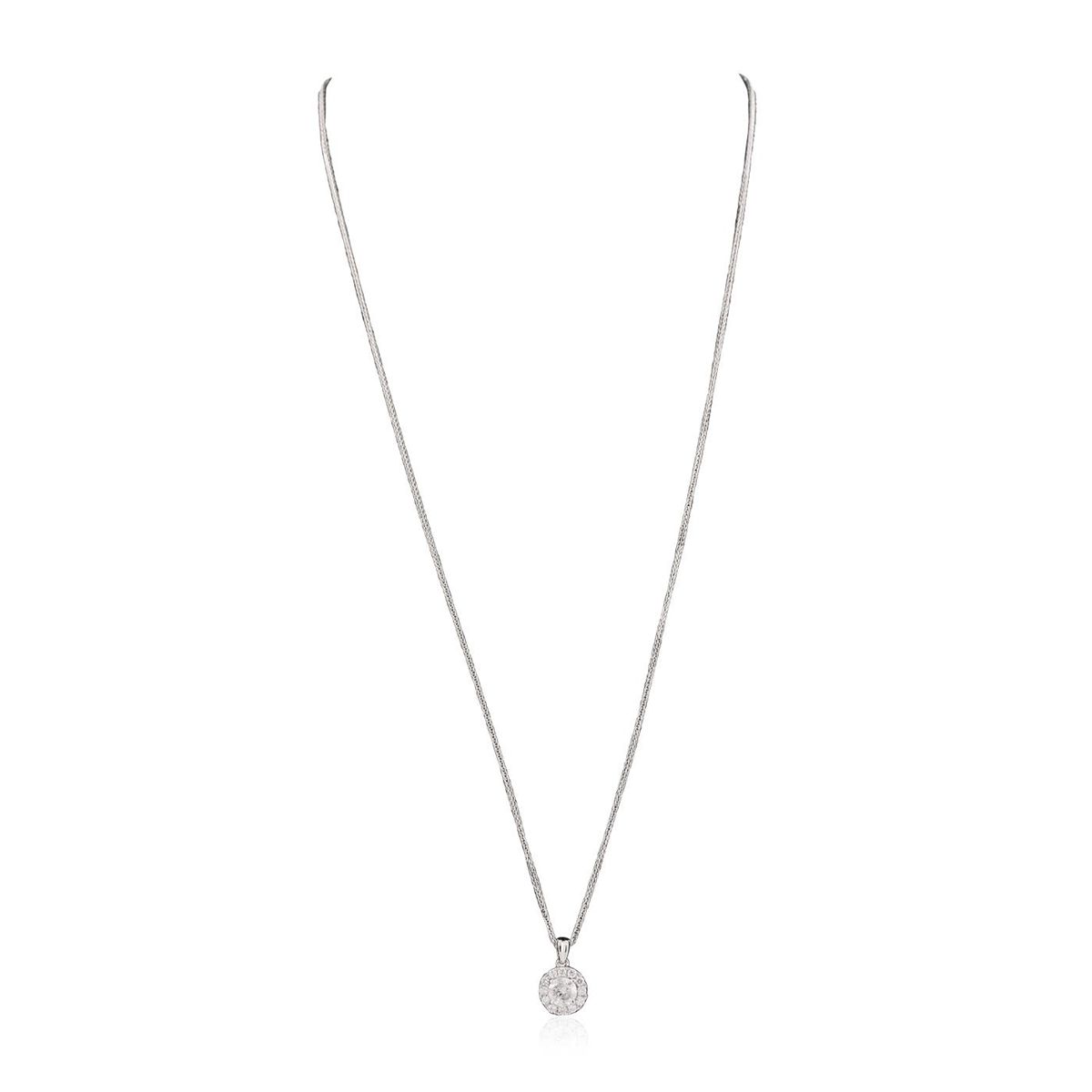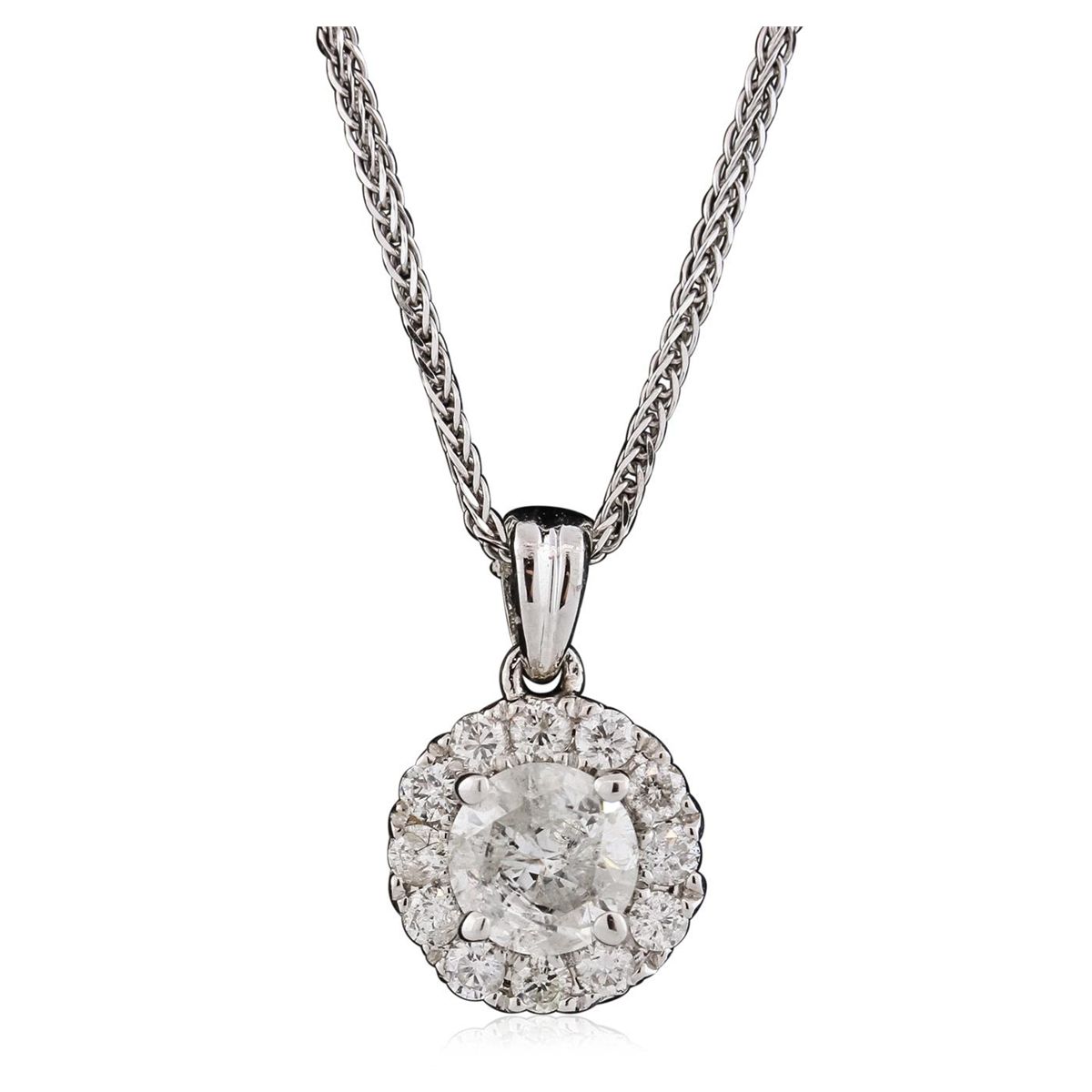 One electronically tested 14KT white gold ladies combination cast & assembled diamond pendant & chain 18.0" long, medium fancy cable with a lobster claw clasp with a bright polish finish. Identified with markings of "14K". Condition is new. Containing: One prong set round brilliant cut diamond, measuring 5.49 - 5.44 x 3.62mm (depth est.) approximate weight of 0.66ct. Clarity: I-3. Color: I, Cut is Good. Twelve prong set round brilliant cut diamonds, measuring 1.80 - 1.80 x 1.08mm (depth est.) approximate total weight of 12 Stones = 0.26ct. Clarity: SI-2 to I-2. Color: H - J, Cut is Good. All diamonds are graded in the mounting, unless otherwise stated. Total Weight of Diamonds 0.92ct. Total Weight of Pendant & Chain 2.70 grams. GGL Appraised at $3,110.00.