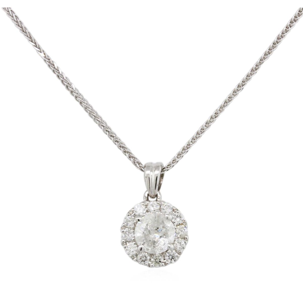 One electronically tested 14KT white gold ladies combination cast & assembled diamond pendant & chain 18.0" long, medium fancy cable with a lobster claw clasp with a bright polish finish. Identified with markings of "14K". Condition is new. Containing: One prong set round brilliant cut diamond, measuring 5.49 - 5.44 x 3.62mm (depth est.) approximate weight of 0.66ct. Clarity: I-3. Color: I, Cut is Good. Twelve prong set round brilliant cut diamonds, measuring 1.80 - 1.80 x 1.08mm (depth est.) approximate total weight of 12 Stones = 0.26ct. Clarity: SI-2 to I-2. Color: H - J, Cut is Good. All diamonds are graded in the mounting, unless otherwise stated. Total Weight of Diamonds 0.92ct. Total Weight of Pendant & Chain 2.70 grams. GGL Appraised at $3,110.00.