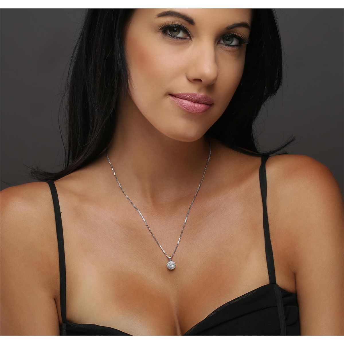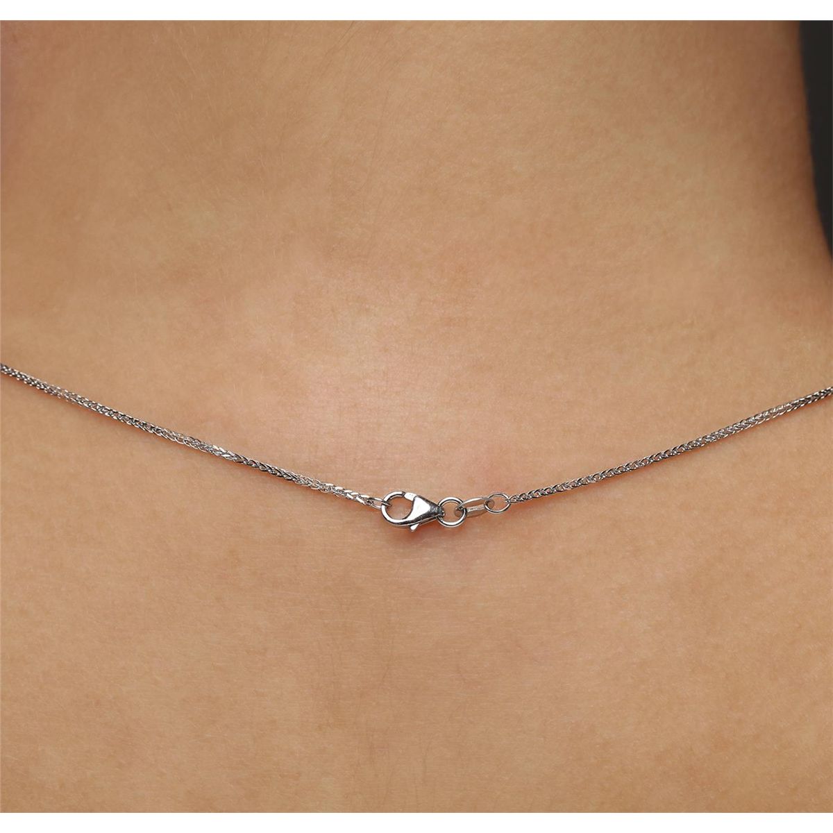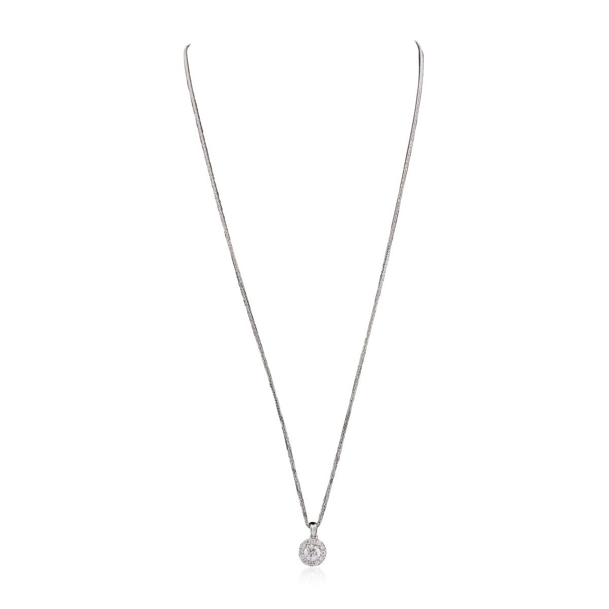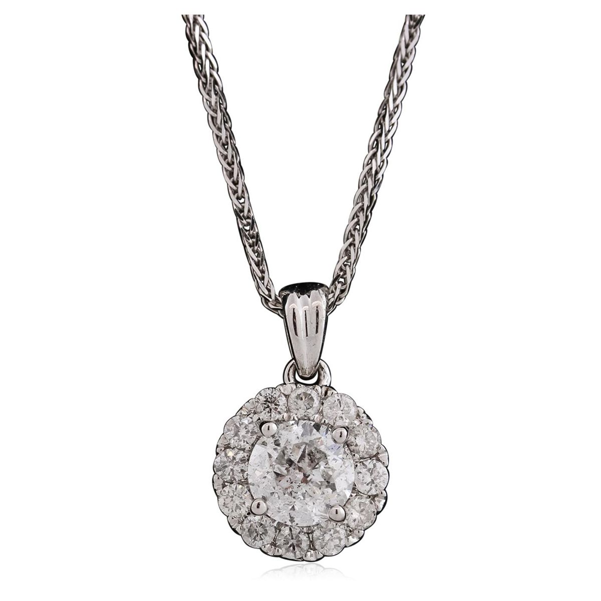 One electronically tested 14KT white gold ladies combination cast & assembled diamond pendant & chain 18.0" long, medium fancy cable with a lobster claw clasp with a bright polish finish. Identified with markings of "14K". Condition is new. Containing: One prong set round brilliant cut diamond, measuring 5.53 - 5.52 x 3.60mm (depth est.) approximate weight of 0.67ct. Clarity: I-3. Color: G, Cut is Good. Twelve prong set round brilliant cut diamonds, measuring 1.80 - 1.80 x 1.08mm (depth est.) approximate total weight of 12 Stones = 0.26ct. Clarity: SI-2 to I-2. Color: H - J, Cut is Good. All diamonds are graded in the mounting, unless otherwise stated. Total Weight of Diamonds 0.93ct. Total Weight of Pendant & Chain 2.70 grams. GGL Appraised at $3,345.00.