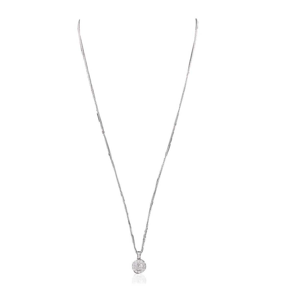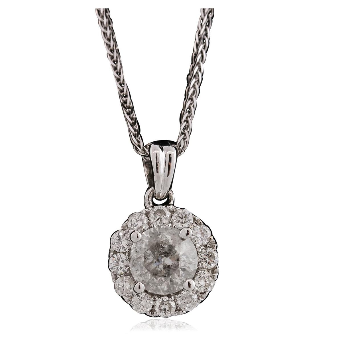 One electronically tested 14KT white gold ladies combination cast & assembled diamond pendant & chain 18.0" long, medium fancy cable with a lobster claw clasp with a bright polish finish. Identified with markings of "14K". Condition is new. Containing: One prong set round brilliant cut diamond, measuring 5.63 - 5.58 x 3.52mm (depth est.) approximate weight of 0.68ct. Clarity: I-3. Color: G, Cut is Good. Twelve prong set round brilliant cut diamonds, measuring 1.80 - 1.80 x 1.08mm (depth est.) approximate total weight of 12 Stones = 0.26ct. Clarity: SI-2 to I-2. Color: H - J, Cut is Good. All diamonds are graded in the mounting, unless otherwise stated. Total Weight of Diamonds 0.93ct. Total Weight of Pendant & Chain 2.70 grams. GGL Appraised at $3,355.00.