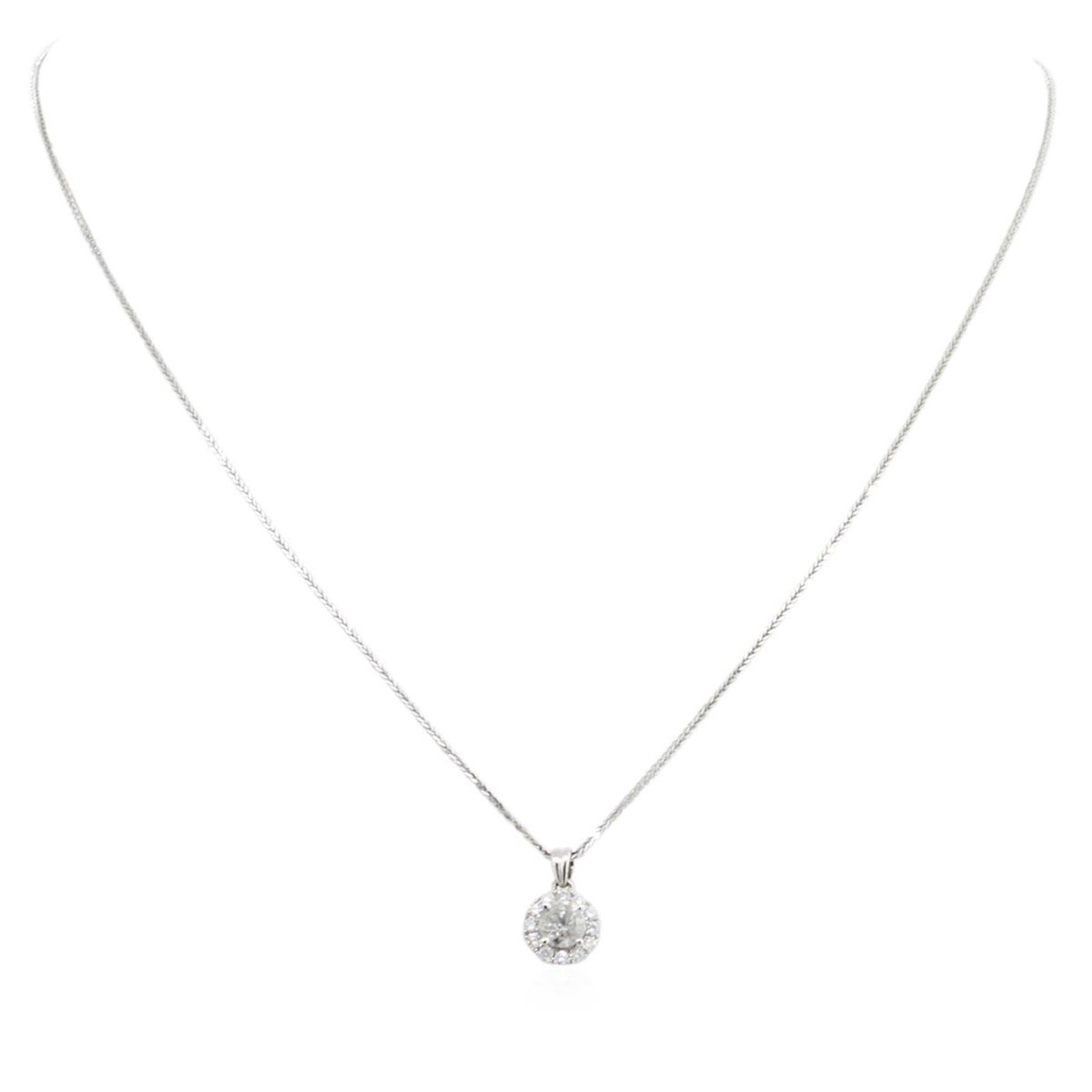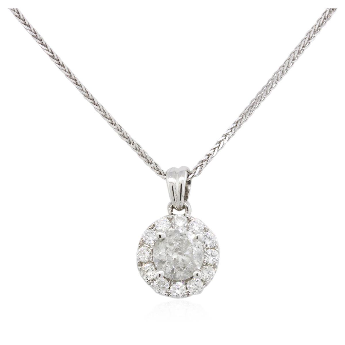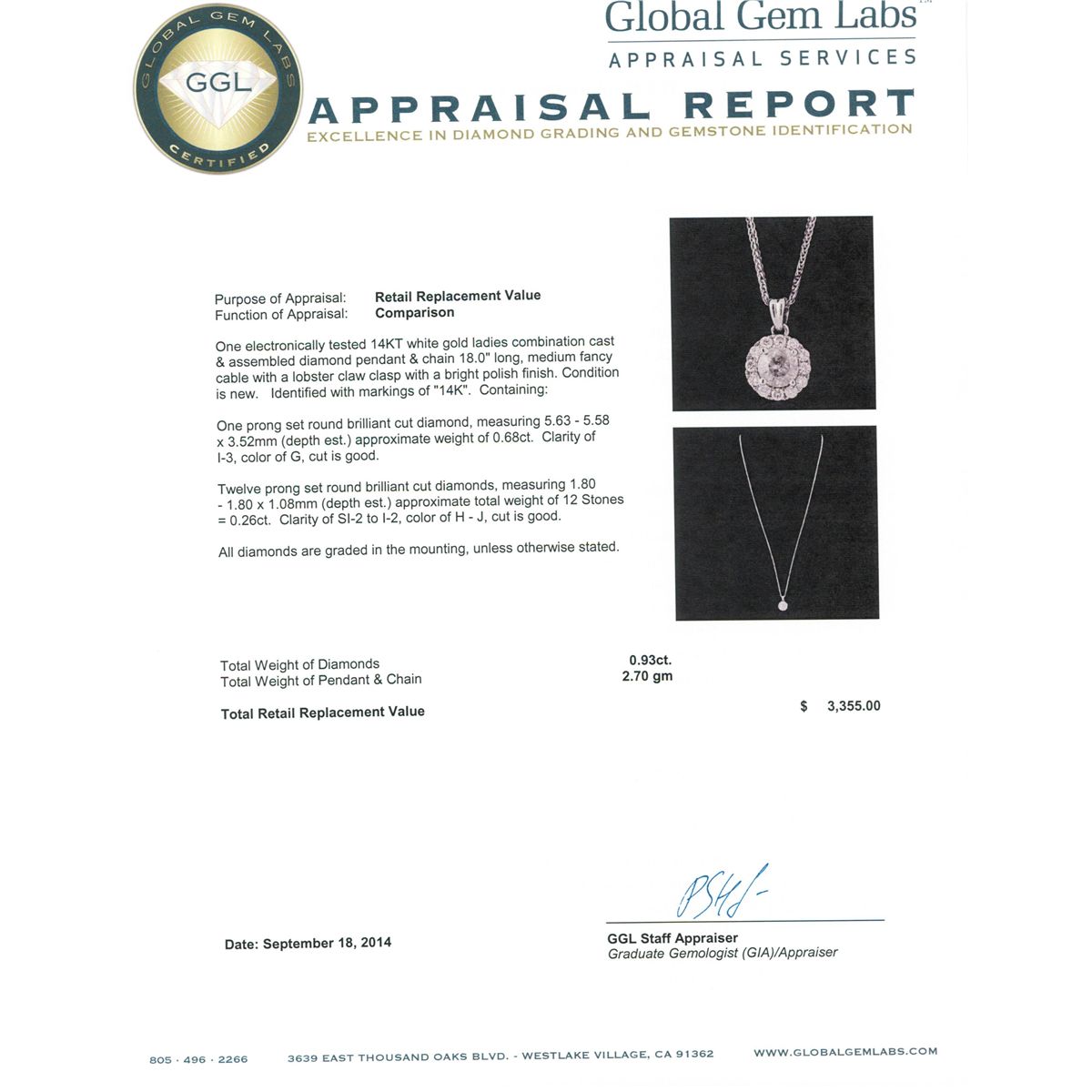 One electronically tested 14KT white gold ladies combination cast & assembled diamond pendant & chain 18.0" long, medium fancy cable with a lobster claw clasp with a bright polish finish. Identified with markings of "14K". Condition is new. Containing: One prong set round brilliant cut diamond, measuring 5.63 - 5.58 x 3.52mm (depth est.) approximate weight of 0.68ct. Clarity: I-3. Color: G, Cut is Good. Twelve prong set round brilliant cut diamonds, measuring 1.80 - 1.80 x 1.08mm (depth est.) approximate total weight of 12 Stones = 0.26ct. Clarity: SI-2 to I-2. Color: H - J, Cut is Good. All diamonds are graded in the mounting, unless otherwise stated. Total Weight of Diamonds 0.93ct. Total Weight of Pendant & Chain 2.70 grams. GGL Appraised at $3,355.00.