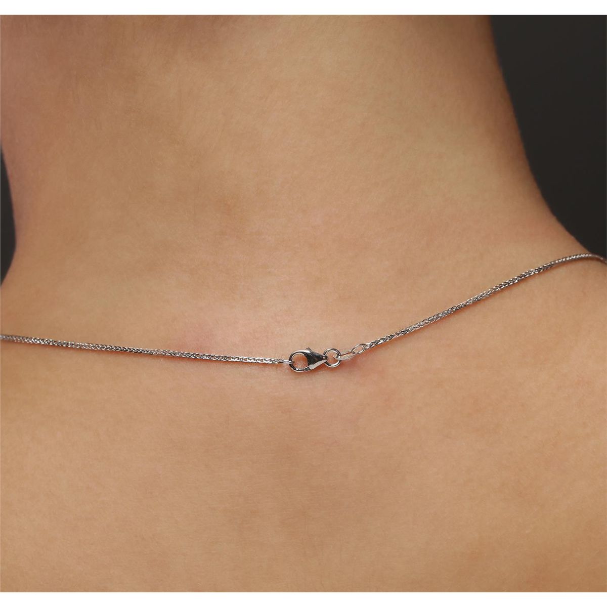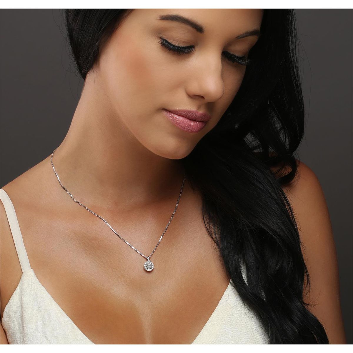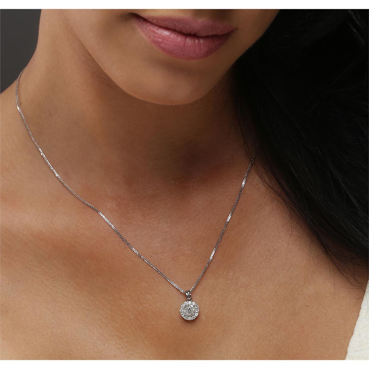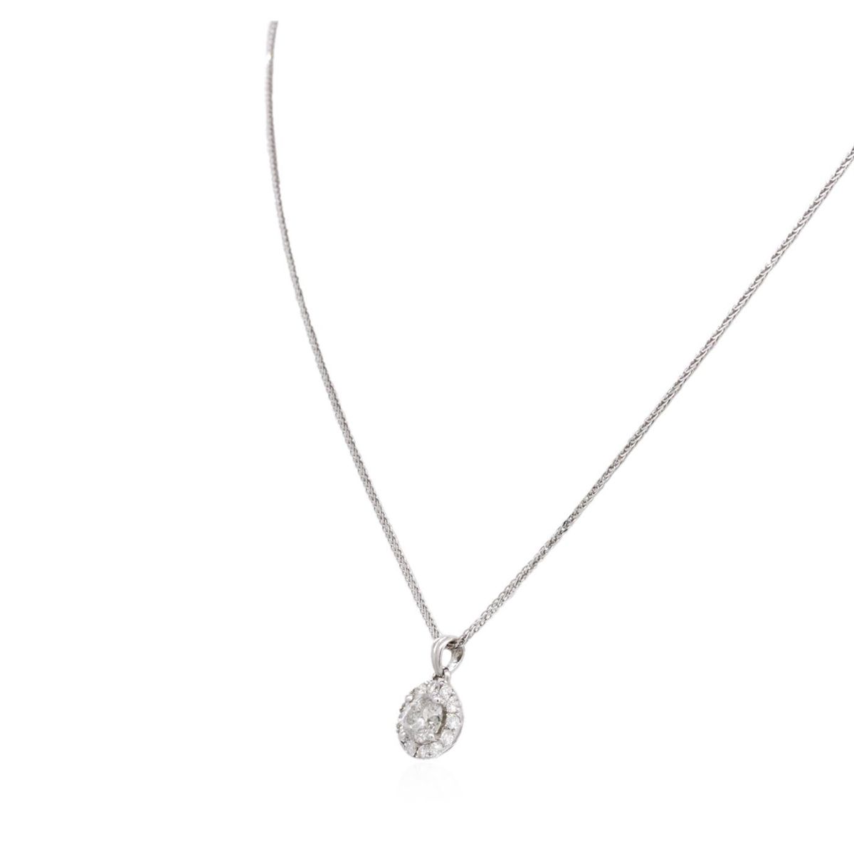 One electronically tested 14KT white gold ladies combination cast & assembled diamond pendant & chain 18.0" long, medium fancy cable with a lobster claw clasp with a bright polish finish. Identified with markings of "14K". Condition is new. Containing: One prong set round brilliant cut diamond, measuring 5.63 - 5.58 x 3.52mm (depth est.) approximate weight of 0.68ct. Clarity: I-3. Color: G, Cut is Good. Twelve prong set round brilliant cut diamonds, measuring 1.80 - 1.80 x 1.08mm (depth est.) approximate total weight of 12 Stones = 0.26ct. Clarity: SI-2 to I-2. Color: H - J, Cut is Good. All diamonds are graded in the mounting, unless otherwise stated. Total Weight of Diamonds 0.93ct. Total Weight of Pendant & Chain 2.70 grams. GGL Appraised at $3,355.00.