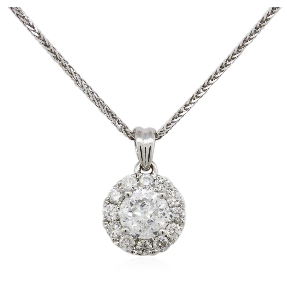 One electronically tested 14KT white gold ladies combination cast & assembled diamond pendant & chain 18.0" long, medium fancy cable with a lobster claw clasp with a bright polish finish. Identified with markings of "14K". Condition is new. Containing: One prong set round brilliant cut diamond, measuring 5.53 - 5.52 x 3.60mm (depth est.) approximate weight of 0.67ct. Clarity: I-3. Color: G, Cut is Good. Twelve prong set round brilliant cut diamonds, measuring 1.80 - 1.80 x 1.08mm (depth est.) approximate total weight of 12 Stones = 0.26ct. Clarity: SI-2 to I-2. Color: H - J, Cut is Good. All diamonds are graded in the mounting, unless otherwise stated. Total Weight of Diamonds 0.93ct. Total Weight of Pendant & Chain 2.70 grams. GGL Appraised at $3,345.00.