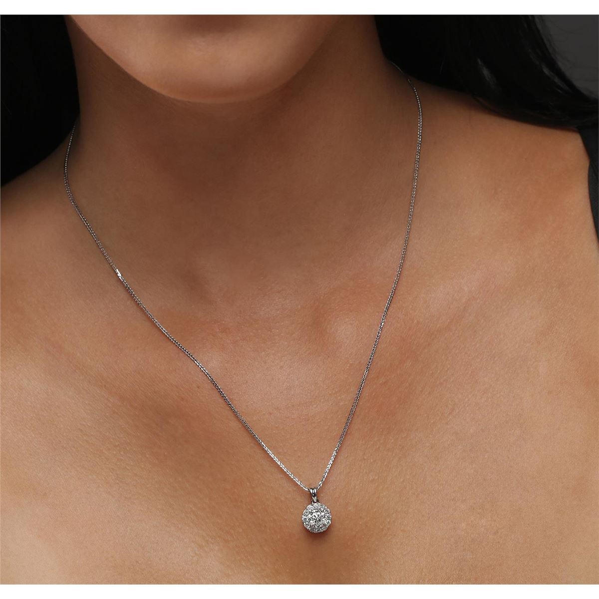 One electronically tested 14KT white gold ladies combination cast & assembled diamond pendant & chain 18.0" long, medium fancy cable with a lobster claw clasp with a bright polish finish. Identified with markings of "14K". Condition is new. Containing: One prong set round brilliant cut diamond, measuring 5.53 - 5.52 x 3.60mm (depth est.) approximate weight of 0.67ct. Clarity: I-3. Color: G, Cut is Good. Twelve prong set round brilliant cut diamonds, measuring 1.80 - 1.80 x 1.08mm (depth est.) approximate total weight of 12 Stones = 0.26ct. Clarity: SI-2 to I-2. Color: H - J, Cut is Good. All diamonds are graded in the mounting, unless otherwise stated. Total Weight of Diamonds 0.93ct. Total Weight of Pendant & Chain 2.70 grams. GGL Appraised at $3,345.00.