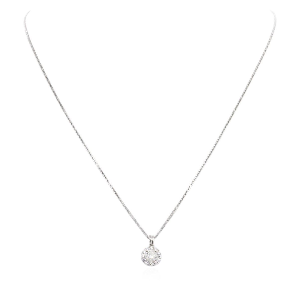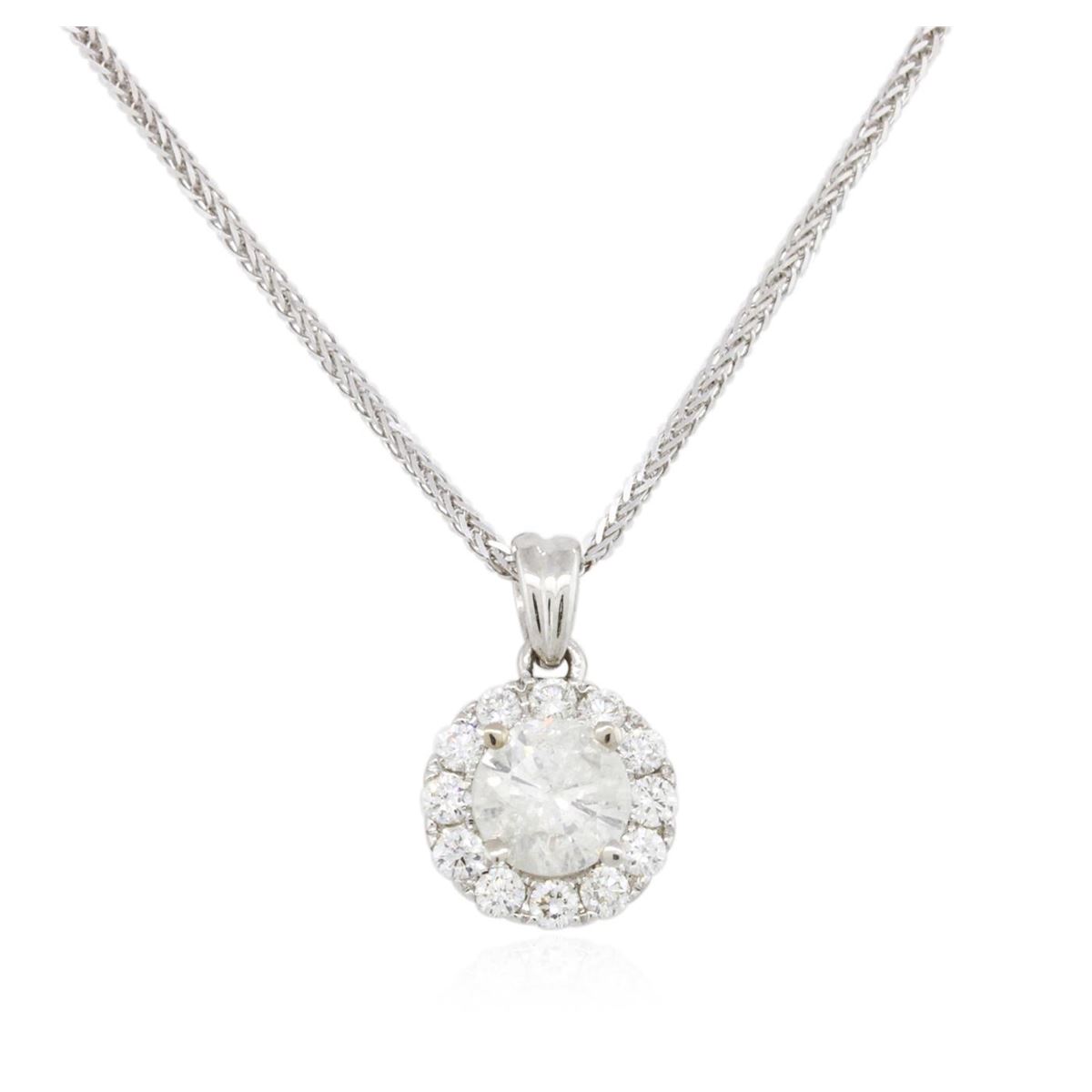 One electronically tested 14KT white gold ladies combination cast & assembled diamond pendant & chain 18.0" long, medium fancy cable with a lobster claw clasp with a bright polish finish. Identified with markings of "14K". Condition is new. Containing: One prong set round brilliant cut diamond, measuring 5.64 - 5.62 x 3.54mm (depth est.) approximate weight of 0.68ct. Clarity: I-3. Color: I, Cut is Good. Twelve prong set round brilliant cut diamonds, measuring 1.80 - 1.80 x 1.08mm (depth est.) approximate total weight of 12 Stones = 0.26ct. Clarity: SI-2 to I-2. Color: H - J, Cut is Good. All diamonds are graded in the mounting, unless otherwise stated. Total Weight of Diamonds 0.94ct. Total Weight of Pendant & Chain 2.70 grams. GGL Appraised at $3,165.00.